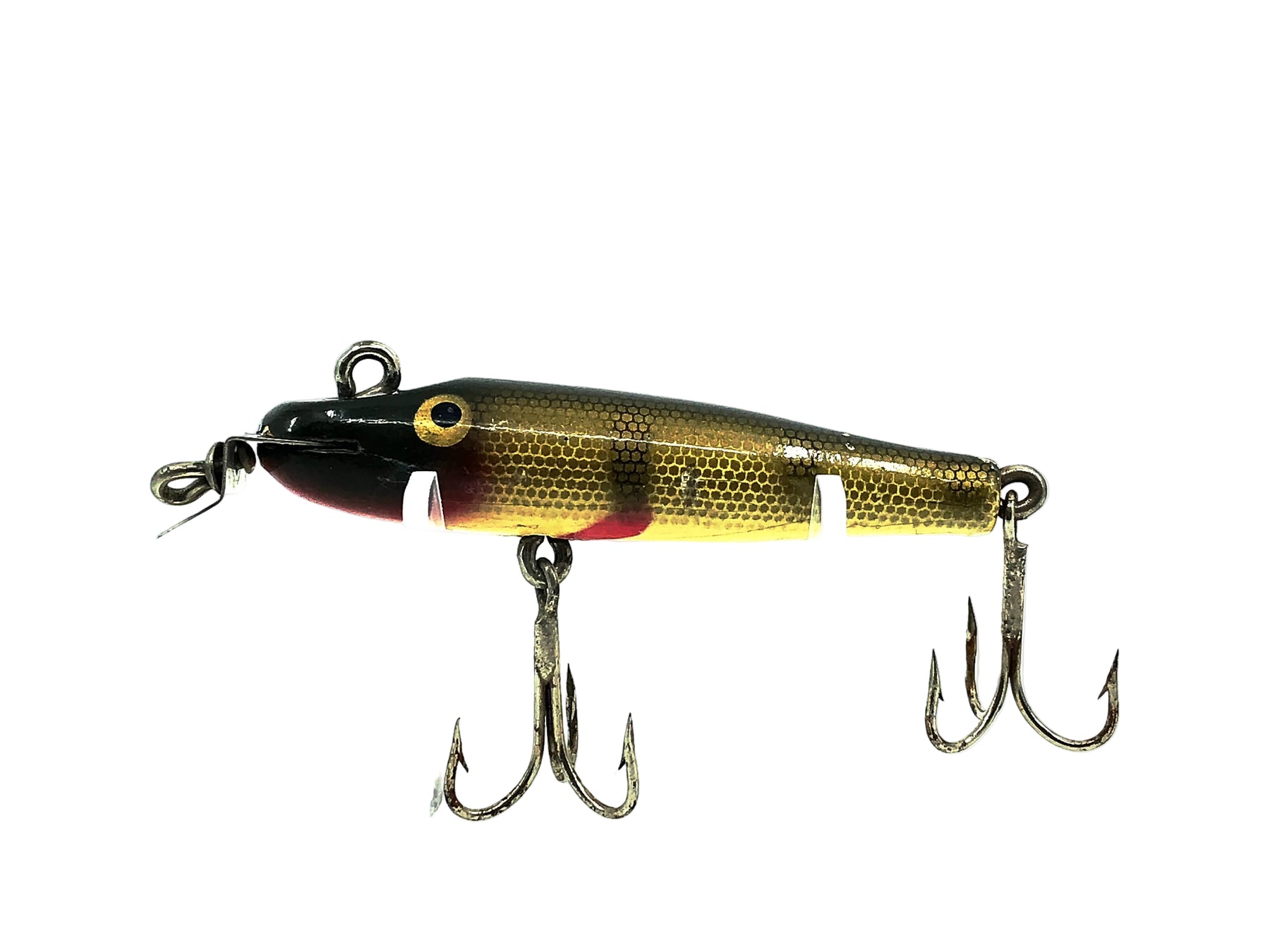 Creek Chub 2200 Midget Pikie, #01 Perch Scale Color, Early Model Double Line Tie Painted Eyes-2201. About 2 3/4" long. Vintage wooden lure with double line tie and painted eyes. The Creek Chub Midget Pikie was made from 1924-1961. They began using glass eyes in this model around 1935 (double line ties were also pre-1935) so we can date this lure to 1924-1935. Additionally it's thin profile would indicate a very early model as well. This one is vintage with some wear and marks but in overall pretty good condition, see photos. Collect or fish this great vintage lure.