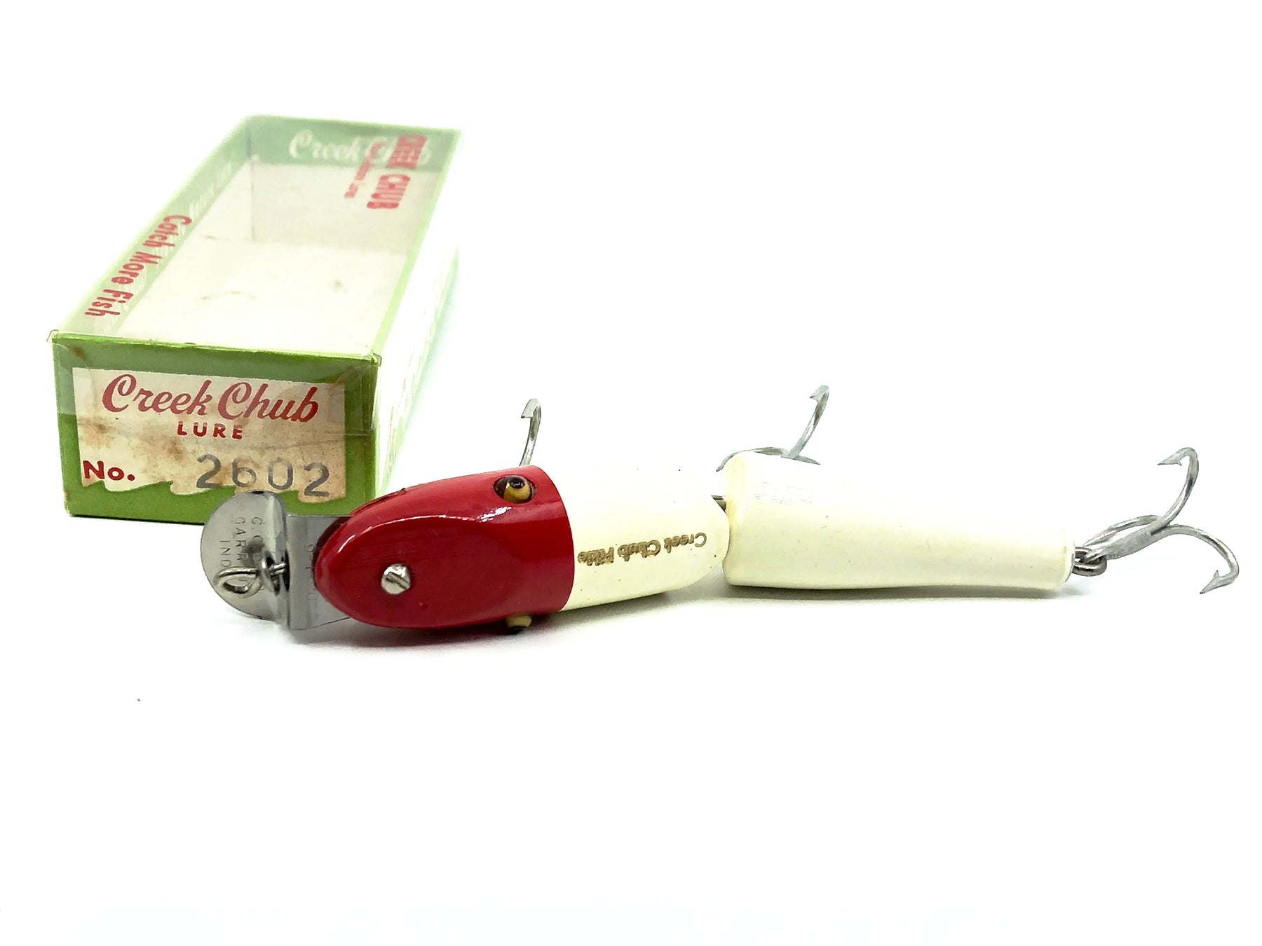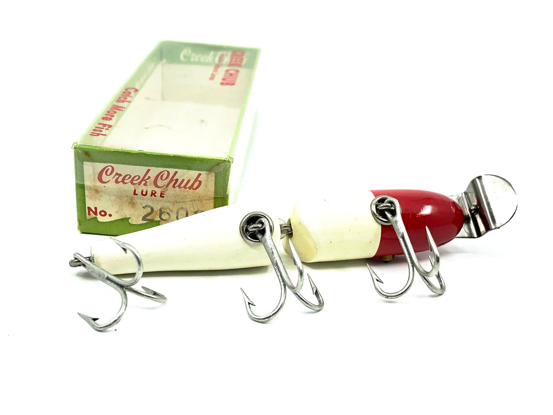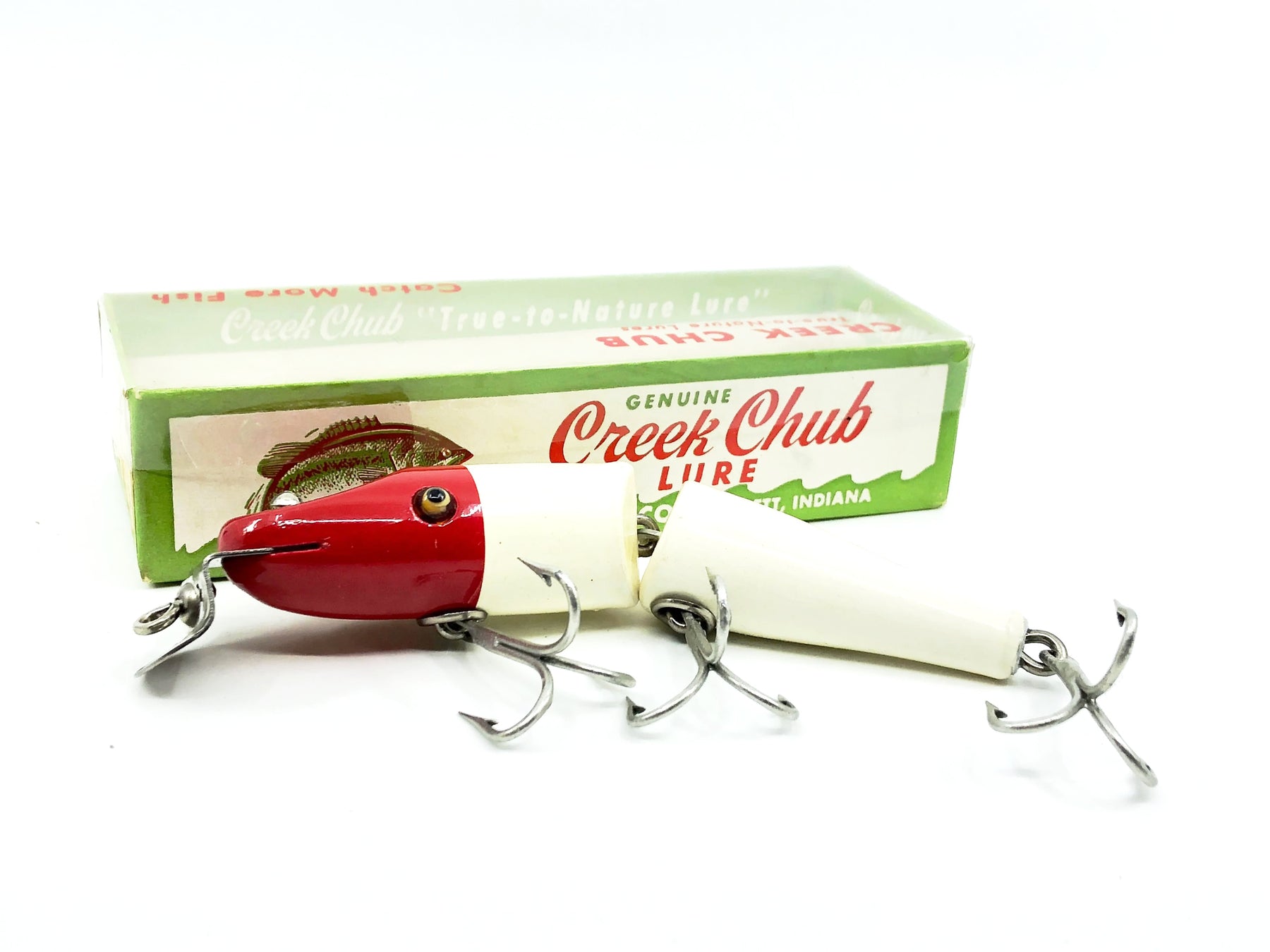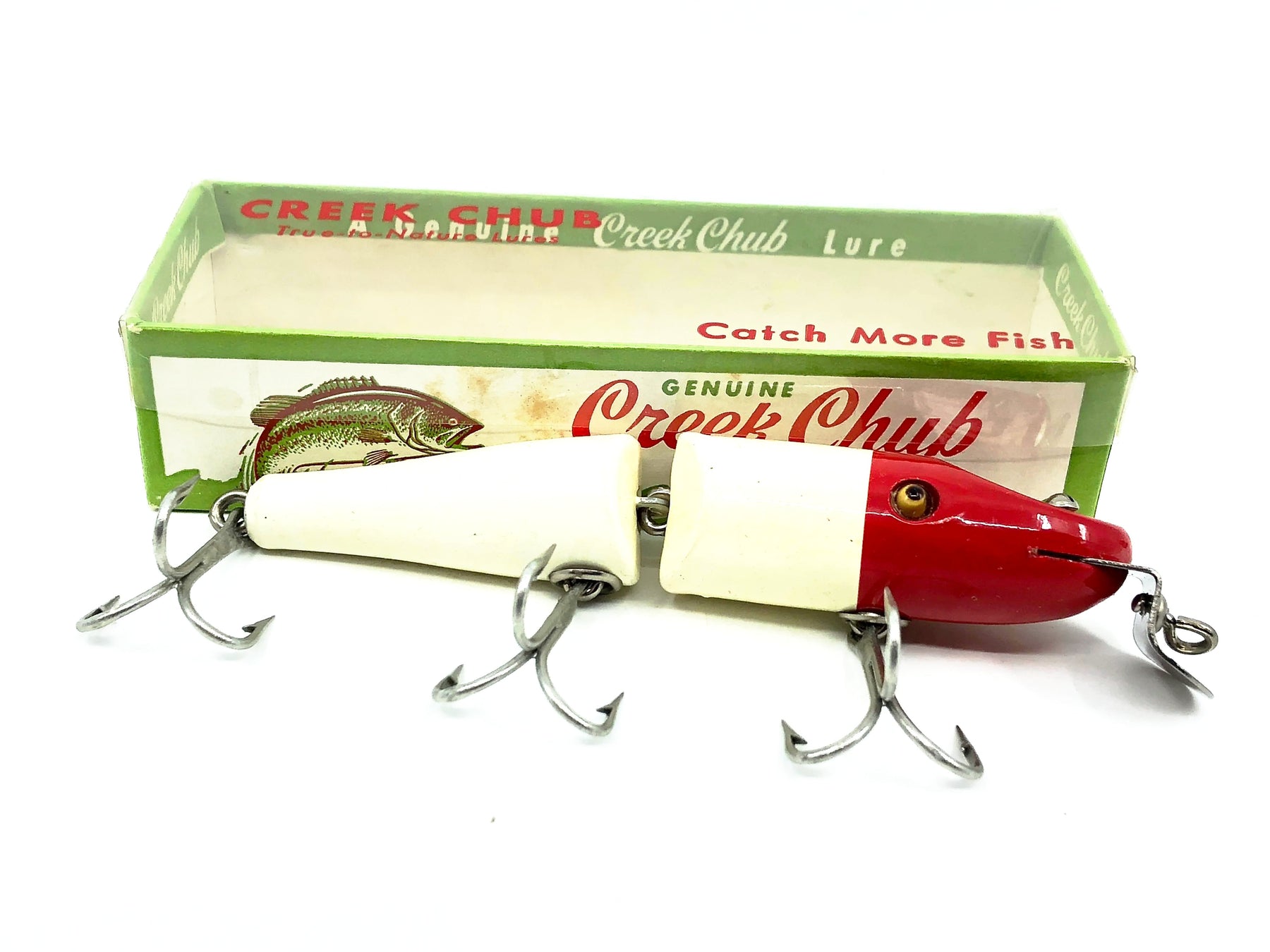 Creek Chub Jointed Pikie 2600 Red White Color 2602 with Box. About 4 1/2" long. Great vintage lure here. Wooden lure, glass eyes. Comes with matching box. Vintage lure is used with some minor wear but overall in very good shape. Box has some minor wear but overall in good shape. Nice matching combo. This one won't last long so grab it for your collection while you can. See photos.