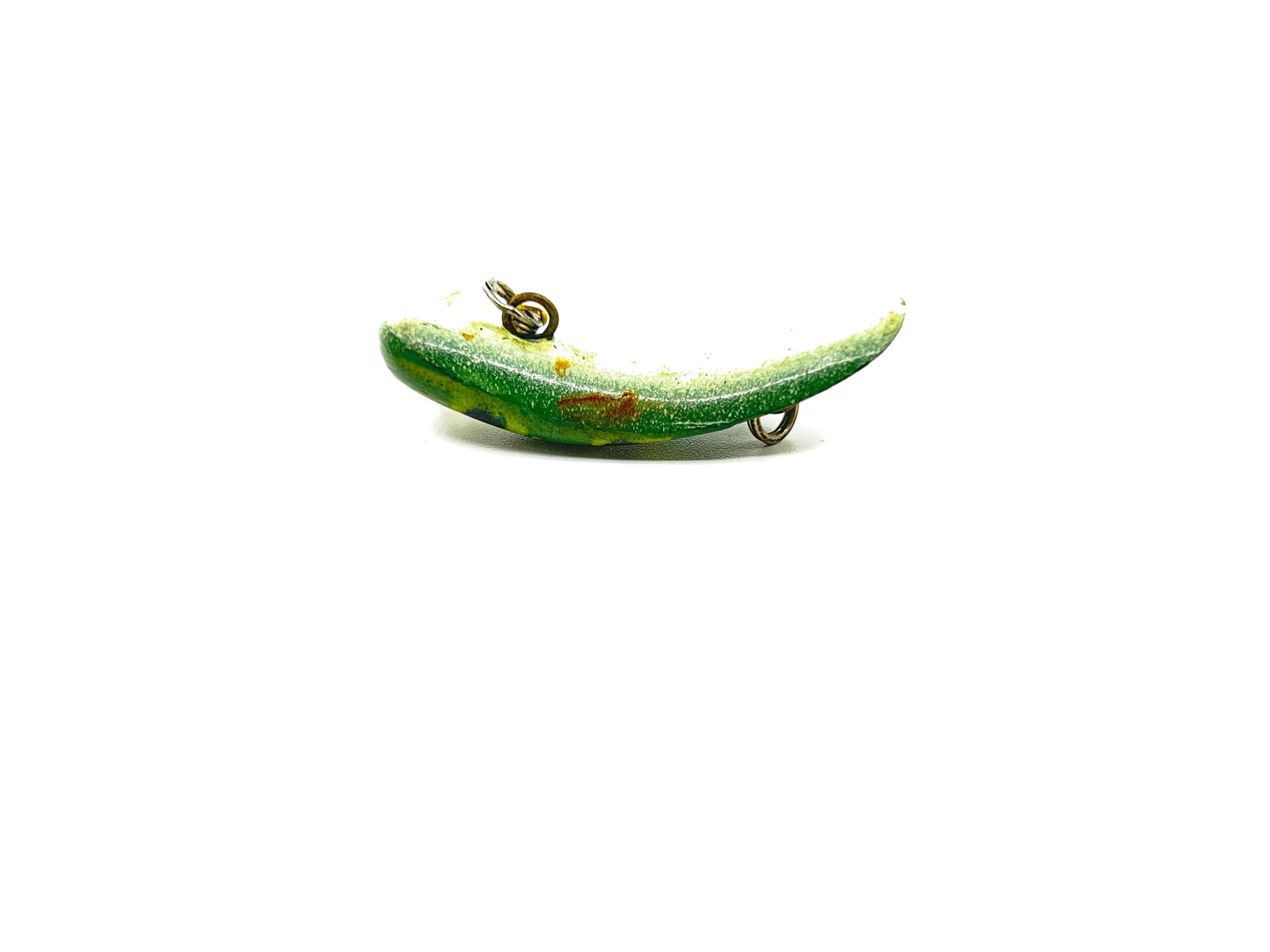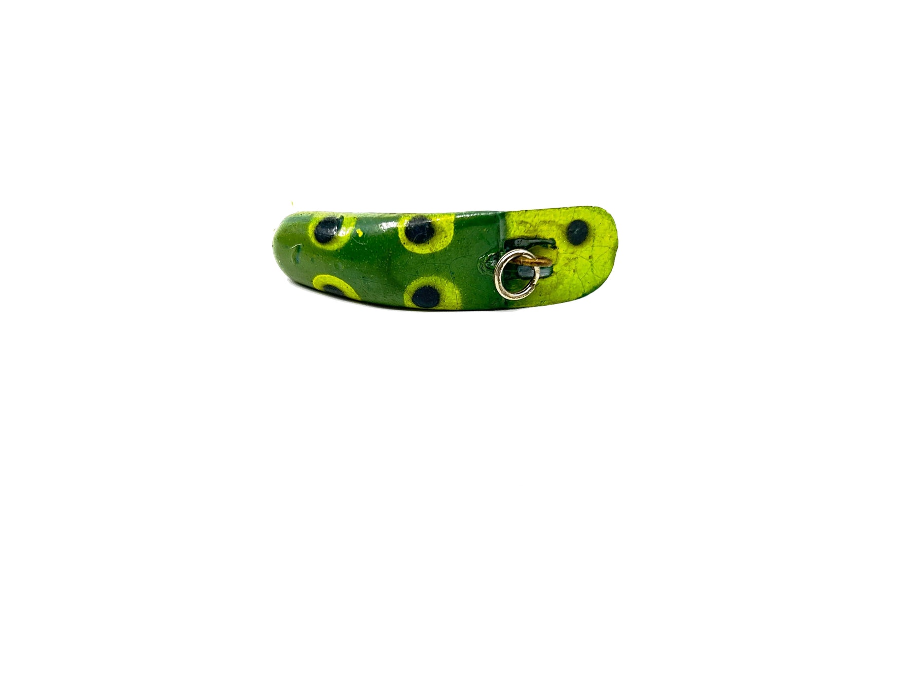 Helin Flatfish F4, Frog Color. About 1 1/2" long. Used with wear but overall in good condition, see photos. One of the most successful fishing lures ever made. Fish or collect! Vintage plastic version.