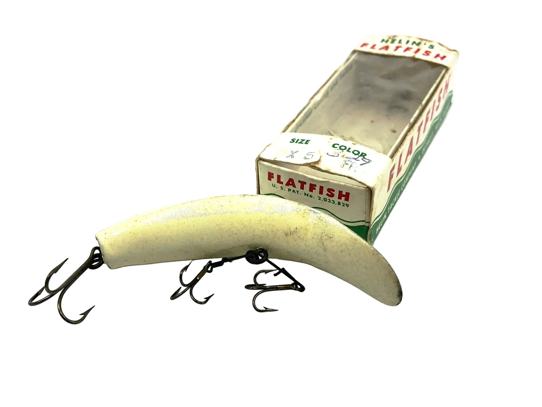 Helin Flatfish S3, PE Pearl Color w/Box. Box is a mismatch and is made for an X5. Lure is about 3 3/4" long. This used Flatfish has some minor wear and surface dirt but is in overall good condition. The box has some wear but is in ok condition, see photos. One of the most successful fishing lures ever made.  Fish or collect! Vintage plastic version.
