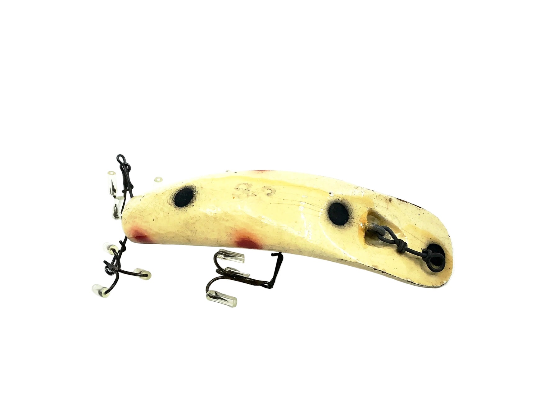 Helin Flatfish S3, WH White/Spots Color. Older wooden Flatfish. About 3 3/4" long. Used with some minor wear but in overall good condition for its age, see photos. Dual Hook hanger model. One of the most successful fishing lures ever made. Fish or collect! Usually these old wooden flatfish are in much worse condition!