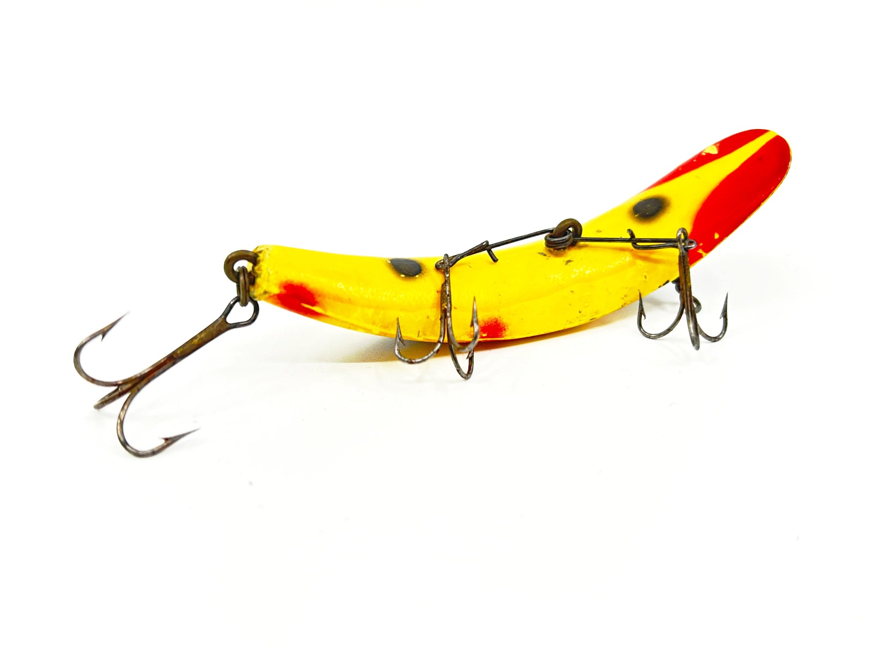 Helin Flatfish T4, Yellow with Black Stripe and Spots Color. About 3 1/2" long. Used with some wear but overall good condition, see photos. One of the most successful fishing lures ever made. Fish or collect! Vintage plastic version.