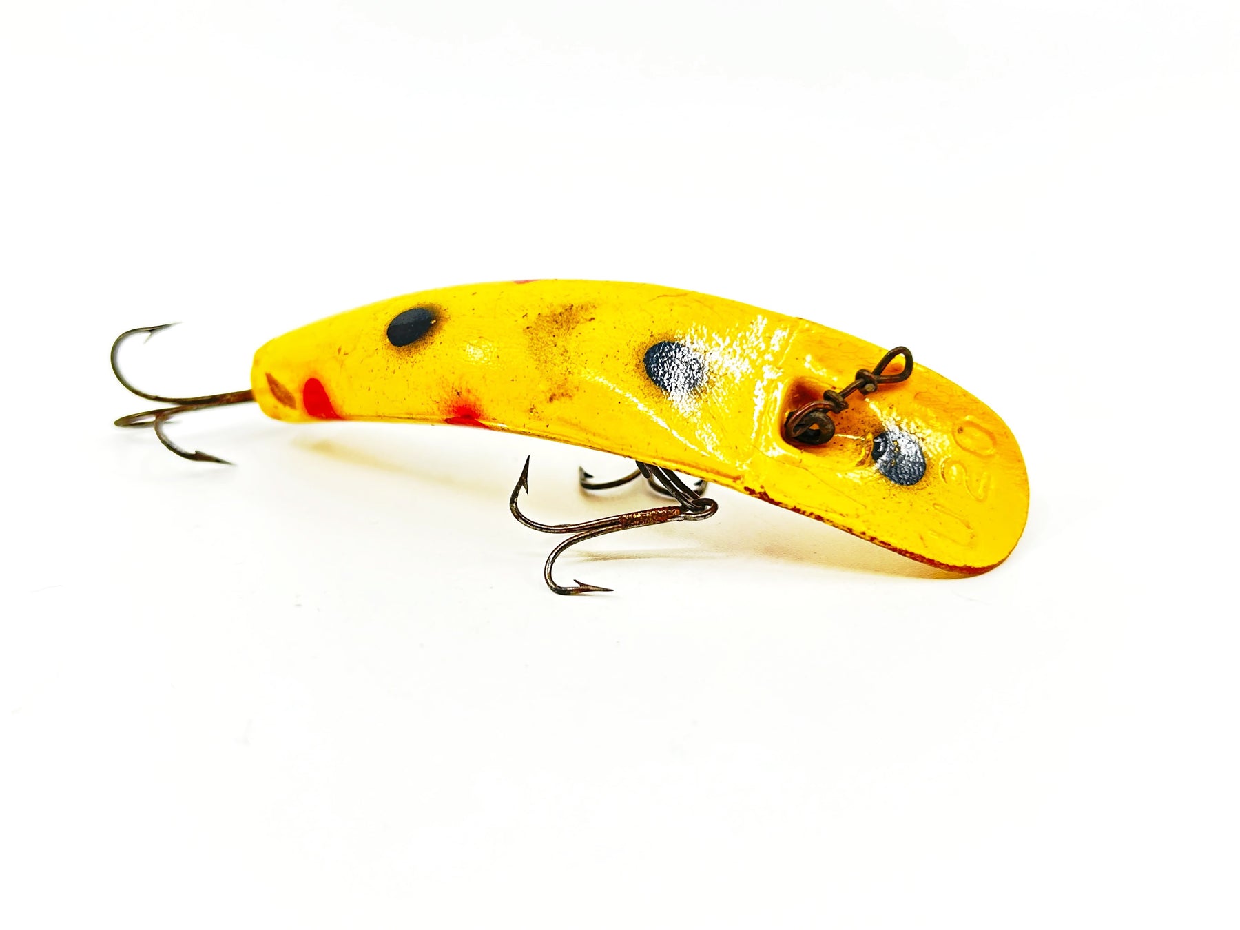 Helin Flatfish U20, Yellow with Spots Color.  About 3 1/4" long.  Used with some wear but overall good condition, see photos.  One of the most successful fishing lures ever made.  Fish or collect!  Vintage plastic version.