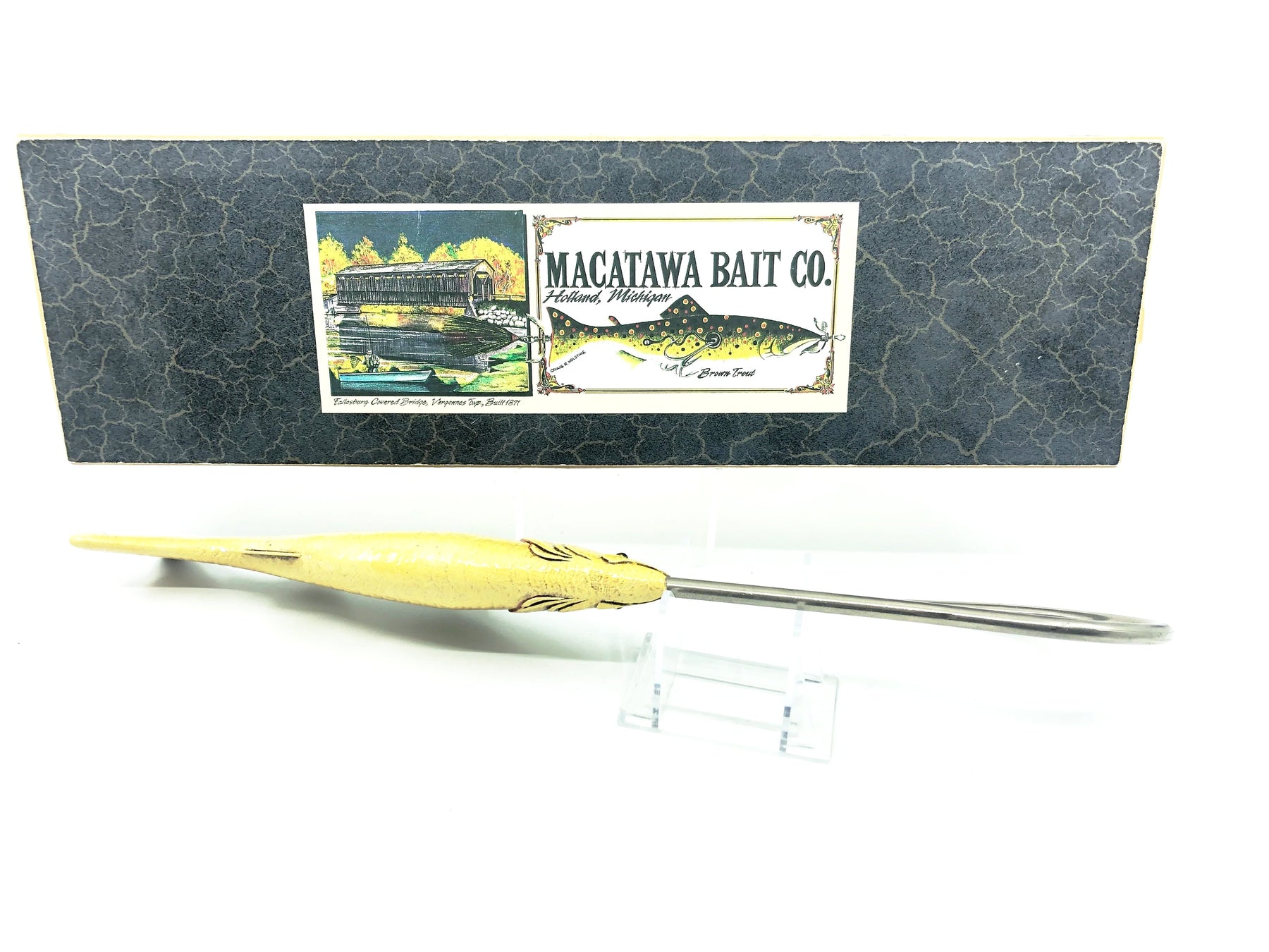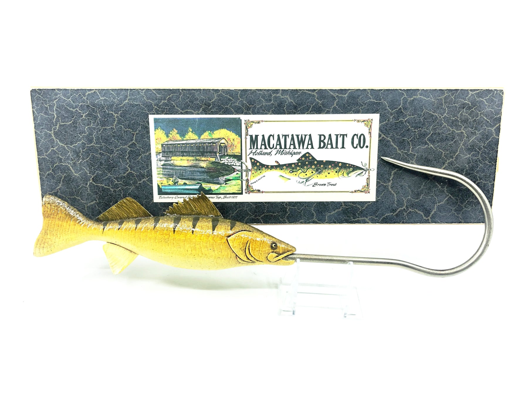 Macatawa Bait Co. Angler Grabbing Hook, Walleye/Perch w/Box. Unique Macatawa model, first one that I've seen. The hook part of this is about 5 7/8" long and the walleye or perch body is about 8" long. In total this is just under 14" long. Both the hook and the matching box are in great condition. See photos.