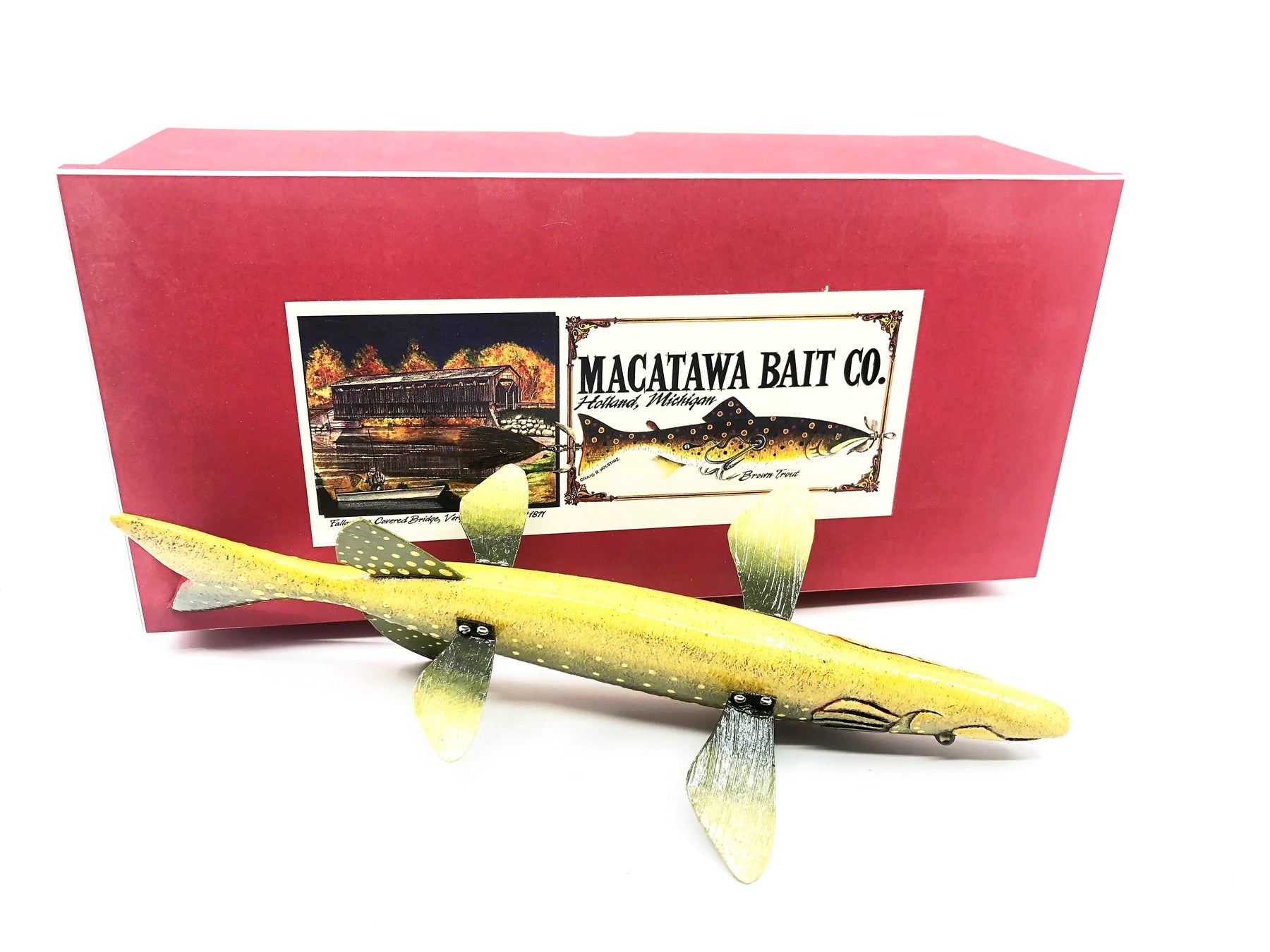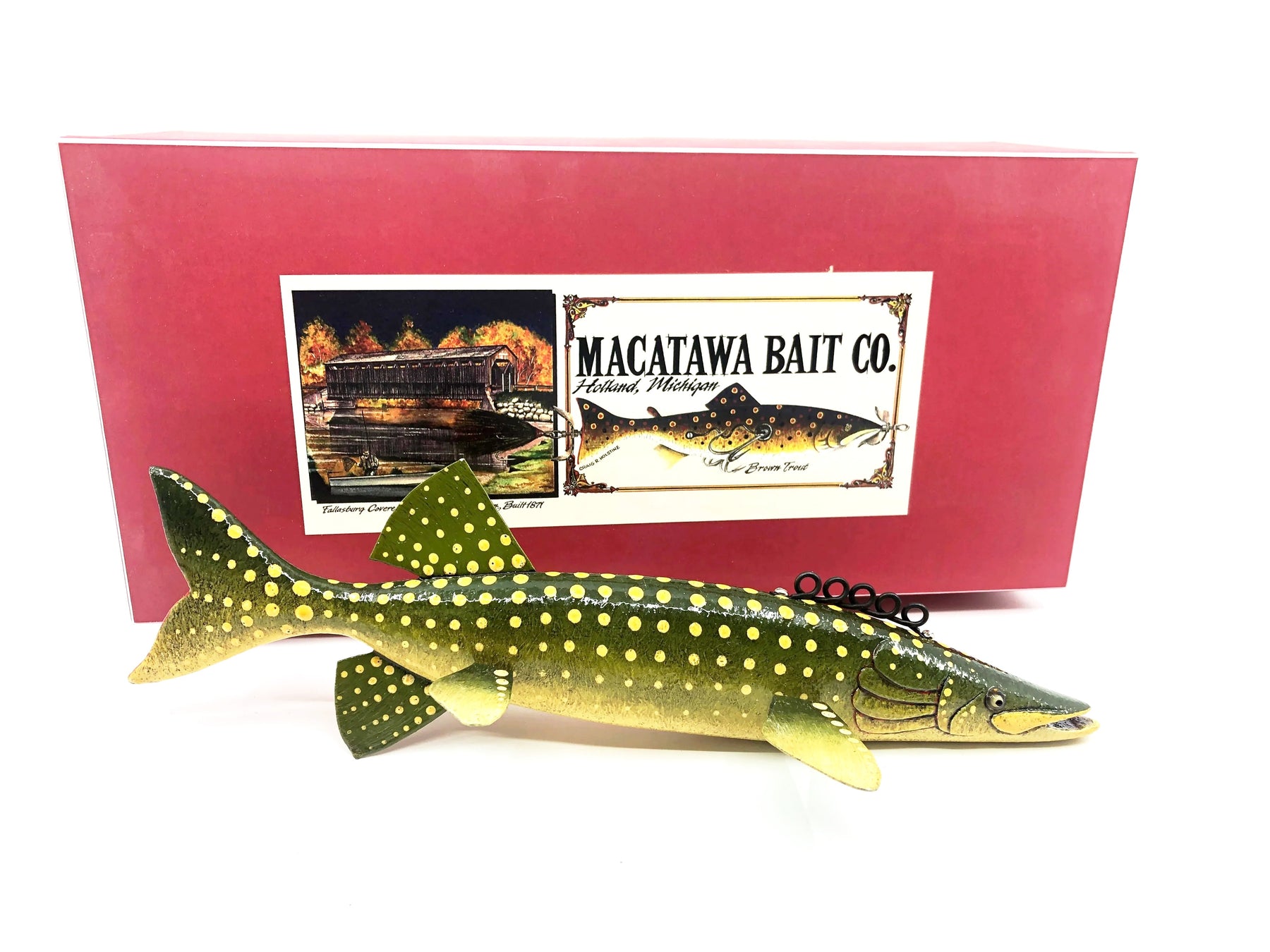 Macatawa Bait Co. Pike Decoy w/Box. This decoy comes with metal fins. Decoy is about 10" long overall. Wooden decoy, glass eyes. This pike is in amazing shape. The matching box does have some minor storage wear but is in overall good condition. This bait has been sitting in a collection for quite a few years. See photos.