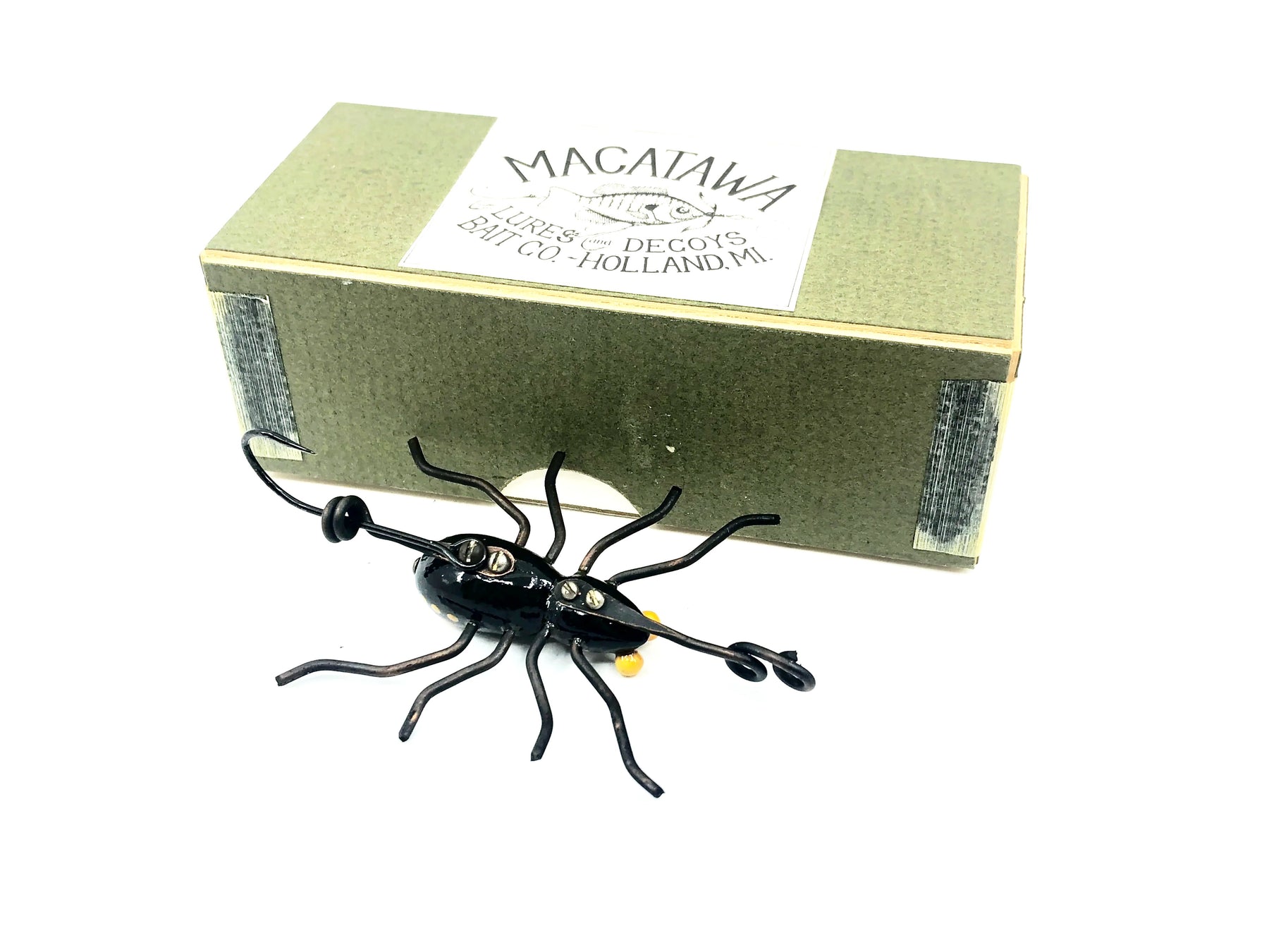 Macatawa Bait Co. Spider w/Box. Early Macatawa here and a unique model. About 3 1/4" long including the back hook and front line tie (1 5/8" long body). Wooden lure with metal works. Lure is in amazing shape. The matching box is in great condition as well with just a little minor storage wear. See photos.