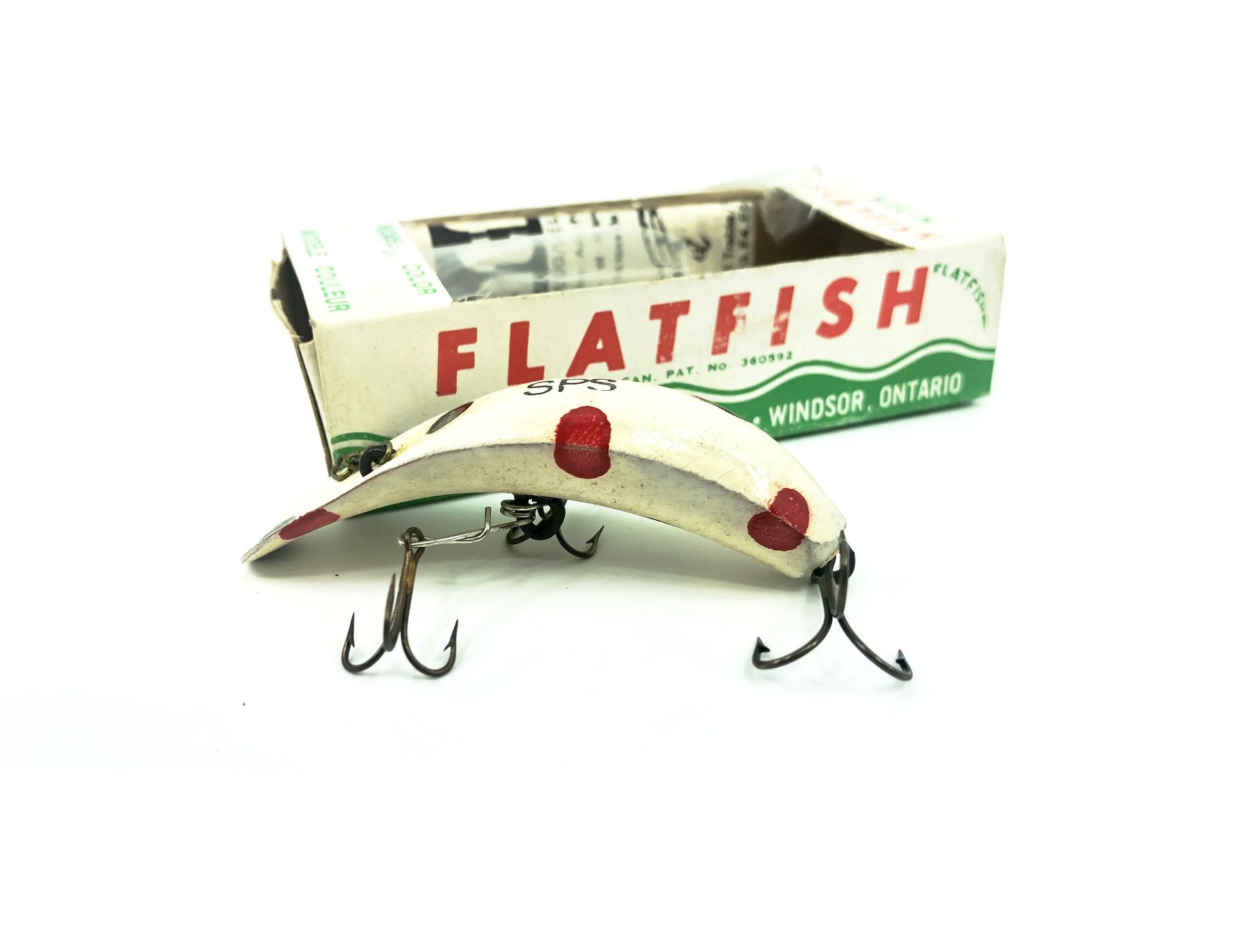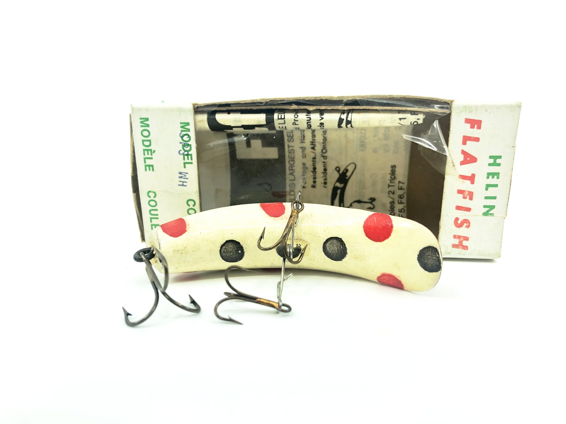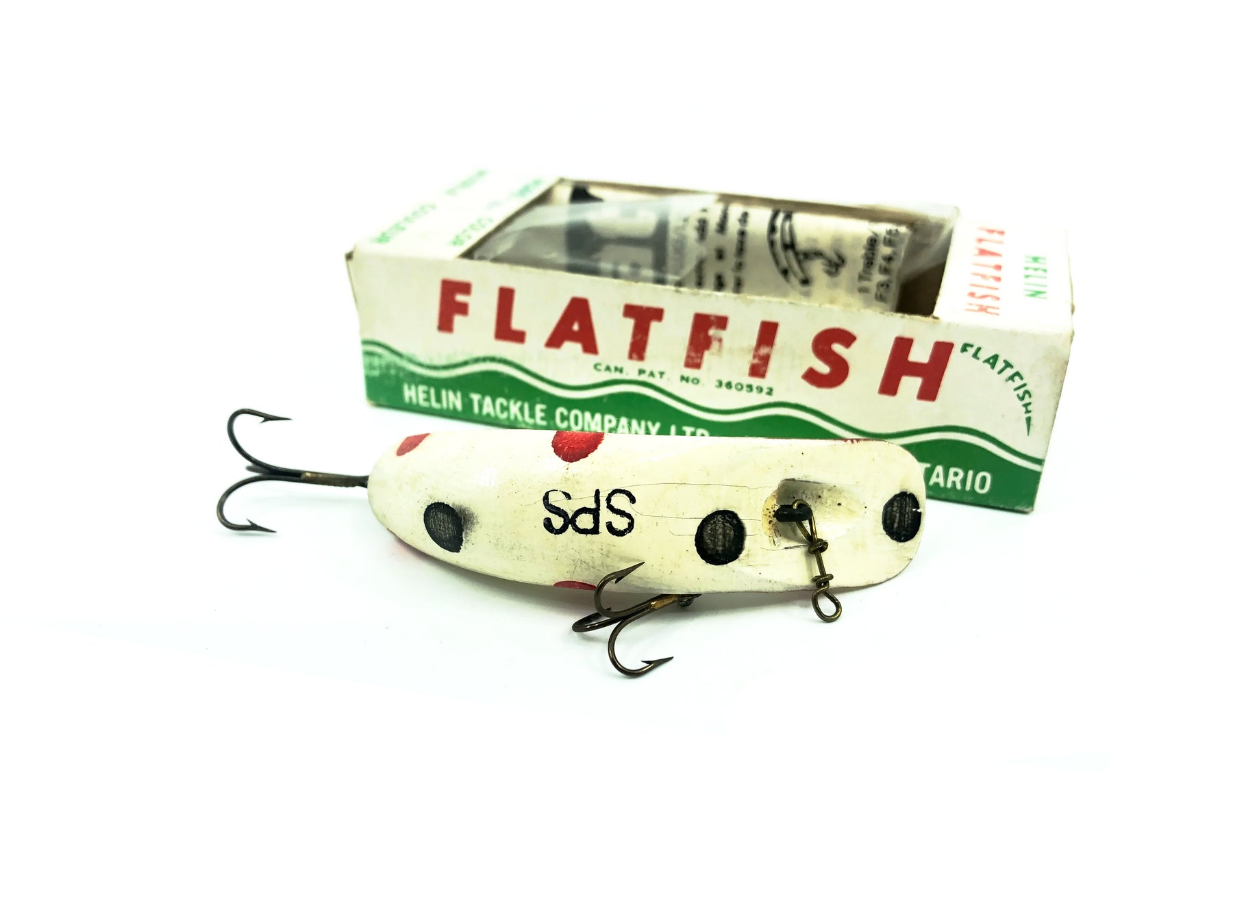 Helin Flatfish SPS, WH White/Black Red Spots Color with Box-Wooden. About 2 5/8" long. Lure is new in box, the box has some minor wear and damage to the plastic film, but otherwise in good condition. See photos. One of the most successful fishing lures ever made. Fish or collect!