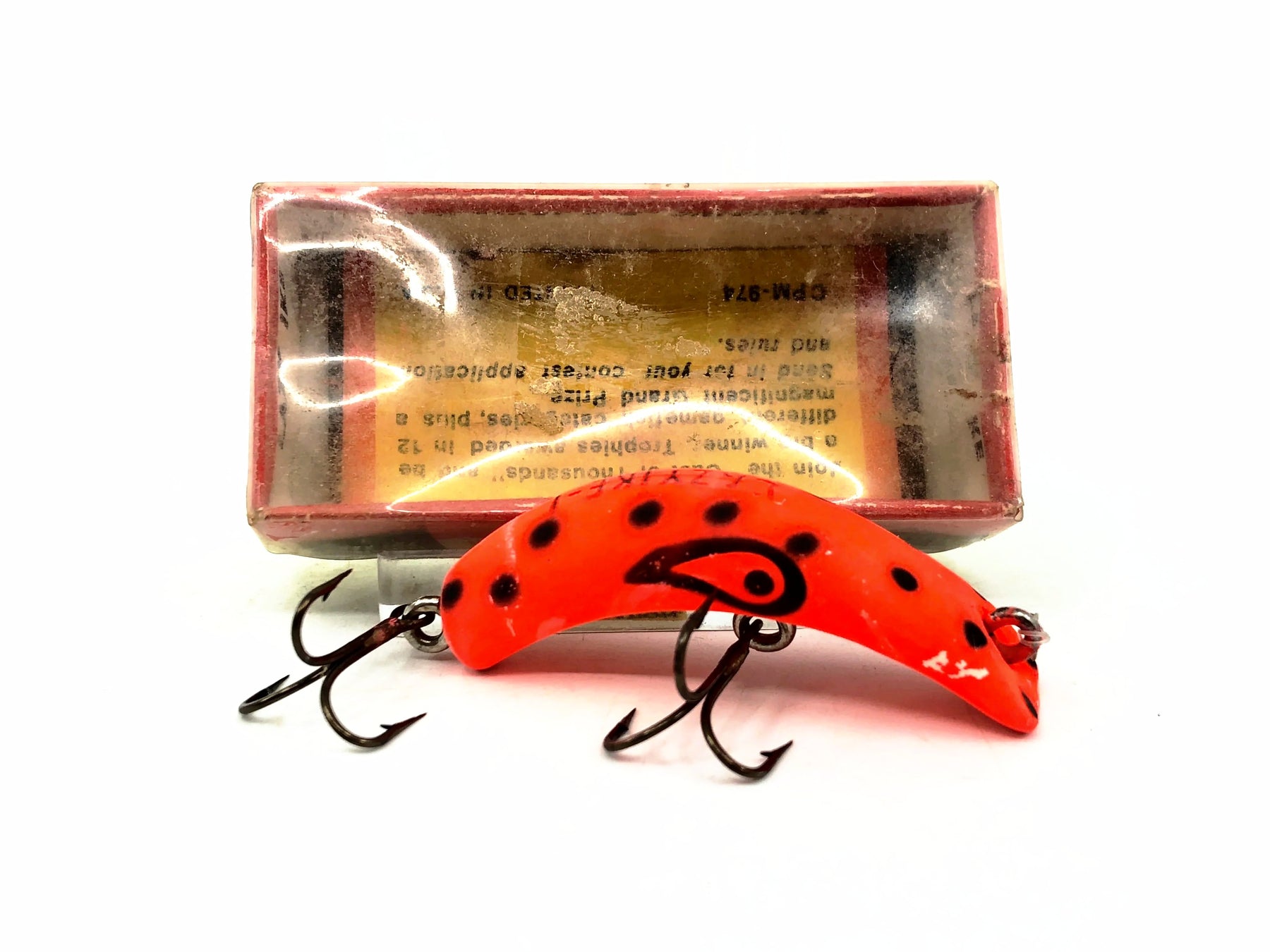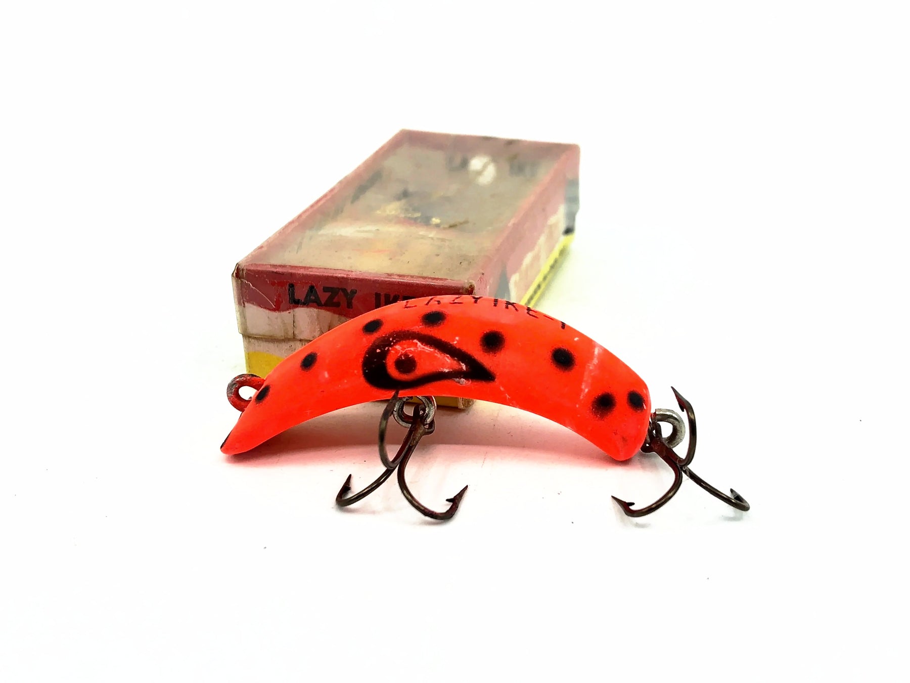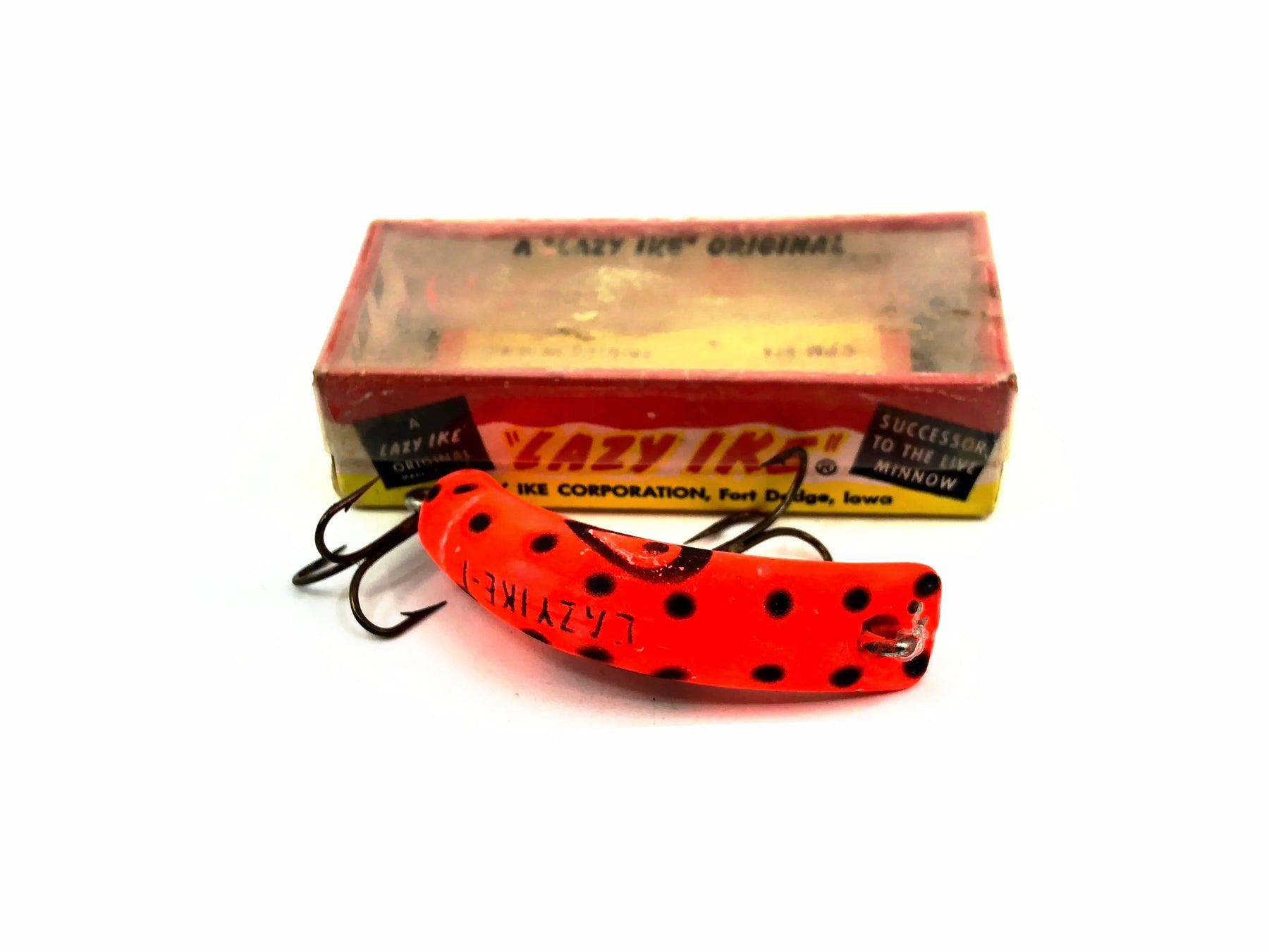 Lazy Ike KL-01 FL Fluorescent Color with Box. About 1 3/4" long. Lure is used with some minor wear but in overall good condition. Box has minor wear and marks but in overall good condition. One of the greatest all time lures. Add this one to your collection or tackle box today. Vintage plastic version dating to the 1960's.