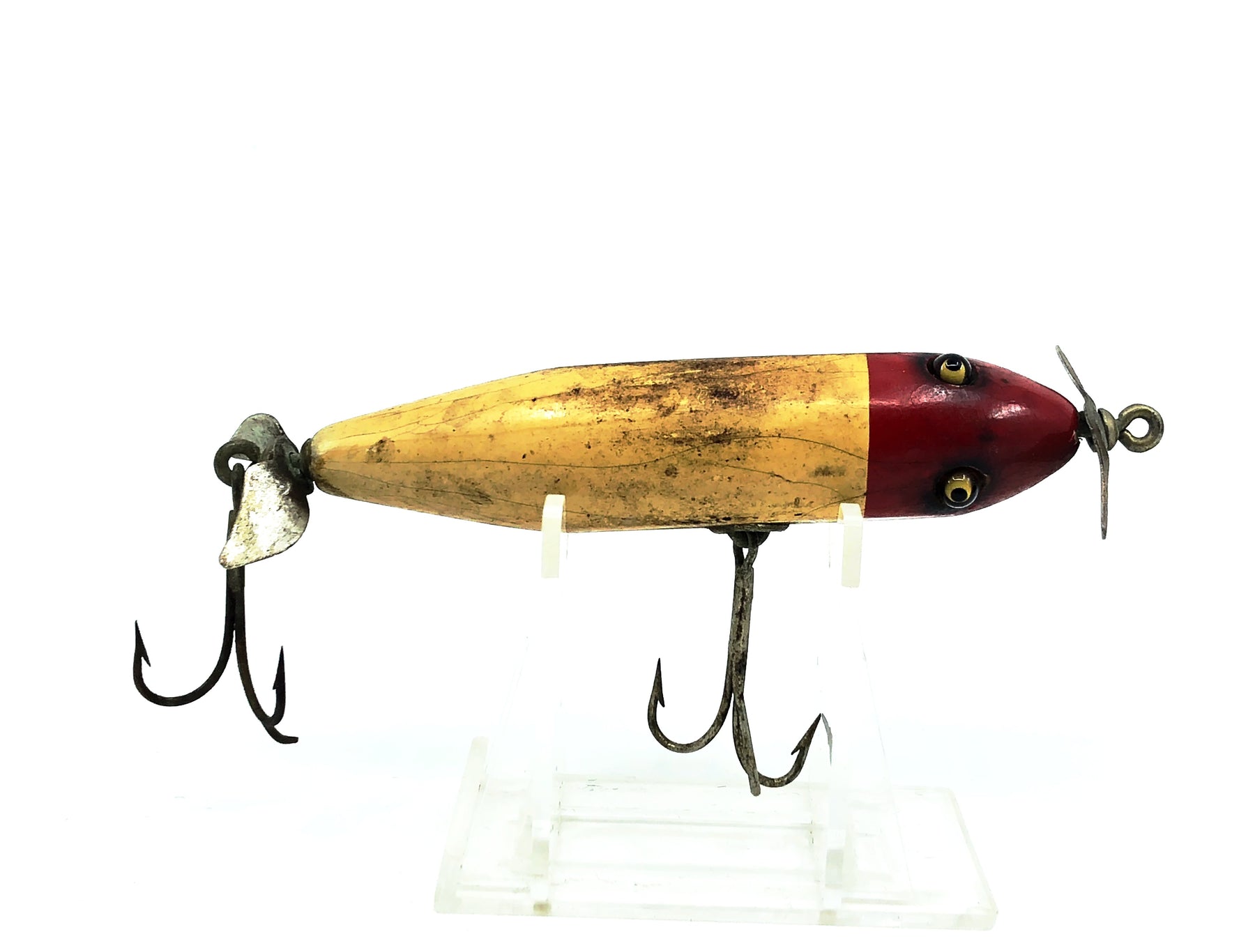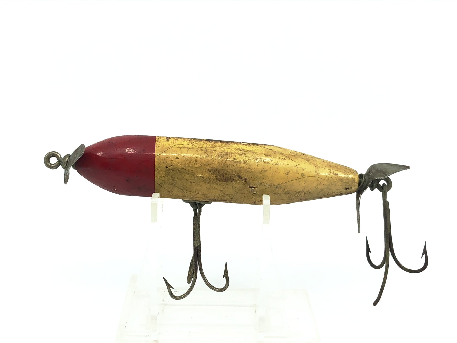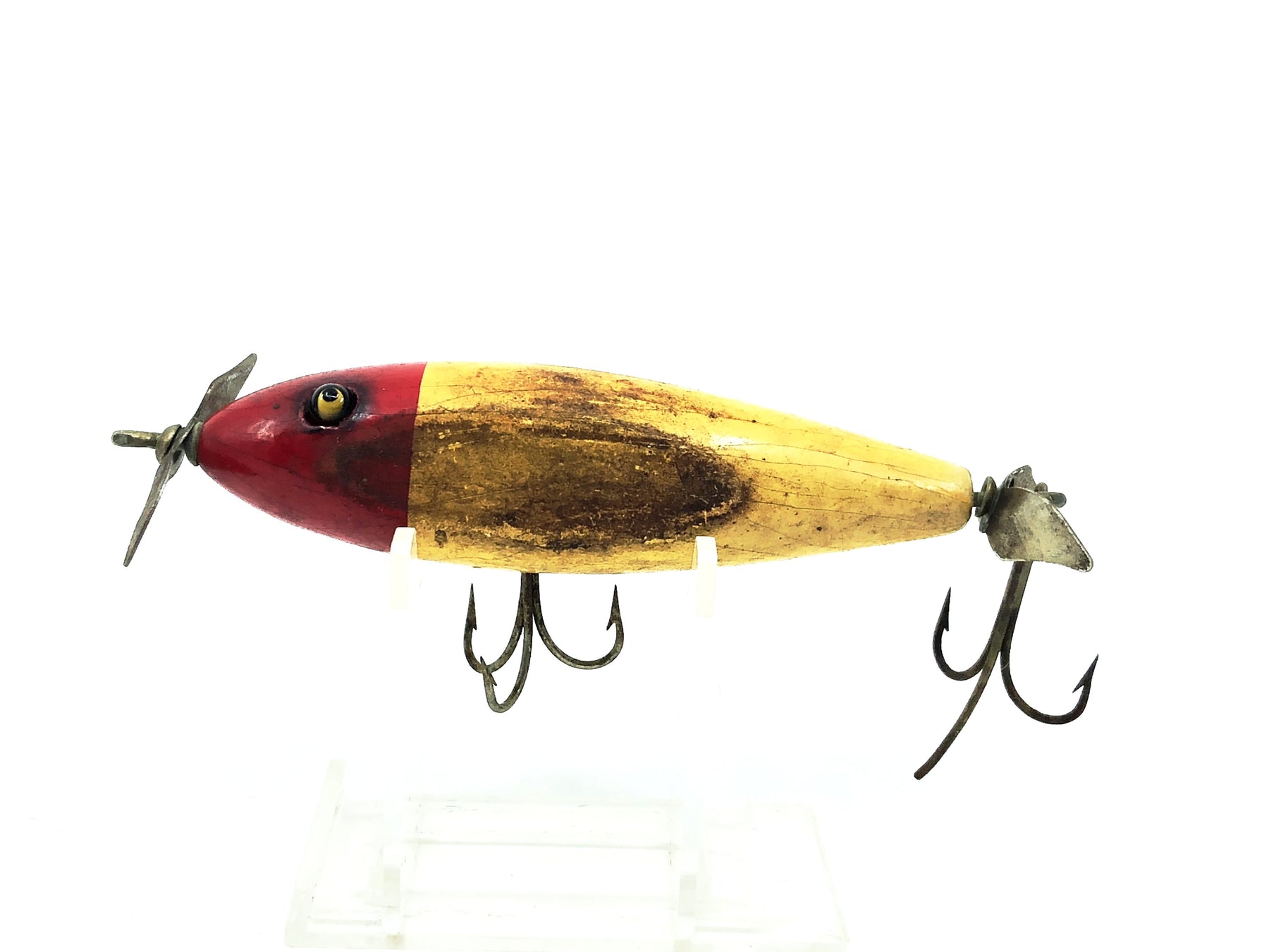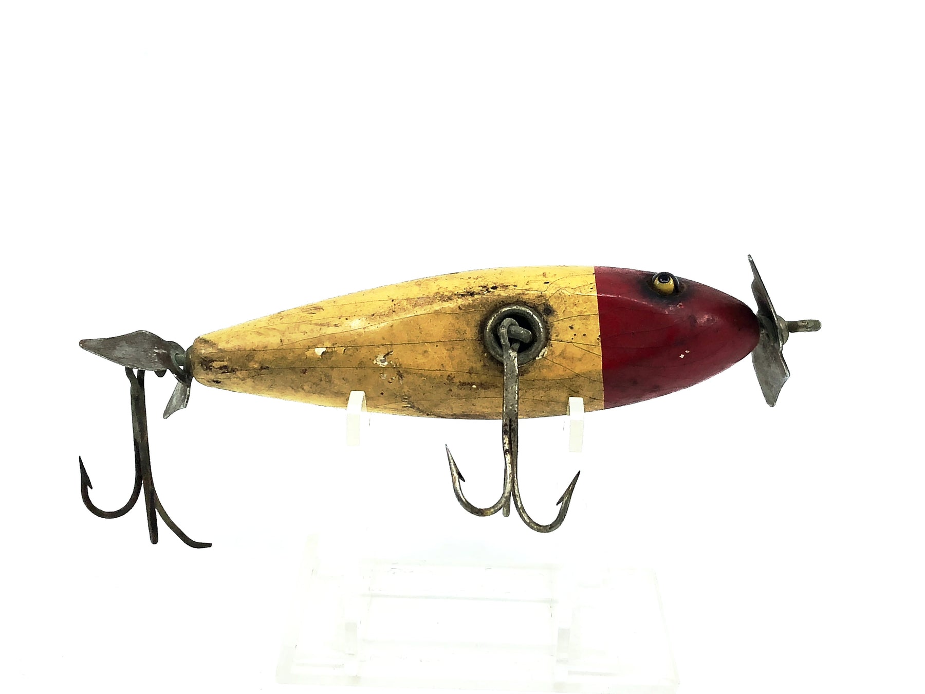 Shur Strike IM Injured Minnow, Red Head/White Body Color. About 3 3/4" long. Used vintage lure. Wooden lure, glass eyes. Made by Shur-Strike, the off brand of Creek Chub. Lure has some wear, marks, and a broken barb but still in overall ok condition, see photos. Great one for your collection here. See photos. A tougher lure to find in any condition. May clean up a little better.