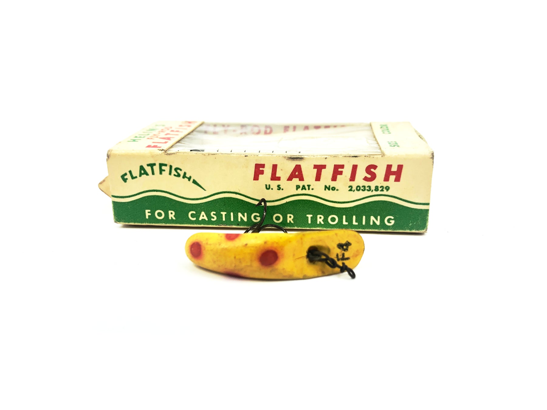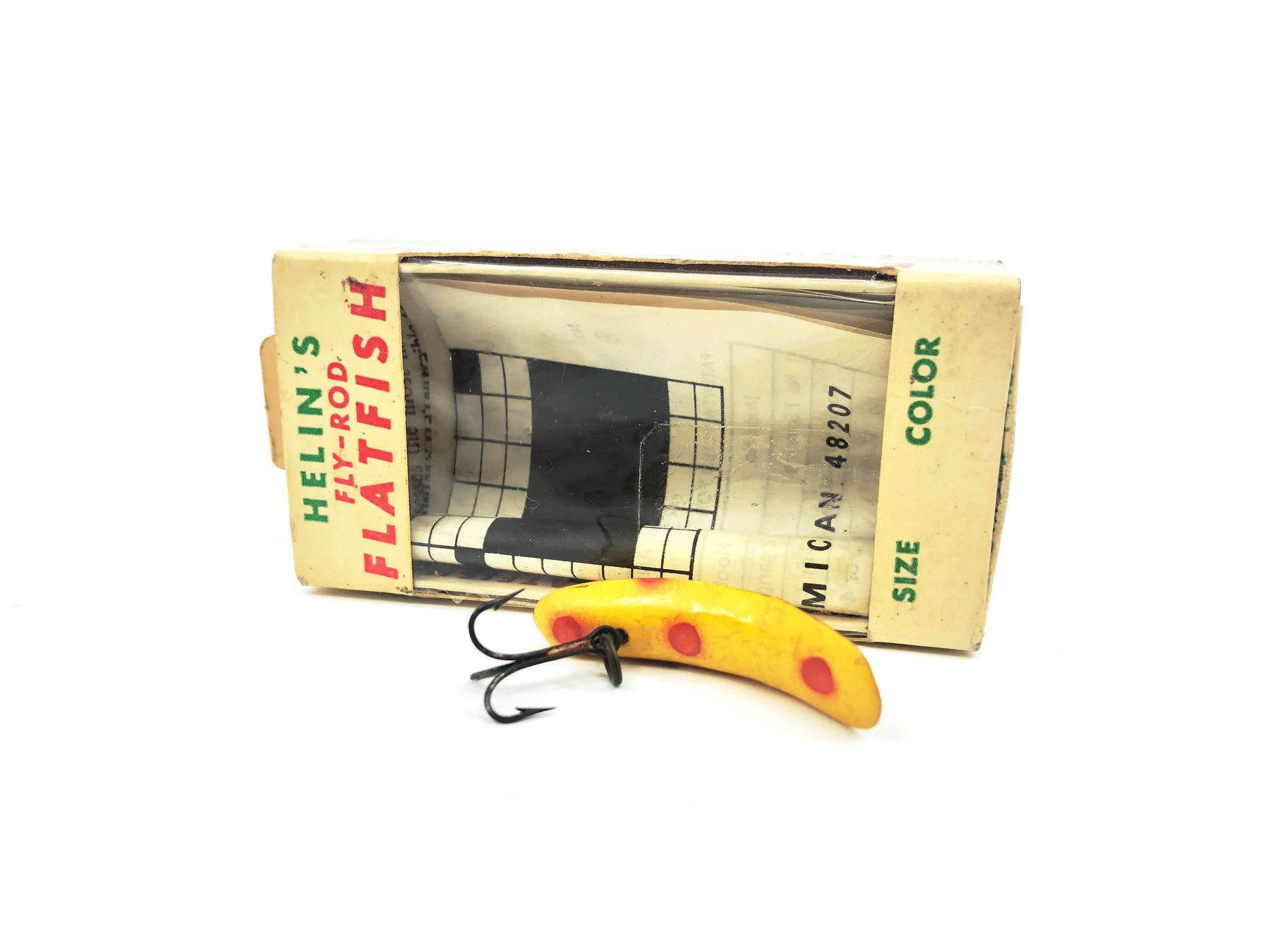 Helin Flatfish F4, YE Yellow Color in Box. Box includes paperwork.  Box in good condition with some wear and dirt on it.  Lure also has some minor wear and dirt but still in nice condition. About 1 1/2" long. See photos.  Grab this great vintage lure and fish or collect!