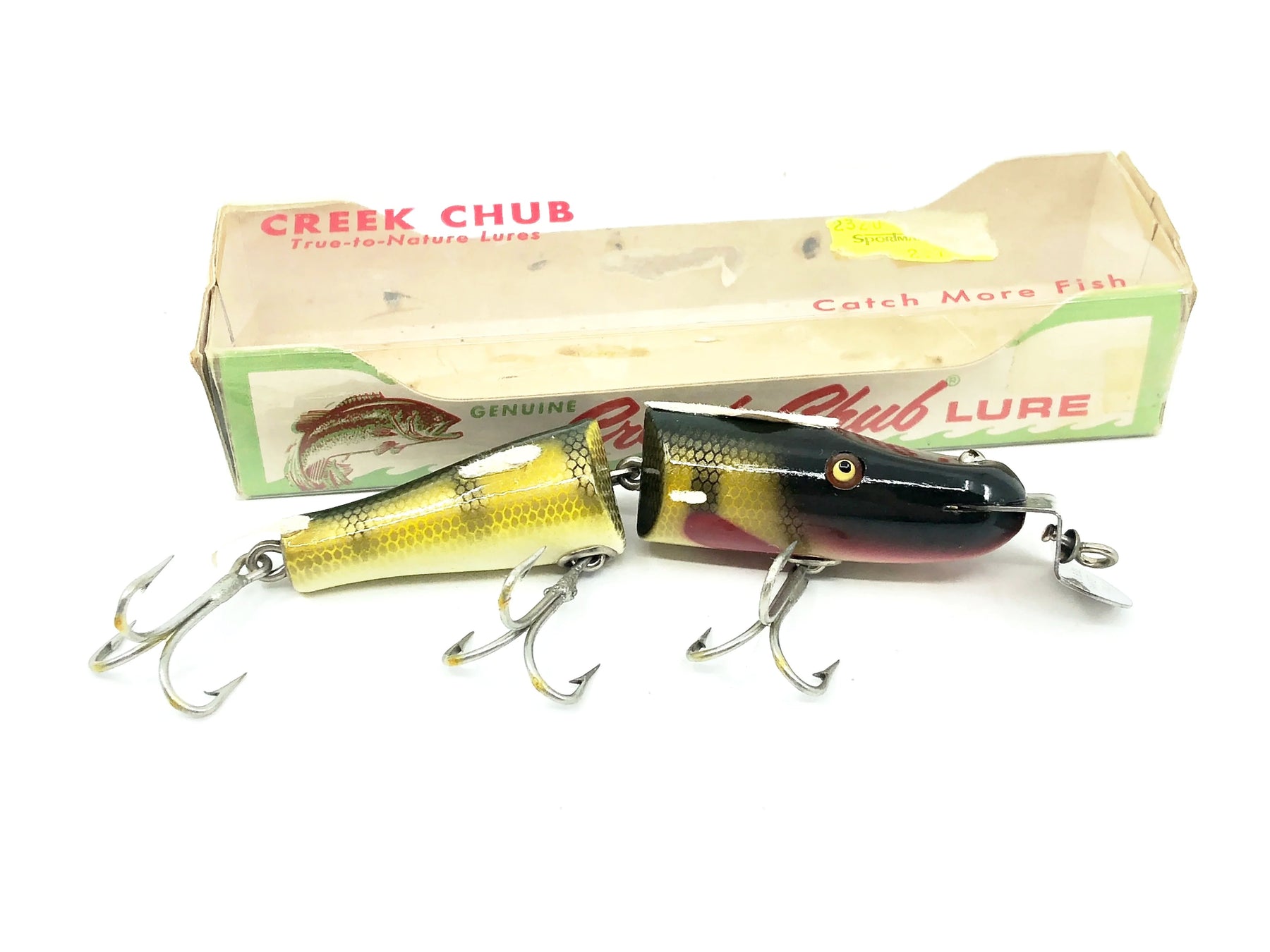 Creek Chub Jointed Pikie 2600, 2601 Perch Scale Color with Box. About 4 1/2" long. Great vintage lure here. Wooden lure, glass eyes. Comes with matching box. This pikie has some sticky residue that stuck this bait to the box however it has been removed leaving some of the box stuck to the lure. Otherwise this lure would be in great condition. Box has some minor wear but is in overall in good shape. Nice matching combo. This one won't last long so grab it for your collection or tackle box while you can. See photos.