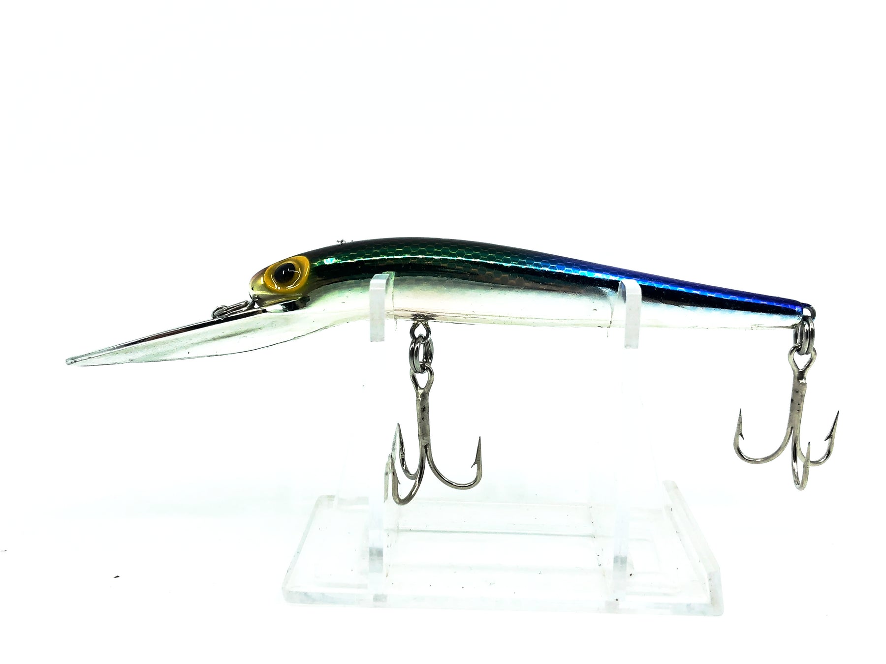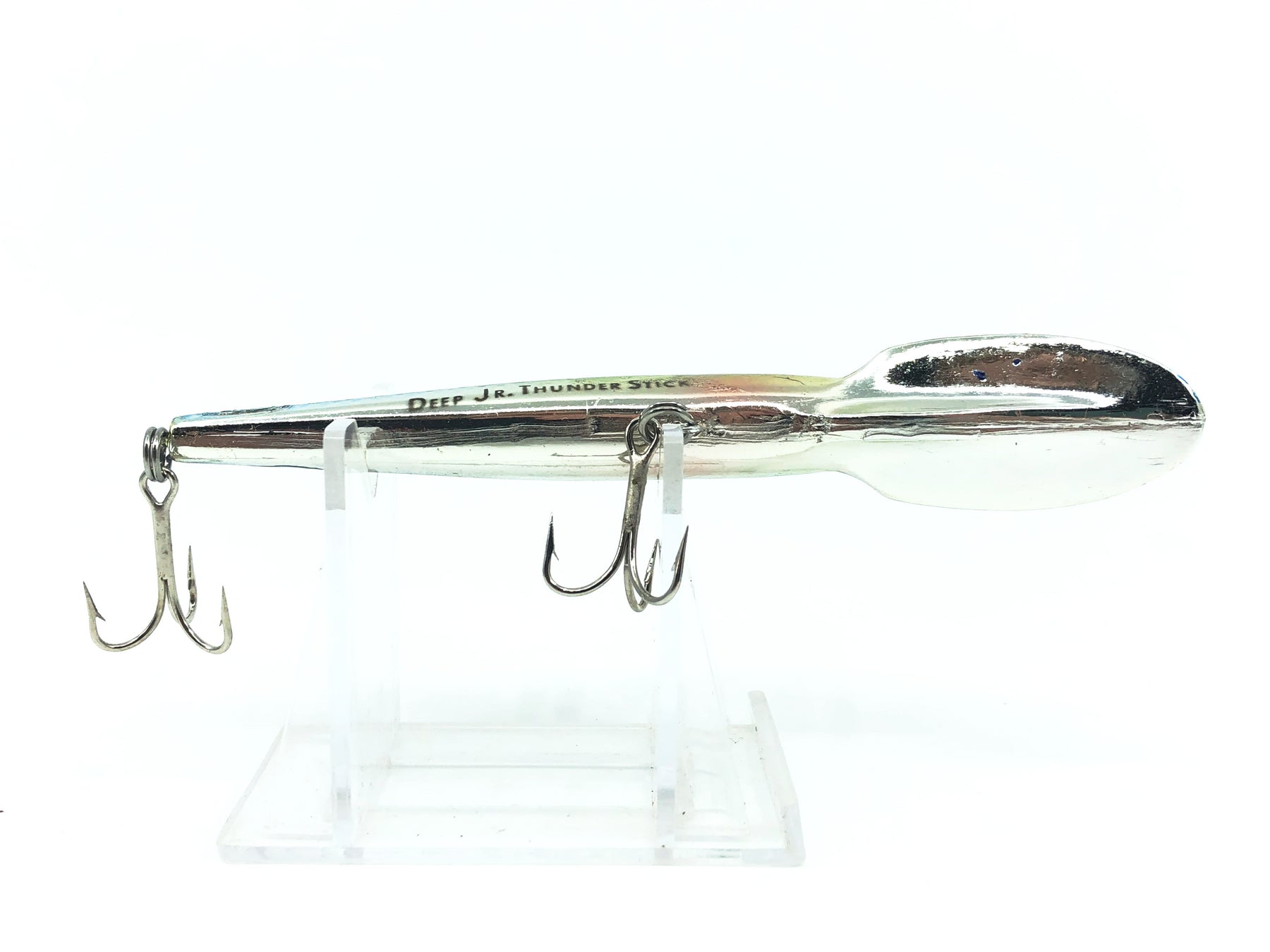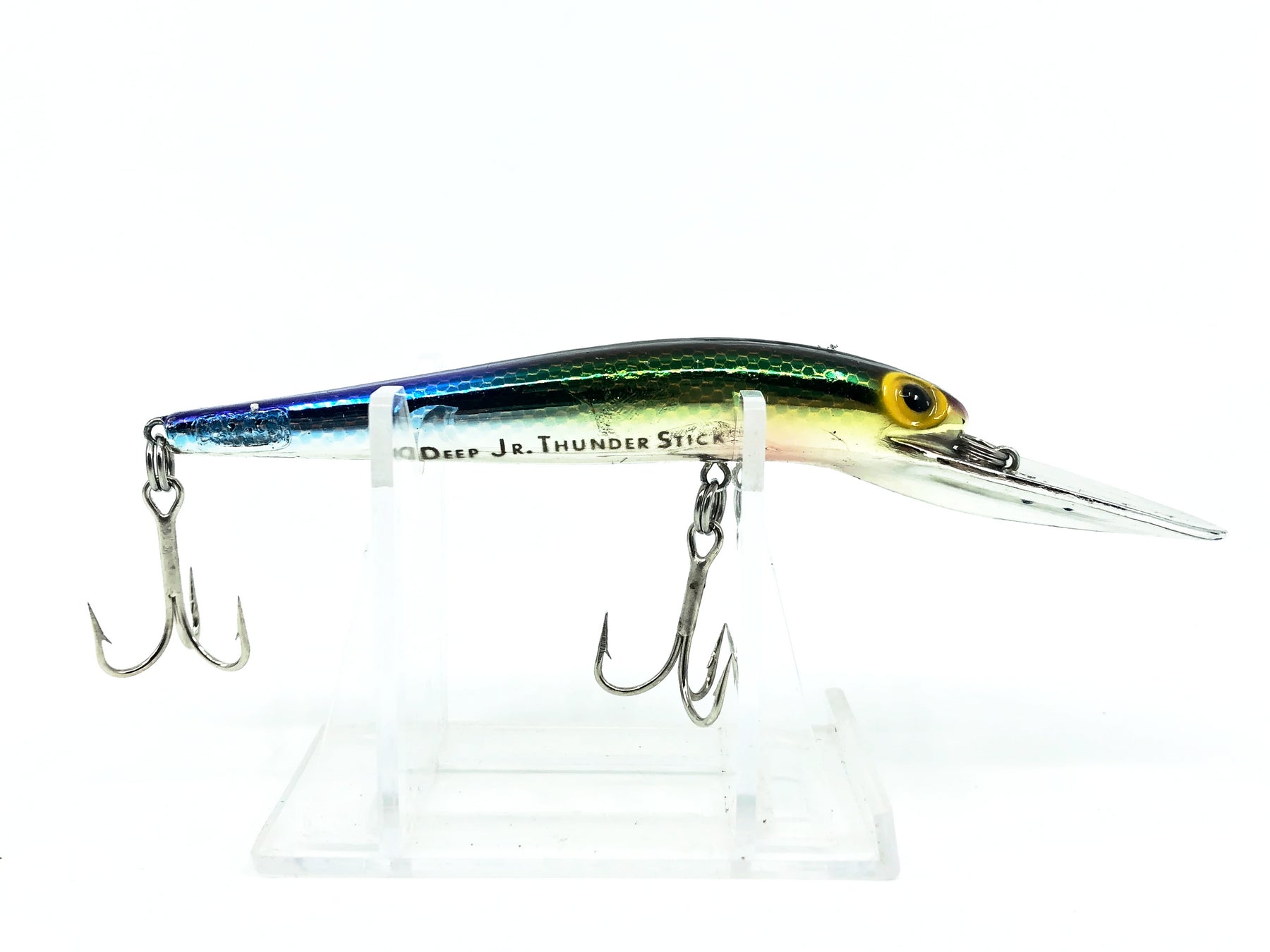 Storm Deep Jr. Thunder Stick, #147 Metallic Purple/Yellow/Green/Blue Color. Great lure here in a desirable pre-Rapala Storm color. Lure is about 4 1/2" long with lip. In good condition with minor wear and marks. Fish or collect. See photos.