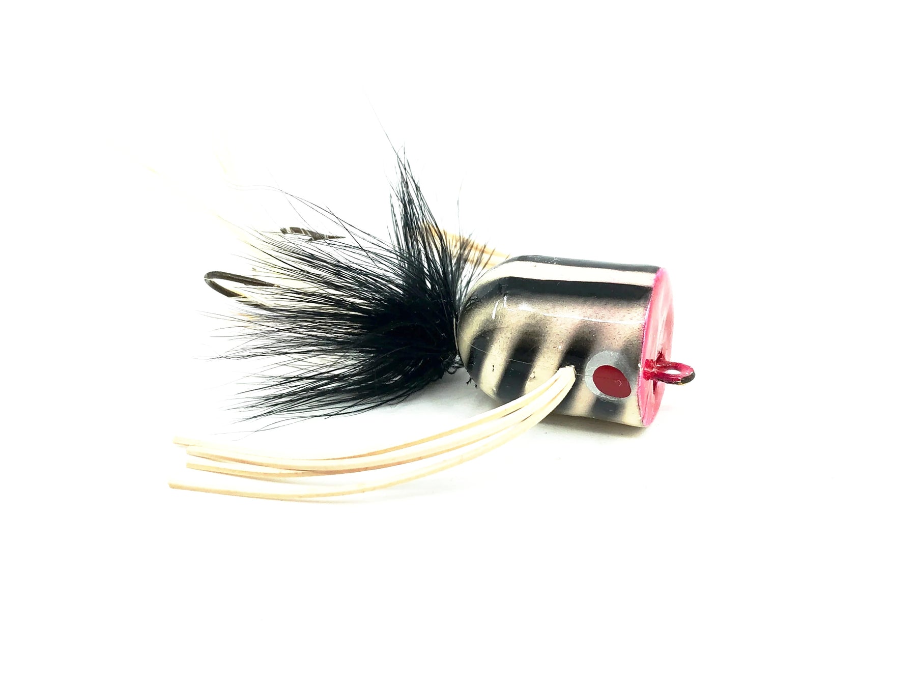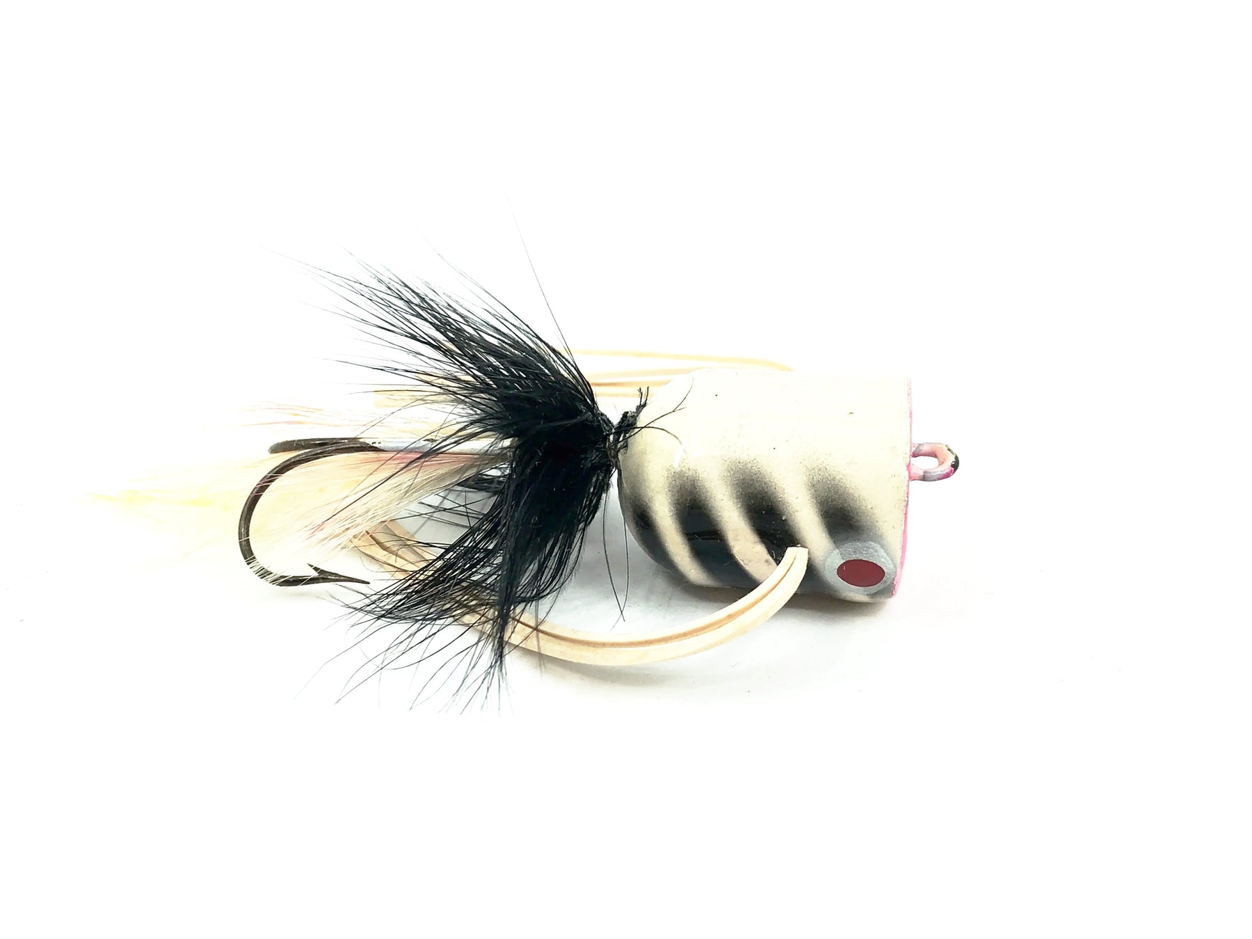 Large Vintage Fly Popper, White/Black Ribs Color. Complete with soft plastic whiskers and an array of feathers. This fly comes from an unknown vintage maker. Lure is about 1" long (body only). Bait is used but in great condition. Fish or collect, see photos.