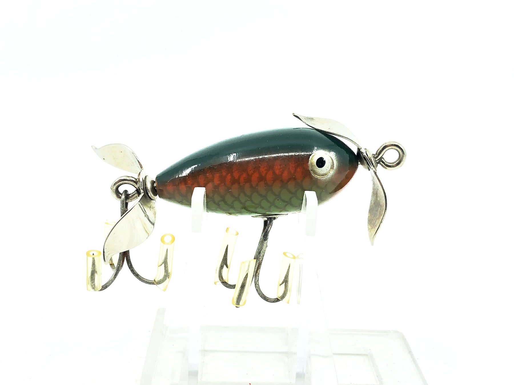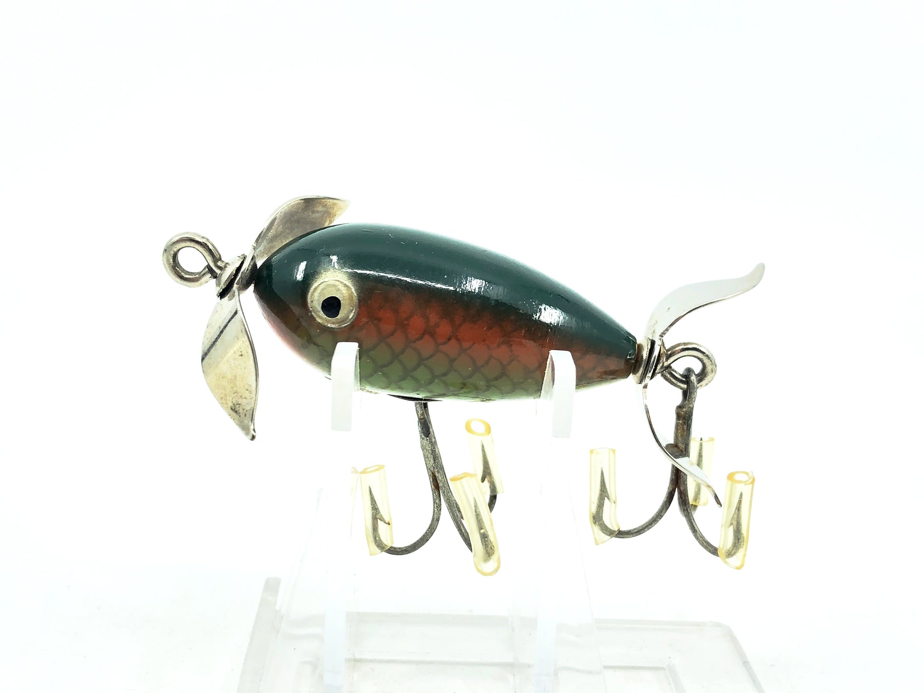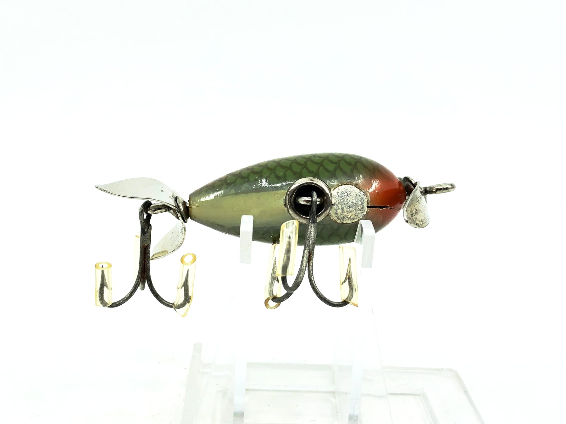Shakespeare Midget Spinner, Black Back/Red/Green Scale Color. Hard to find this lure in such good condition. About 2" long body. This lure is used with some very minor wear but in good condition, see photos. Fish or collect.