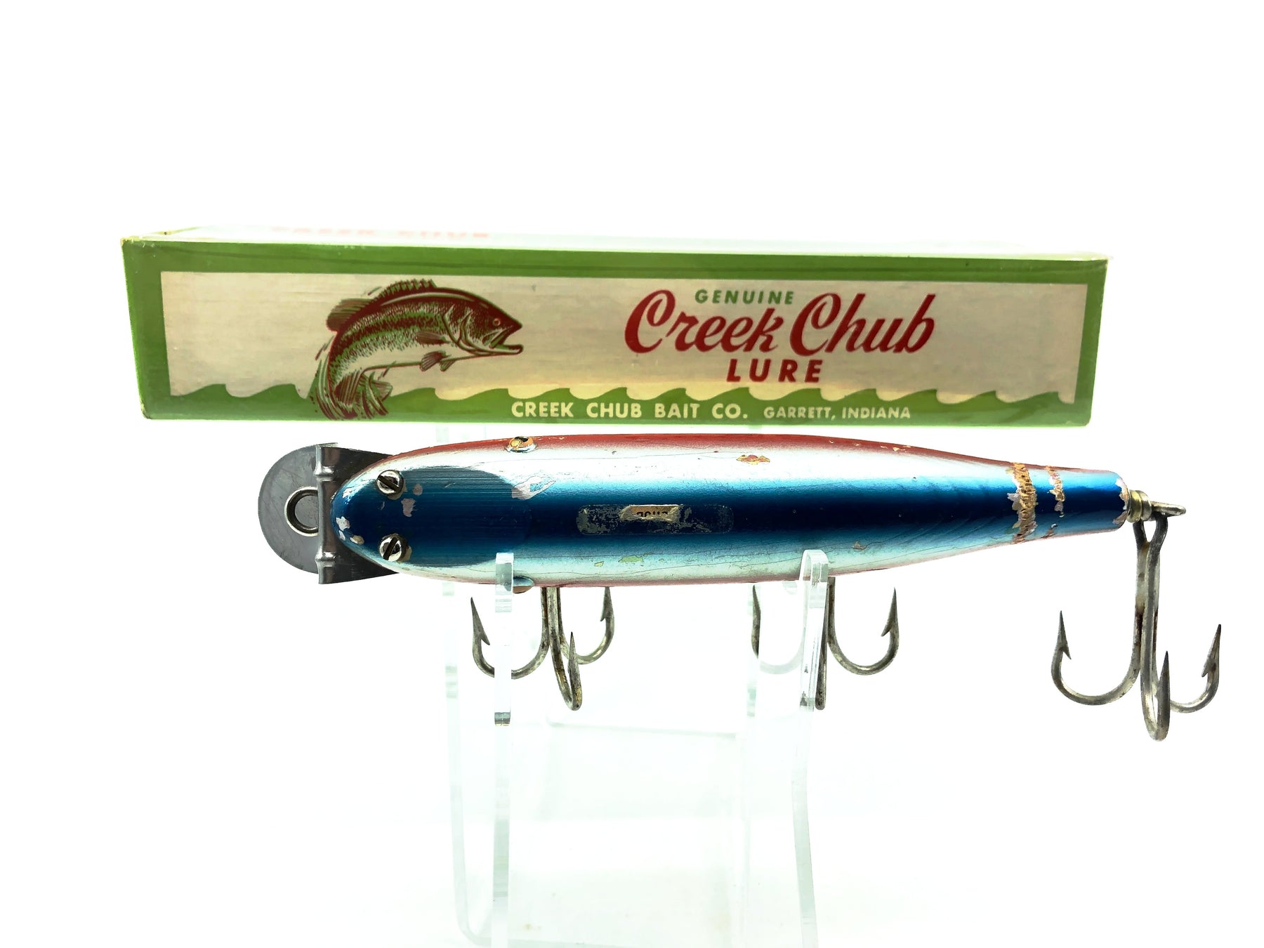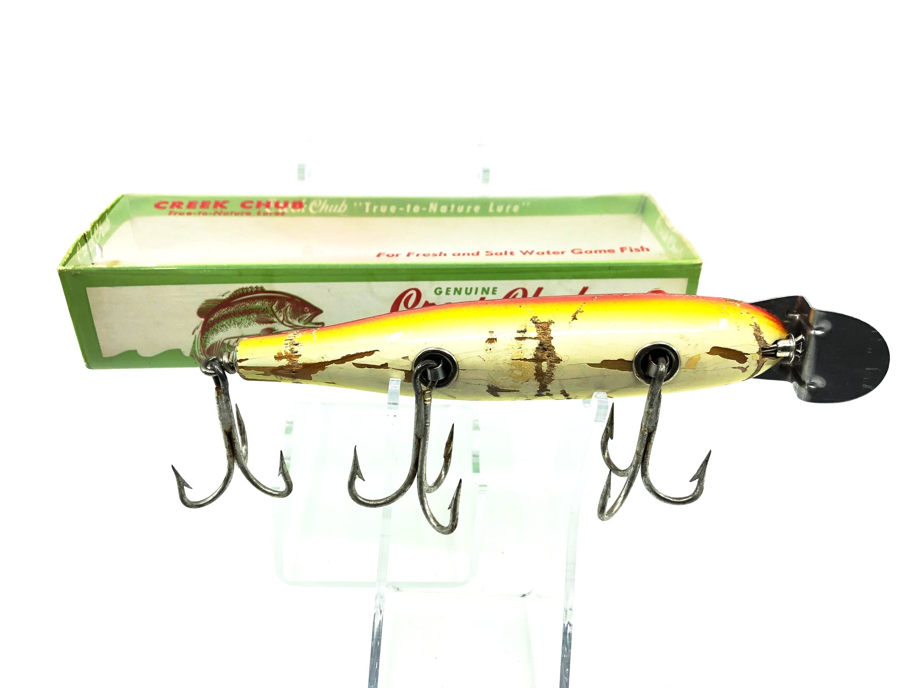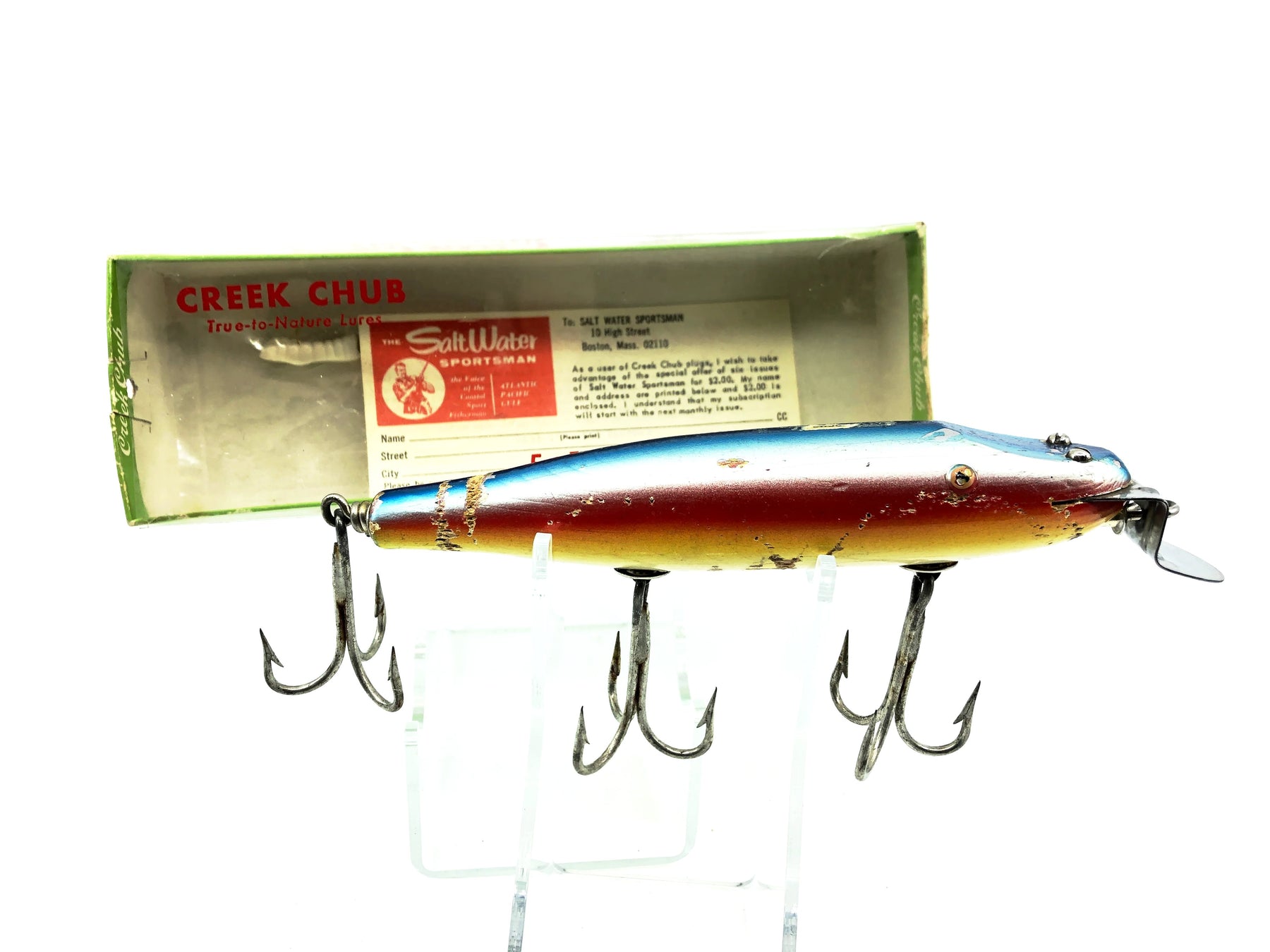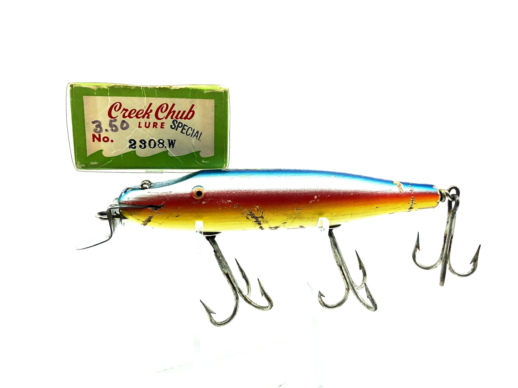 Creek Chub Husky Pikie 2300, Rainbow Color 2308 with Box-Tough Special Order. Matching box on this rarer Creek Chub. About 6" long body excluding lip. Great vintage lure here. Wooden lure, tack eyes. Box is in good condition although sleeve has a crack. Lure has some large marks and wear but in overall ok condition. This one definitely had a good amount of use. Nice combo. This one won't last long so grab it for your collection while you can. See photos. Box marked 2308W SPECIAL. Even with wear a nice combo.