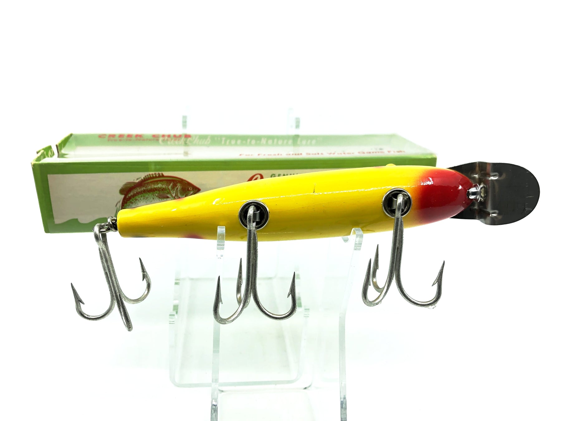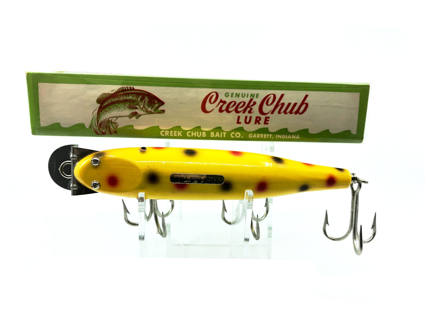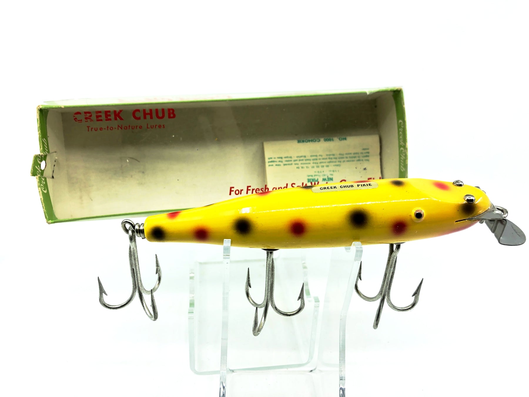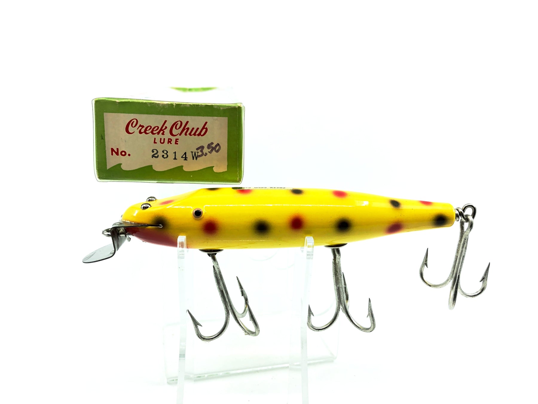 Creek Chub Husky Pikie 2300, Yellow Spotted Color 2314 with Box. Matching combo here. About 6" long body excluding lip. Great vintage lure here. Wooden lure, tack eyes. Box has some minor wear and sleeve is starting to split but in good condition otherwise. The lure is in great condition. Nice combo. This one won't last long so grab it for your collection while you can. See photos.