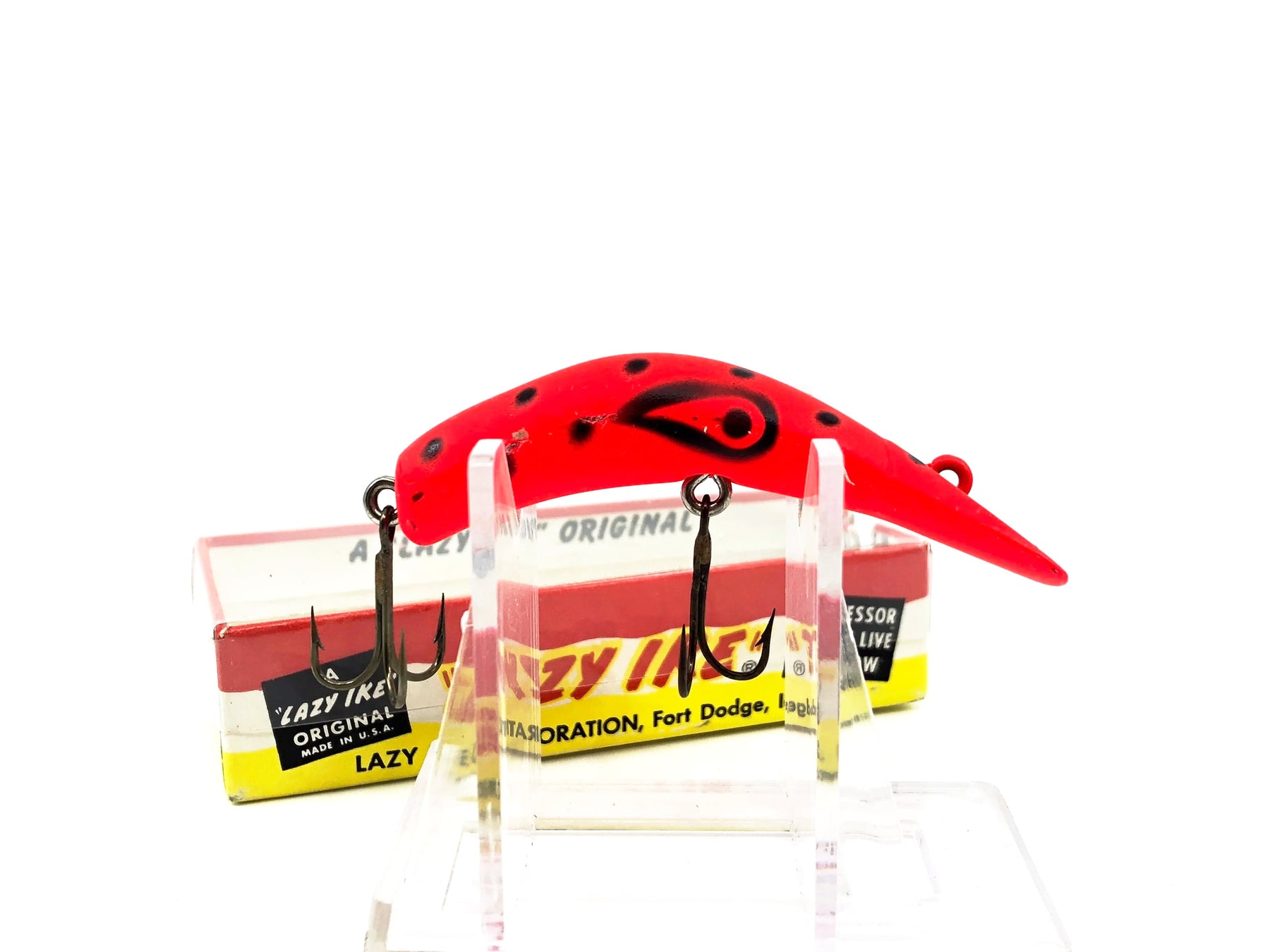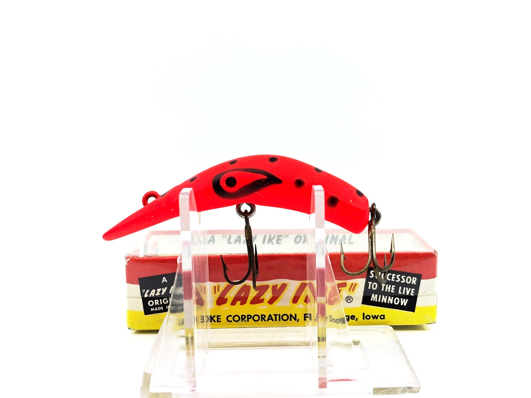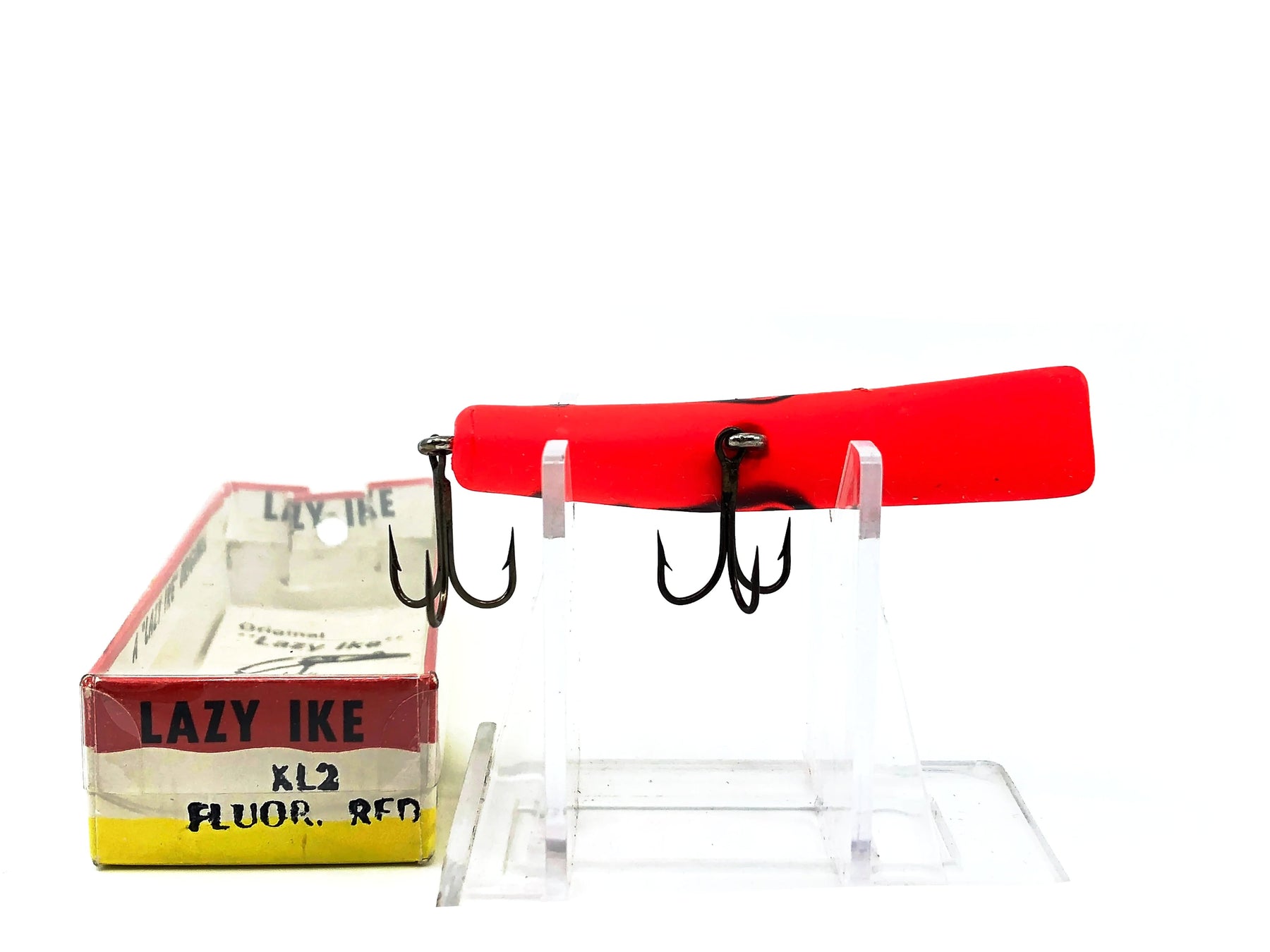 Lazy Ike KL-2 FL Florescent Red Color with Box. Box in nice shape. About 2 1/2" long. Lure has some minor wear but in overall good condition! Comes with box insert. Great combo here you don't see very often. One of the greatest all time lures. Add this one to your collection today. Vintage plastic version dating to the 1960's.