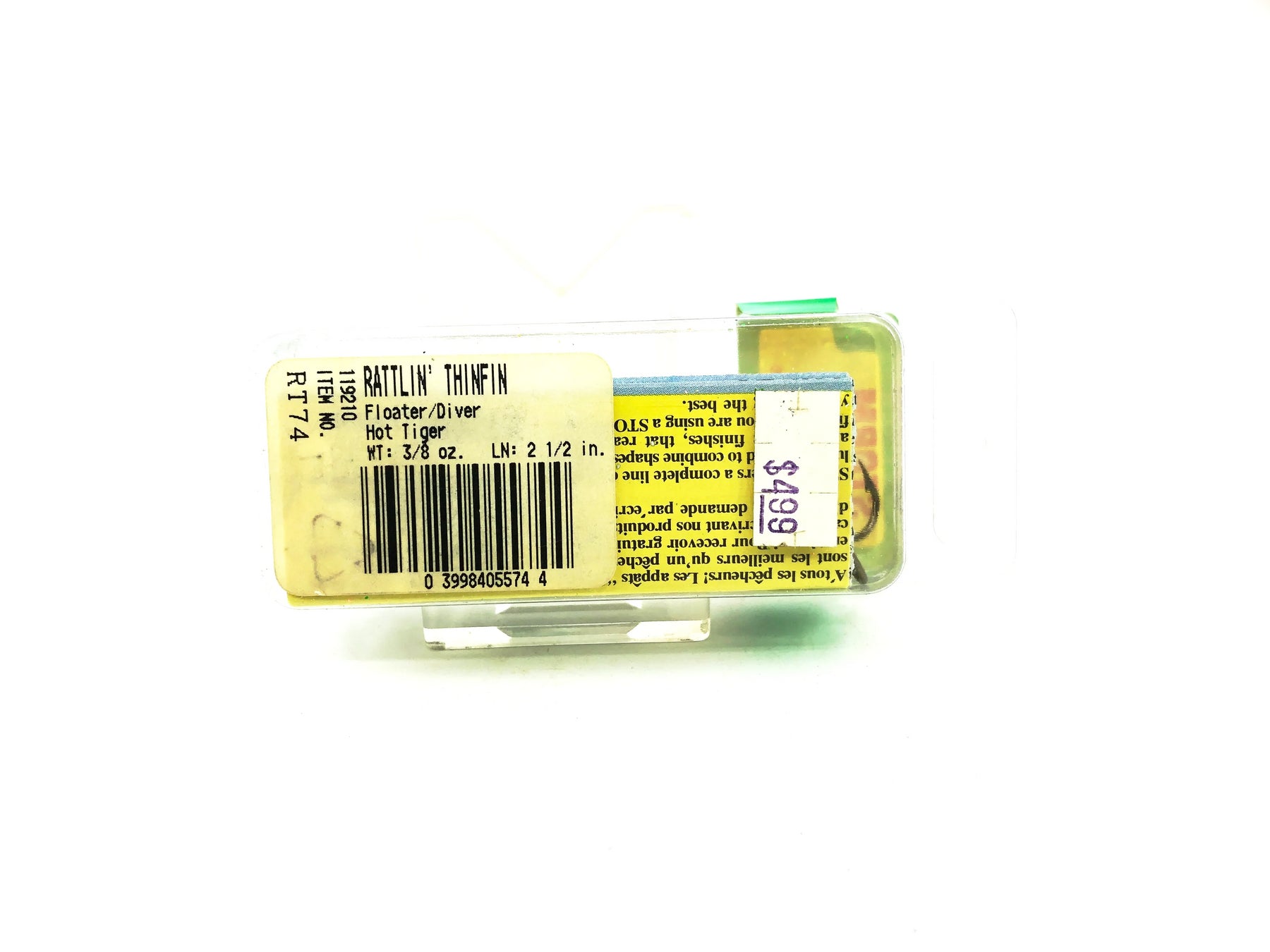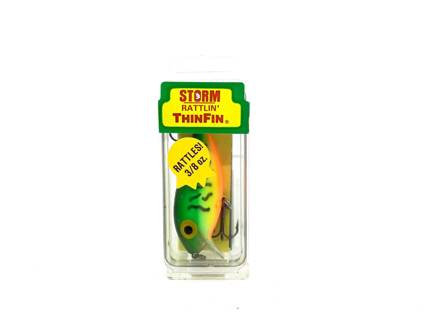 Storm Rattlin' Thin Fin RT74, Hot Tiger Color in Box. Pre Rapala Storm here. About 2 1/2" long and weighs 3/8oz.  Package in decent shape with some minor wear. Lure is new in packaging. Fish or collect this lure.