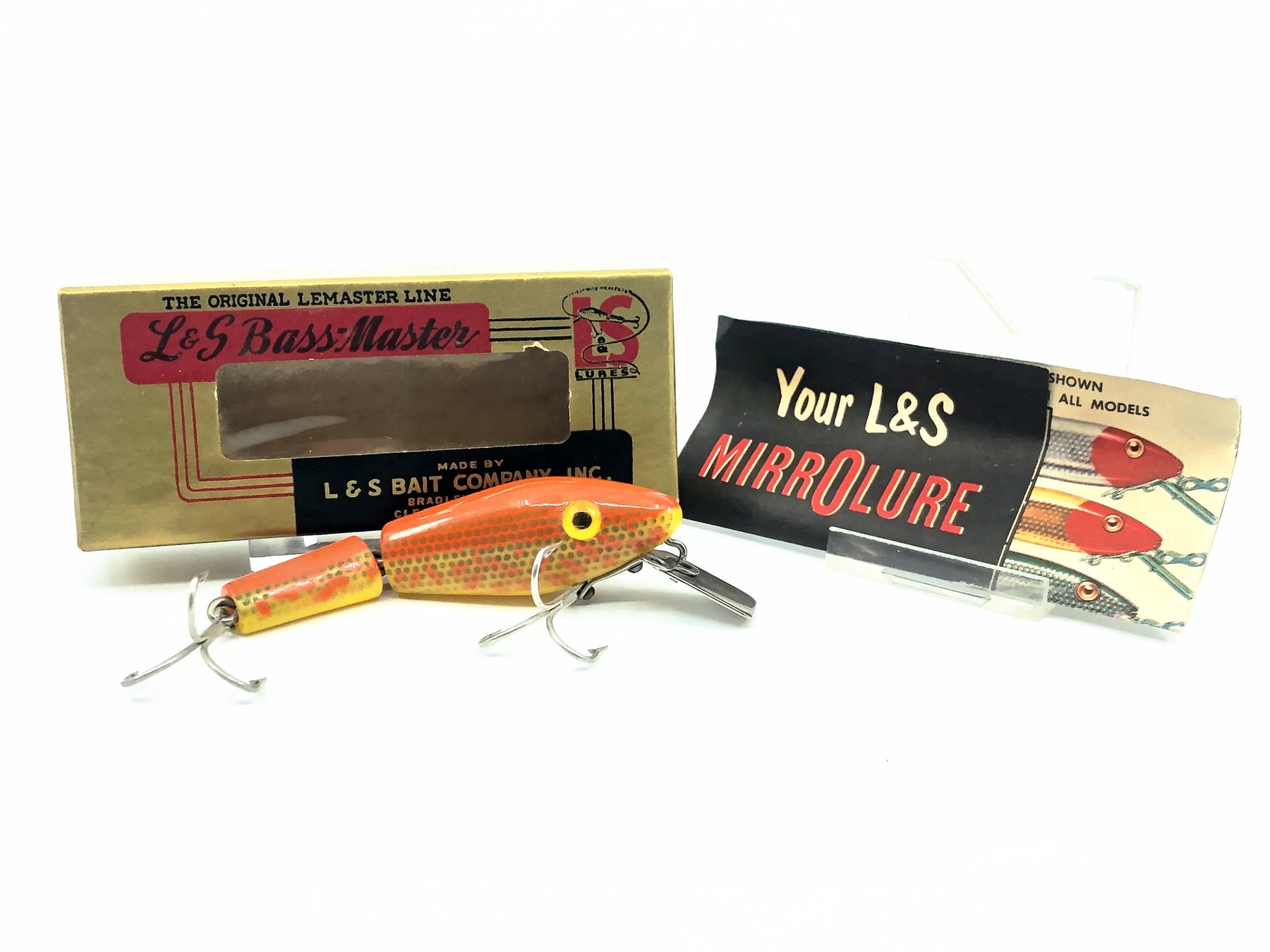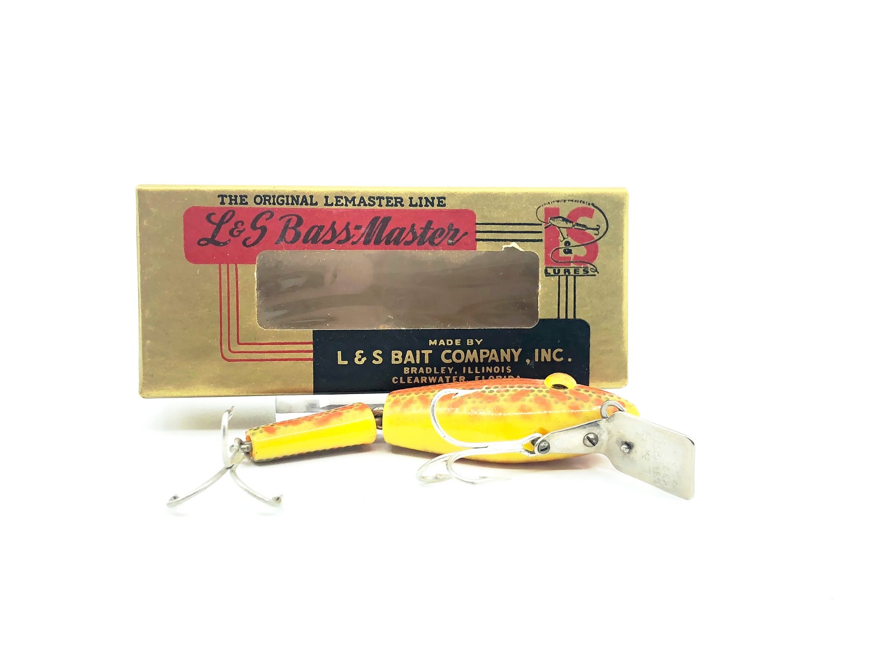 L & S Bass Master 1528 Model, Yellow Belly/Orange Back & Speckles Color w/Box. Lure is about 3" not including lip. Used with some minor wear but still in overall very good condition. Box in decent shape as well.  Includes box insert catalog.  Great for fishing or your collection.  A tougher one to find.
