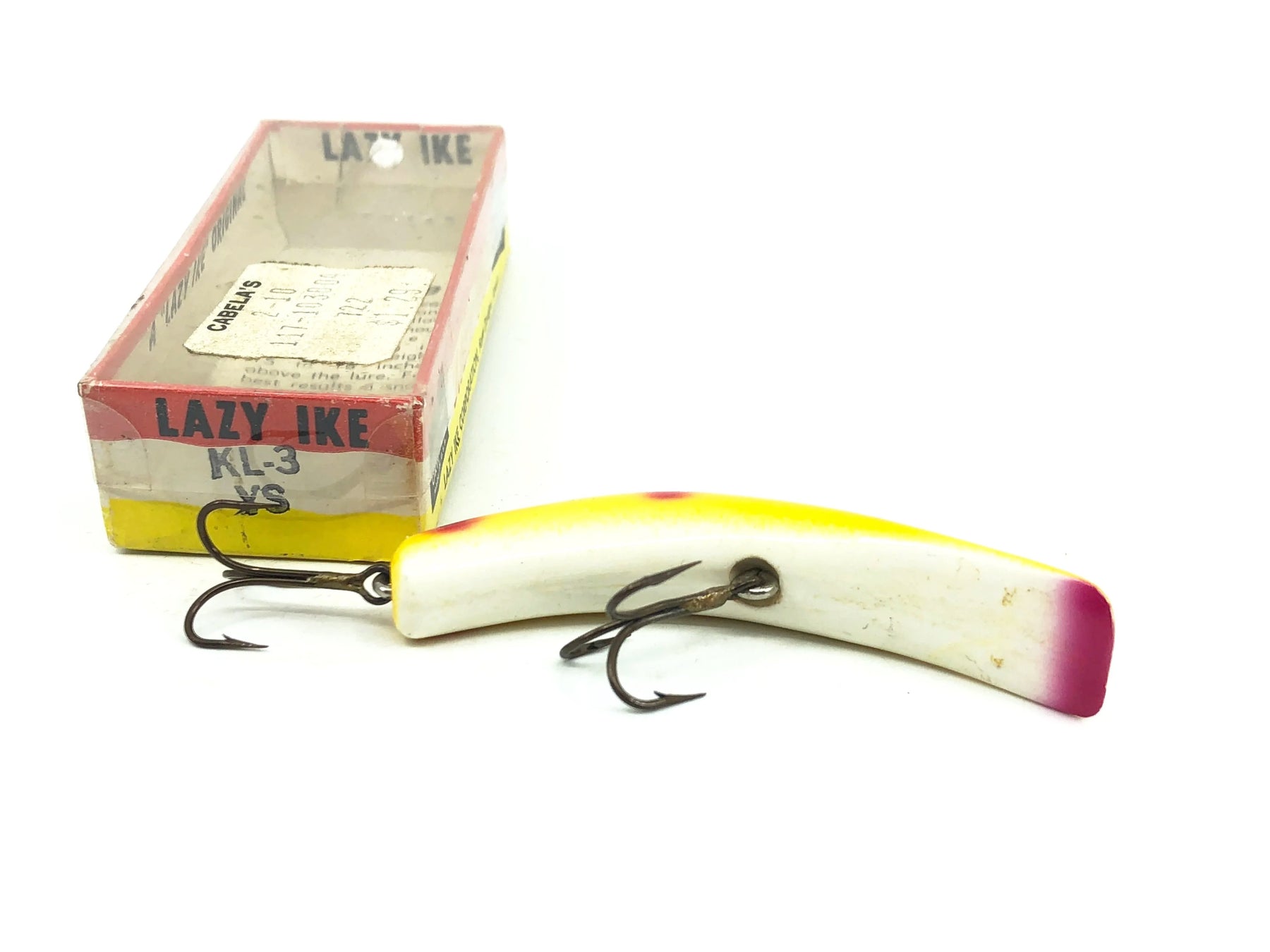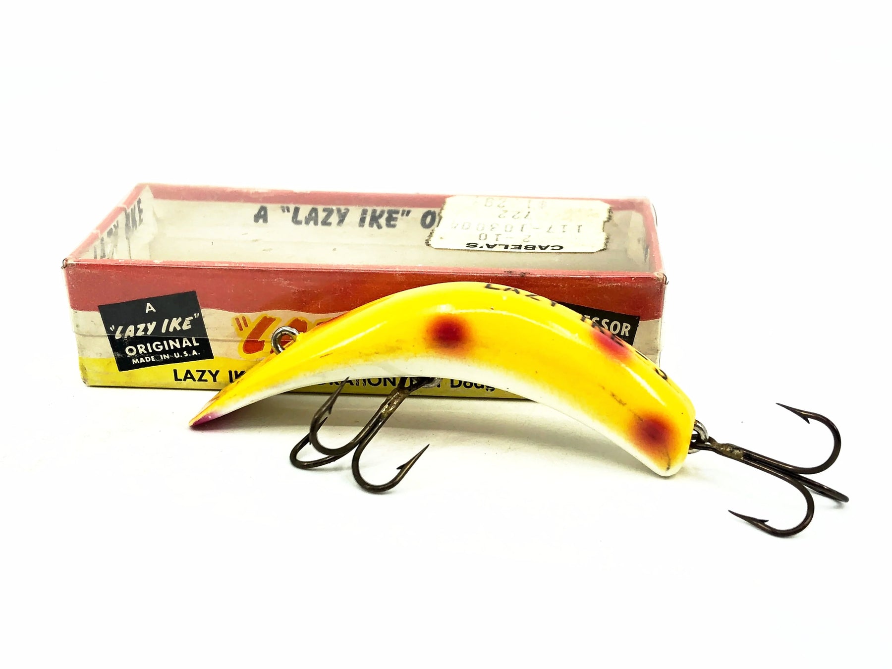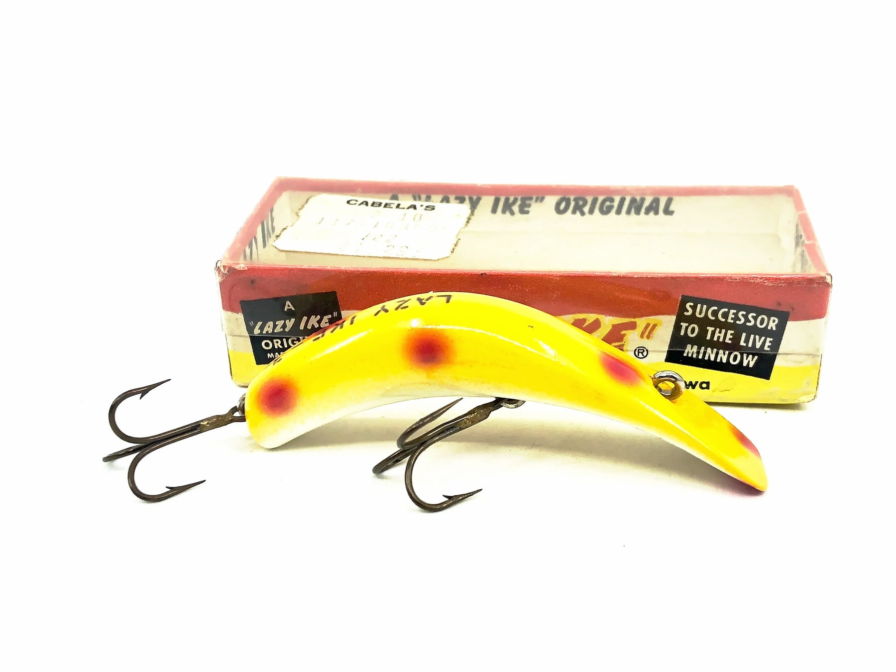 Lazy Ike KL-3 YS Yellow Spot Color with Box. Box in nice shape. About 3" long. Lure is in great condition for it's age! Great condition with just a little bit of box wear from decades of storage. Comes with box insert. Great combo here you don't see very often. One of the greatest all time lures. Add this one to your collection today. Vintage plastic version.