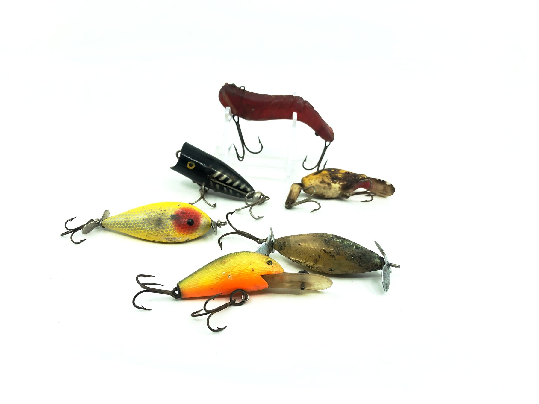 Fishermen's Variety Pack. This pack includes six unmarked and marked lures all range in make, condition, and lure type. Some notable lures in this pack are the Sparkle Tail and an imitation Heddon Chugger Jr. See photos, Great deal!  All lures are used with degrees of wear varying but still some life in them with some tlc or display them as vintage warriors.
