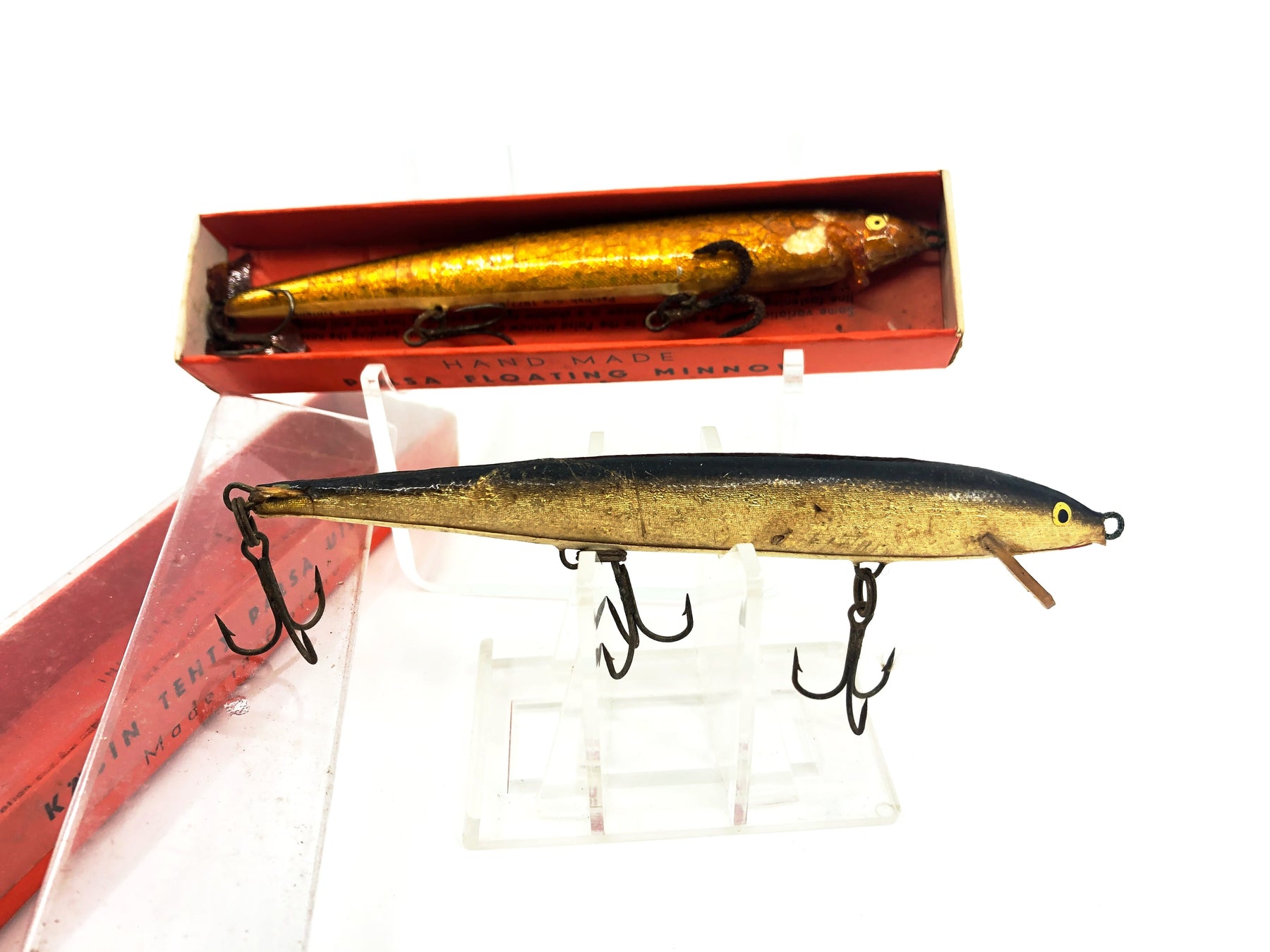 Palsa Floating Minnow with Box Combo. Great vintage deal here on some classic Finnish lure. Both lures have a good amount of wear with the gold colored minnow having cracks, a broken lip, and some rust. Boxes have some wear as well, see photos. Both these models are about 5" long. Fish or collect.