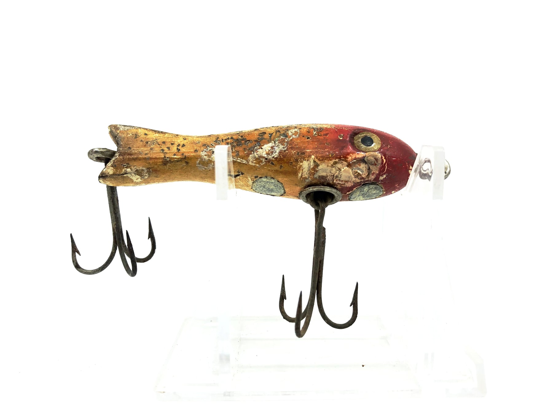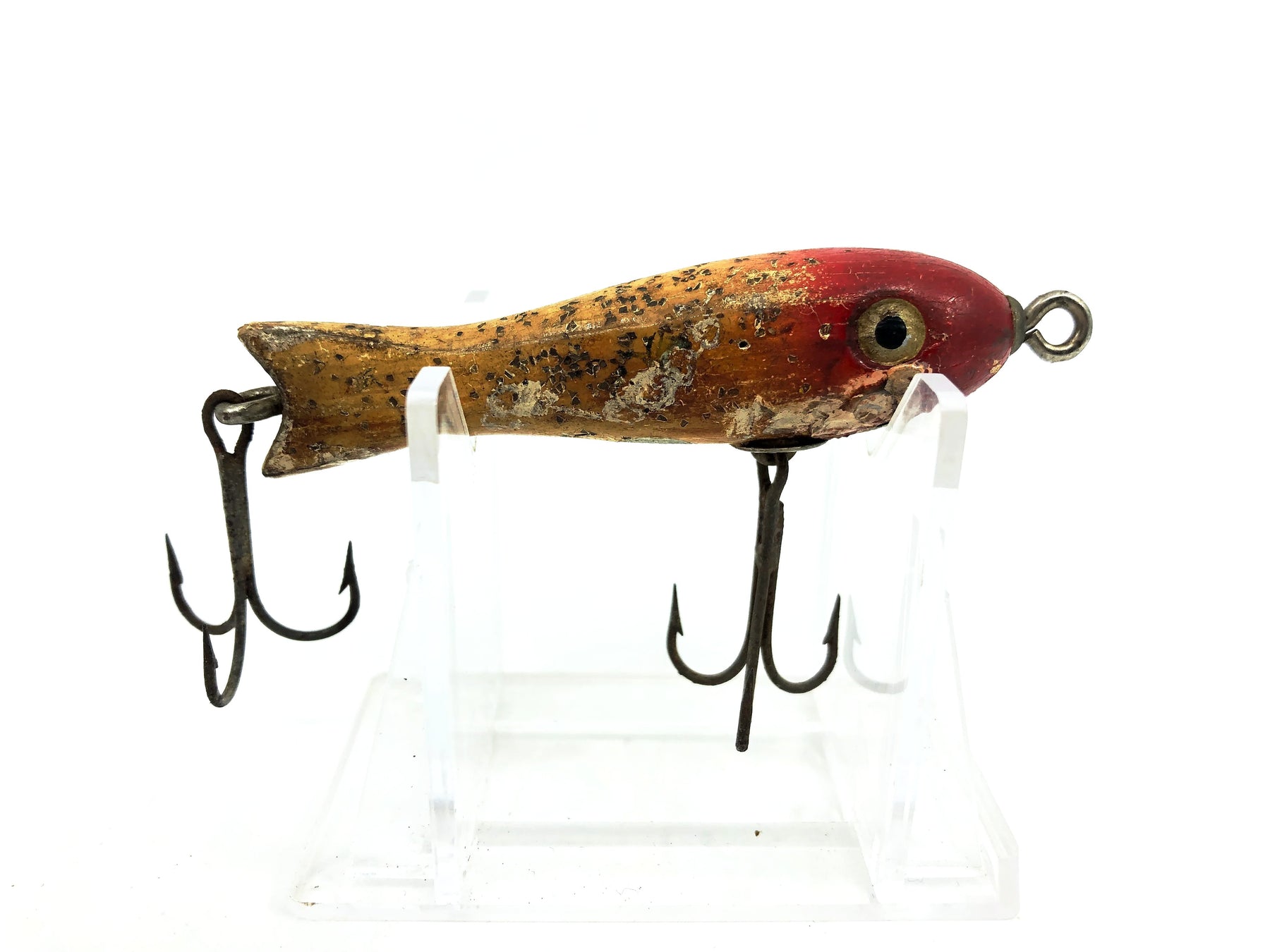Shakespeare Sea Witch, Red Head/White Color. About 2 5/8" long body. Used vintage lure with some wear and marks as shown but still in overall ok condition. See photos. One of the all time classic fishing lures. Fish or collect. Tough to find these old wooden mice.