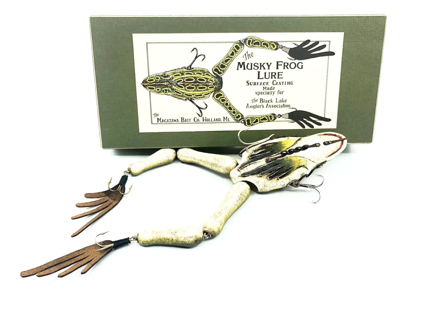 Macatawa Bait Co. Musky Frog Lure w/Box. This is a unique old/early Macatawa Frog, that comes with the many signs of Macatawa's early baits: belly weight and paint style. Lure's body is about 8 3/4" excluding the leather feet (about 12" fully extended). Hand carved basswood, glass eyes and leather feet. Lure is in amazing shape. The matching box does have some very minor storage wear but is still in good condition. See photos.