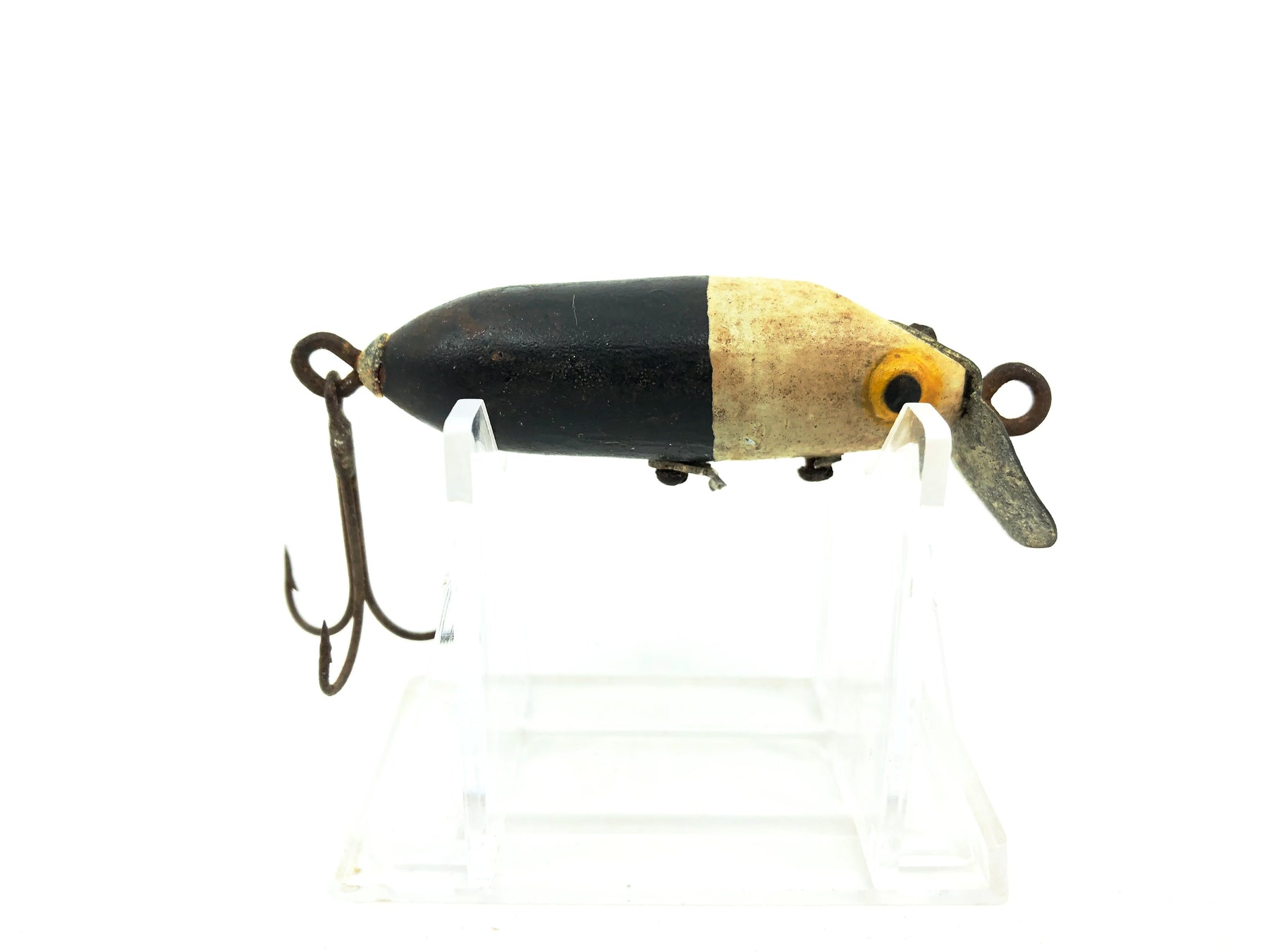 Rinehart Jinx, BWH Black White Head Color. Great vintage lure here. Both color and body style are 1st generation. Lure is about 2 1/4" long. Used lure with some wear and broken hardware but still overall ok condition, see photos. Tougher Rinehart lure to find here, especially in this color. Made by the Rinehart Tackle Company out of Newark, Ohio. Grab this one for your collection. Don't see many of these.