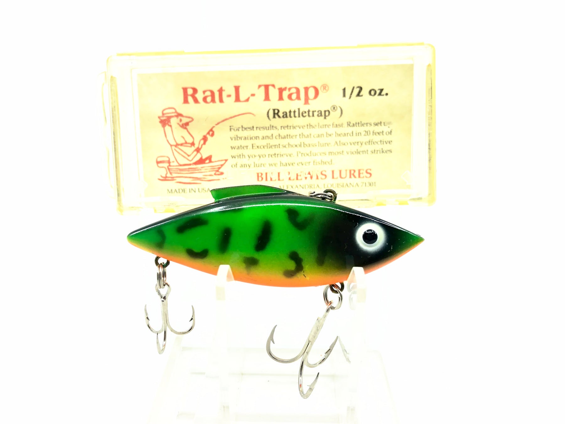 Bill Lewis Rat-L-Trap, #22 Fire Tiger Color w/Box. Great lure here in a popular Bill Lewis color. About 3" long and weighs 1/2oz. Vintage Rat-L-Trap is new in box and the box is in good condition, see photos. Fish or collect. See photos.