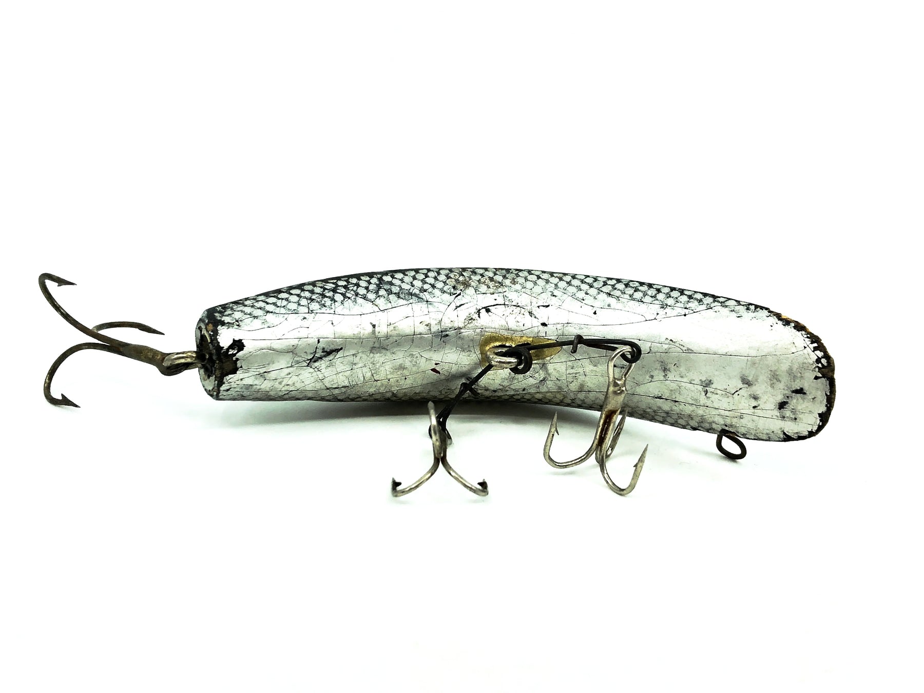 Helin Wooden Flatfish S3, SS Small Aluminum Scale Color. About 3 3/4" long. Used with some wear and marks/chips but overall fair condition, see photos. One of the most successful fishing lures ever made. Fish or collect! Vintage wooden version.