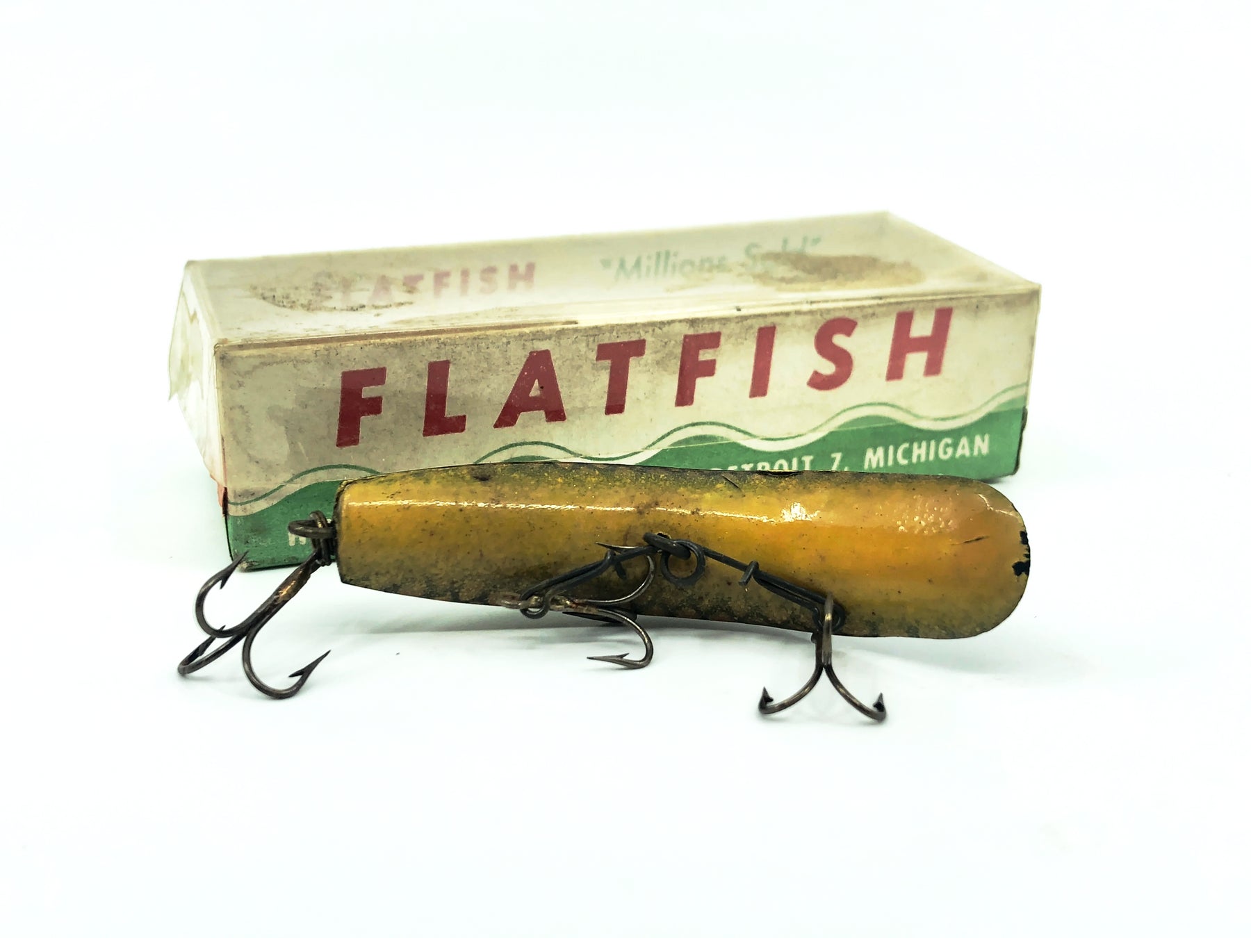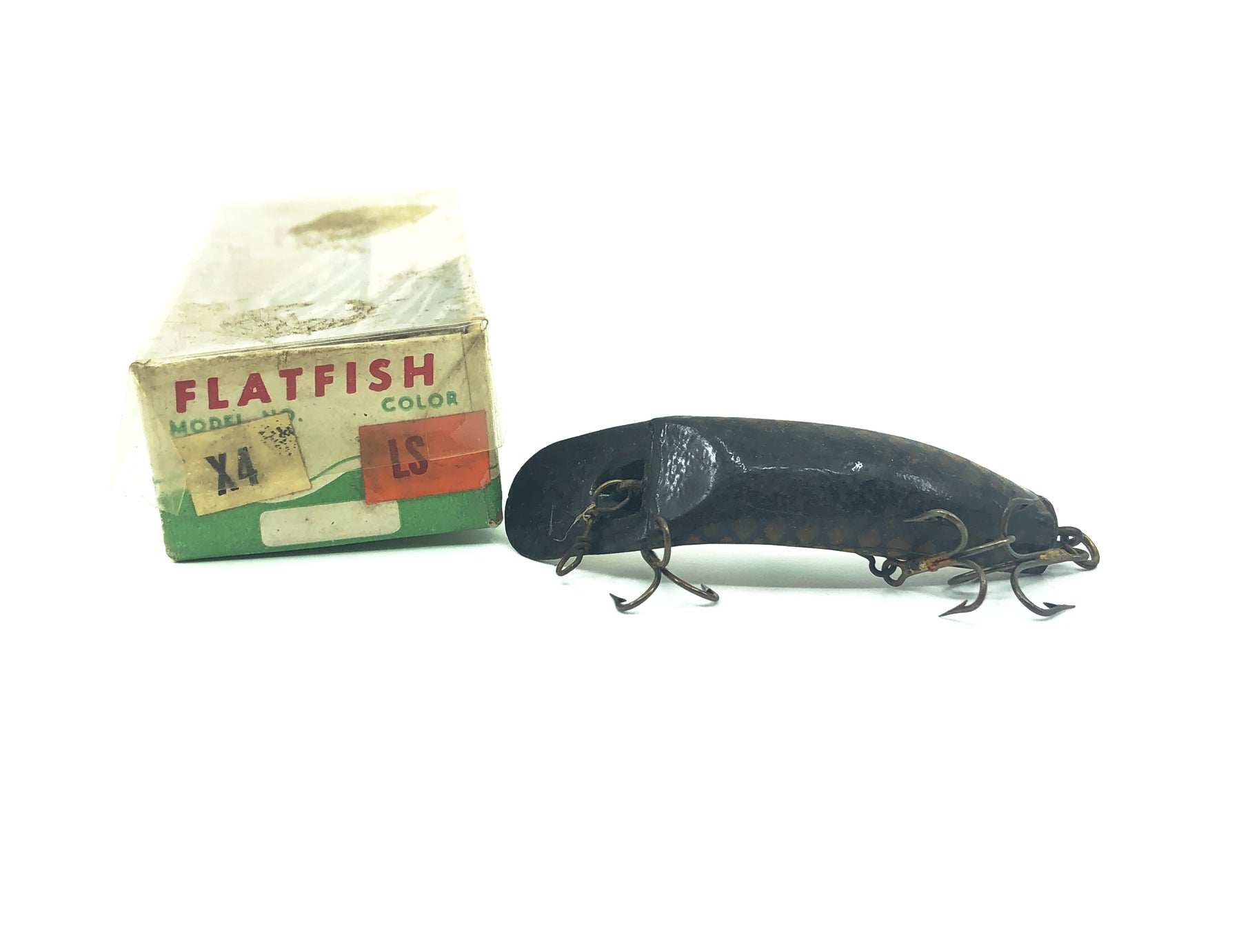Vintage Helin Flatfish X4, LS Large Scale Color with Box. Lure is about 2 1/2" long. Lure has some dirt and marks from storage. Matching box has some wear but is in overall good condition. See photos.
