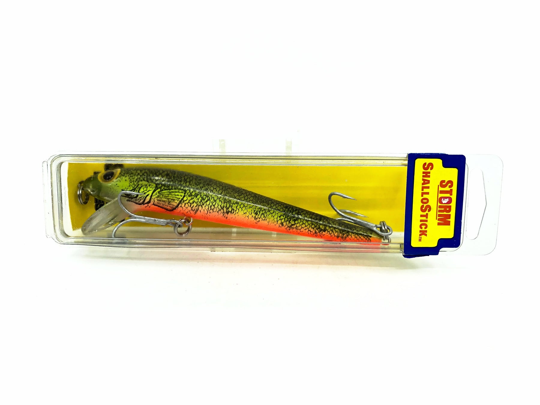 Storm Shallostick BJ, #60 Naturistic Perch Color w/Box. Unique pre-Rapala Storm here. Lure is about 5 1/4" long. This Storm is new in box and the box is in good condition. Fish or collect. See photos.