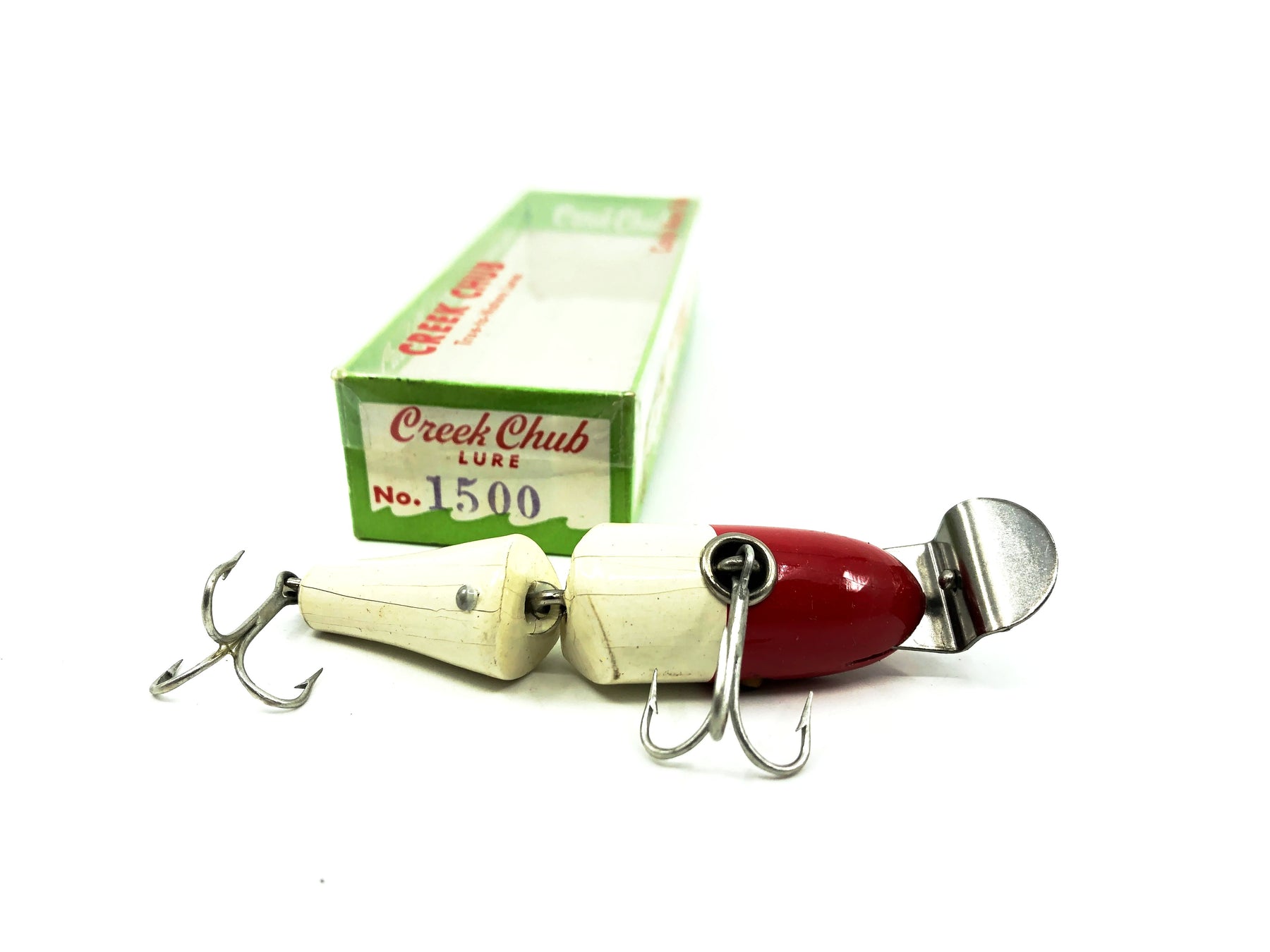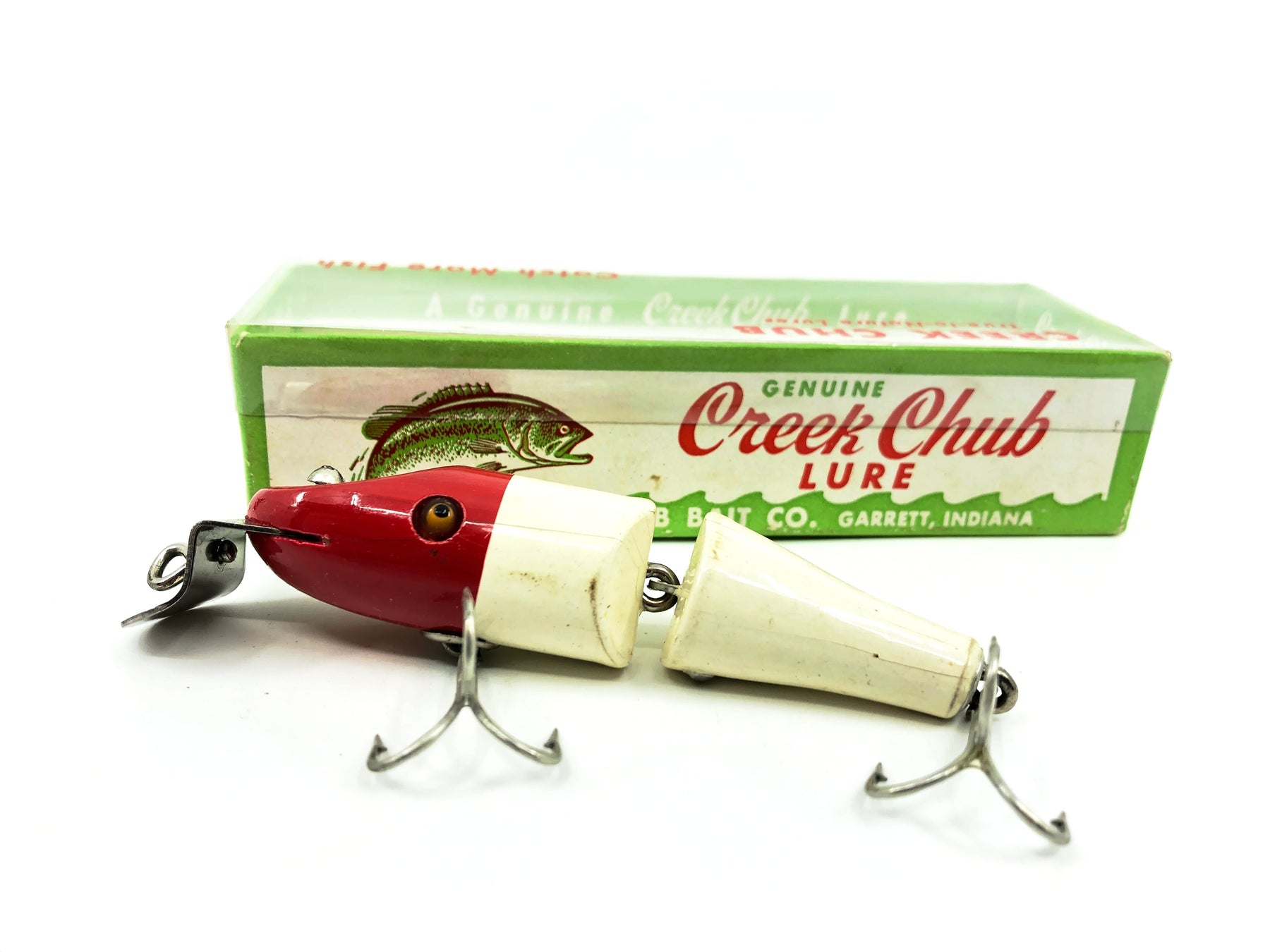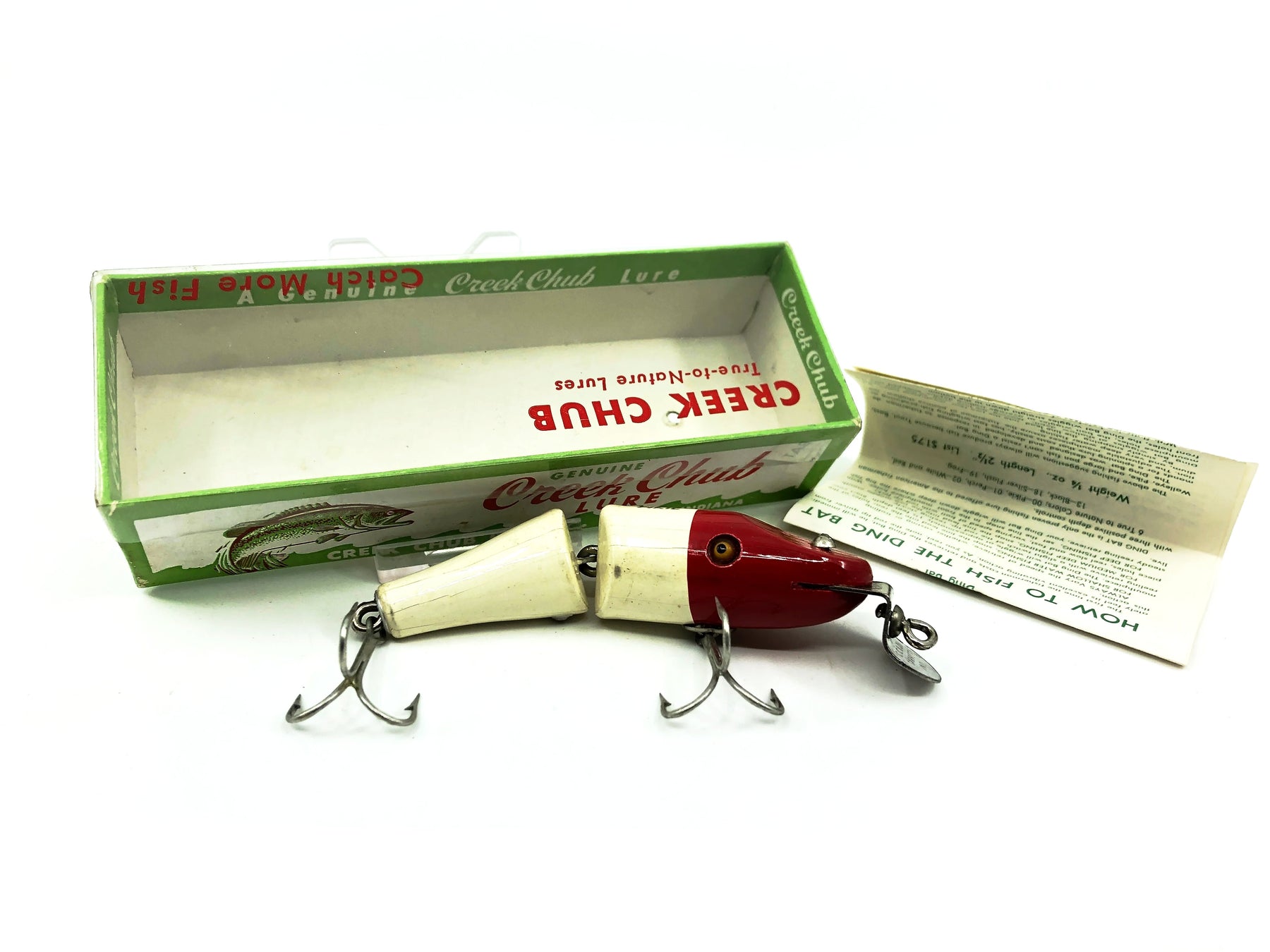 Creek Chub Baby Jointed Pikie 2700, Red White Color 2702 with Box. Box is for an Injured minnow in Pikie color. About 3 1/2" long. Great vintage lure here. Wooden lure, glass eyes. Still a good combo despite being mismatching. Vintage lure is used with some minor wear but overall in very good shape. Box has some minor wear but overall in good shape. Nice combo. This one won't last long so grab it for your collection while you can. See photos.