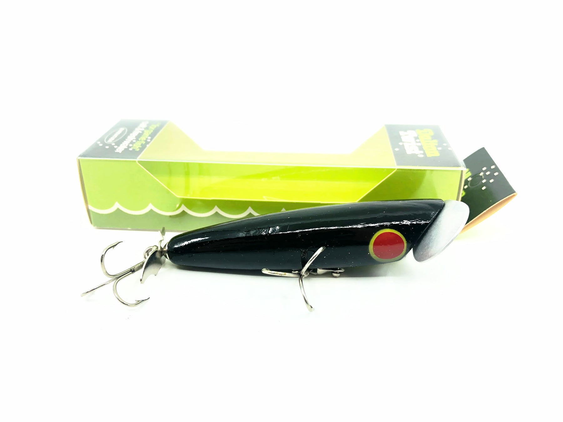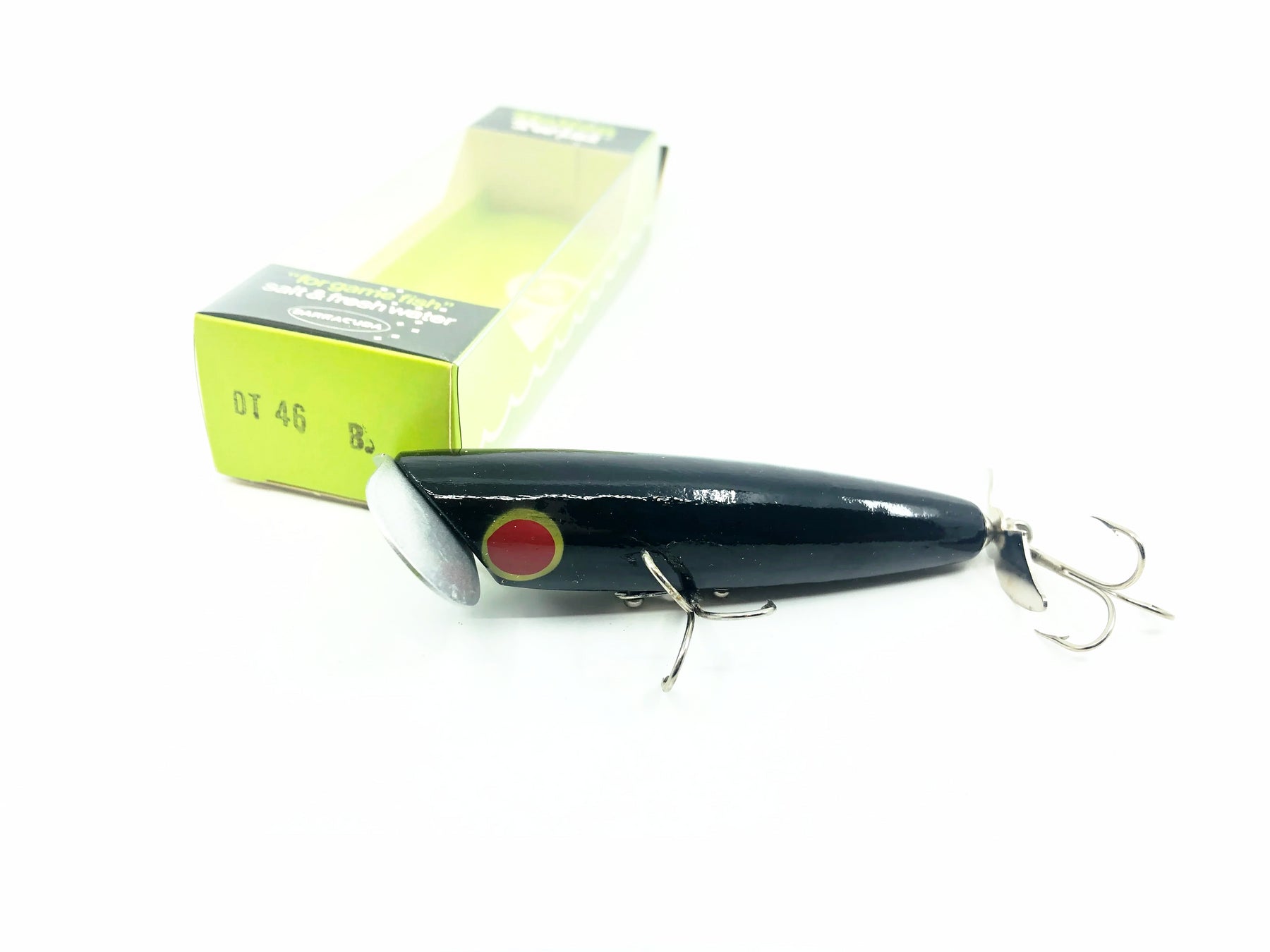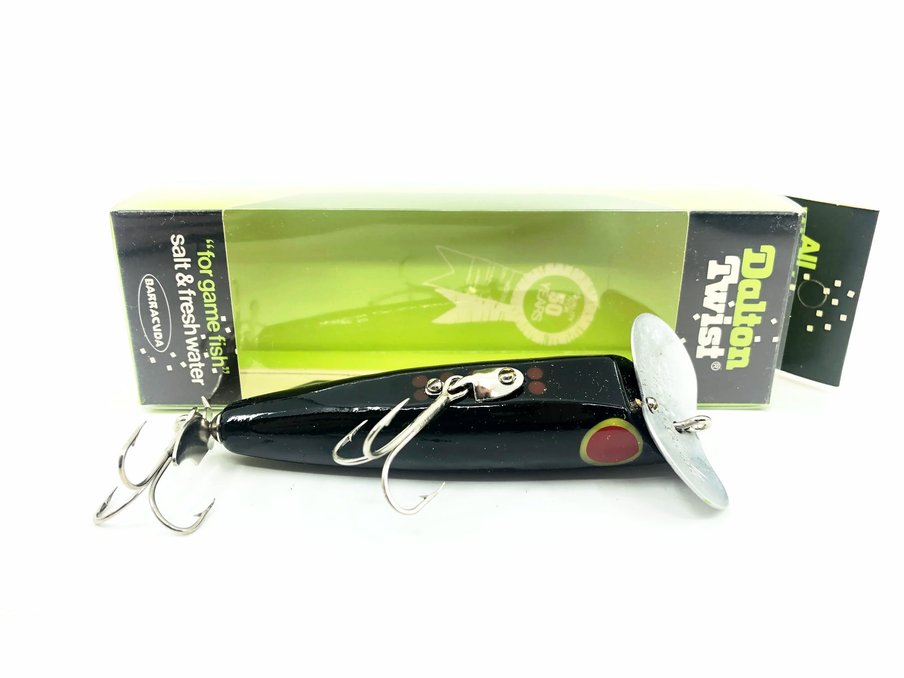 Barracuda Florida Fishing Tackle Mfg. Co. Dalton Twist 46, B Black Color w/Box. About 3 5/8" long body. This bait is in new like condition and the box is in good condition as well. Popular lure among both fishermen and collectors. See photos.