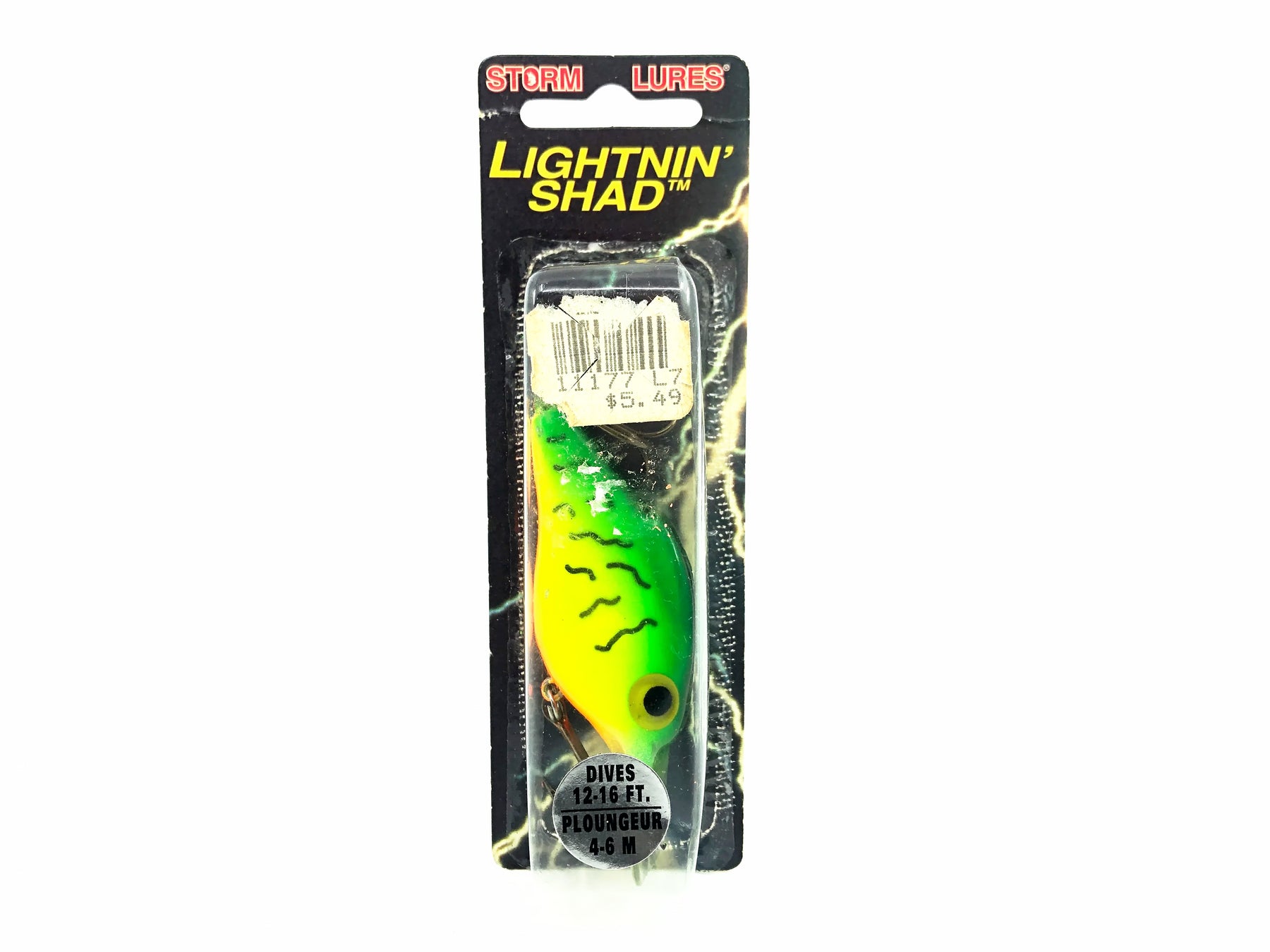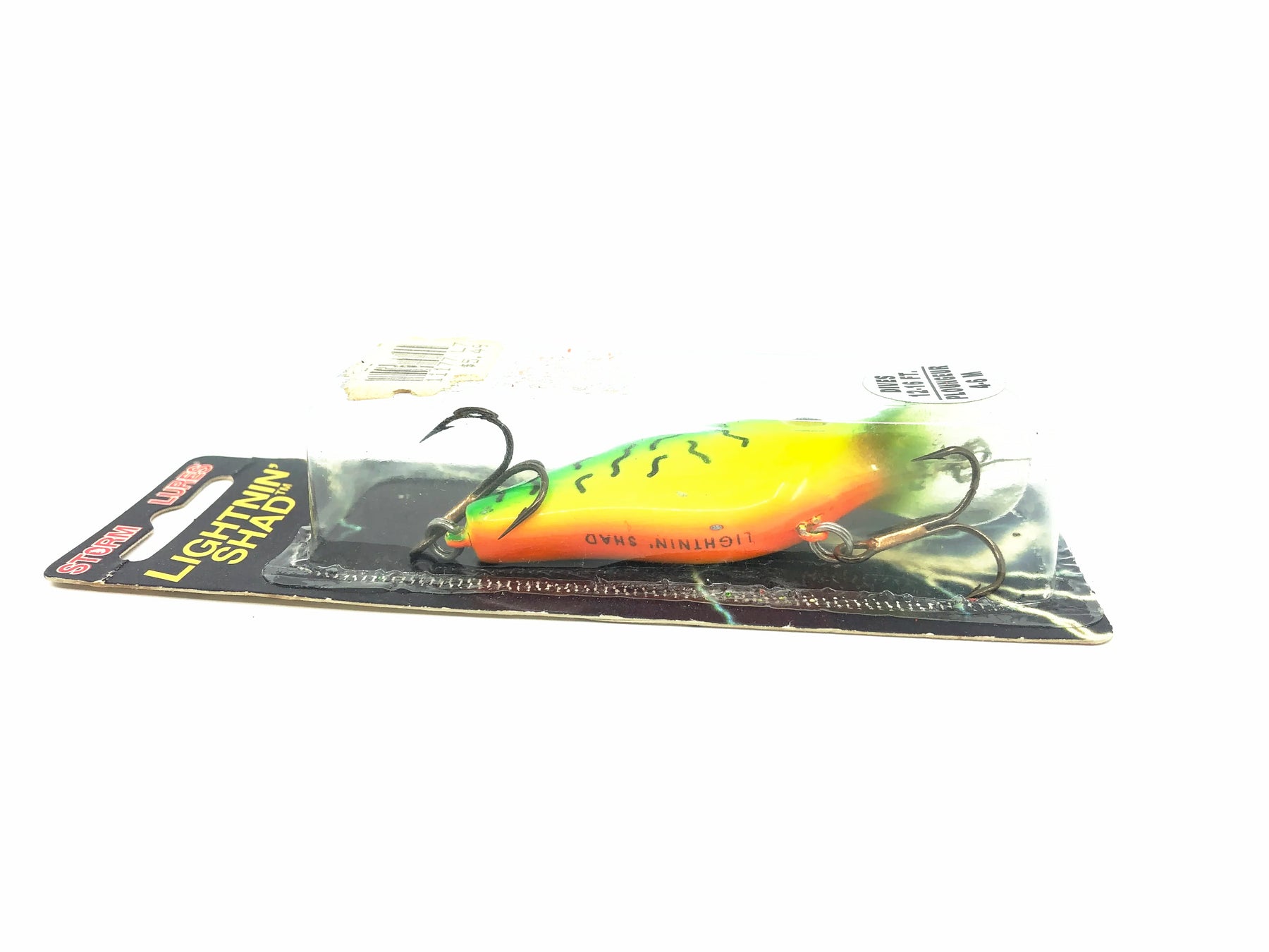 Storm Shallow Lightnin' Shad AL74, Fire Tiger Color on Card. About 2 1/2" body excluding lip.  Lure is new on card and the card is in good condition with some minor wear, see photos.  Fish or collect a great Storm bait.