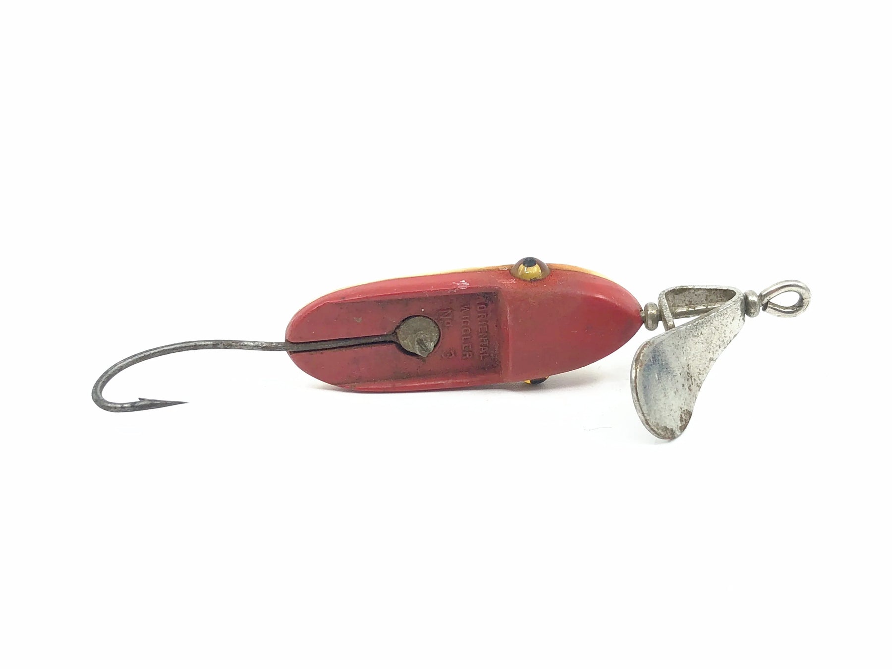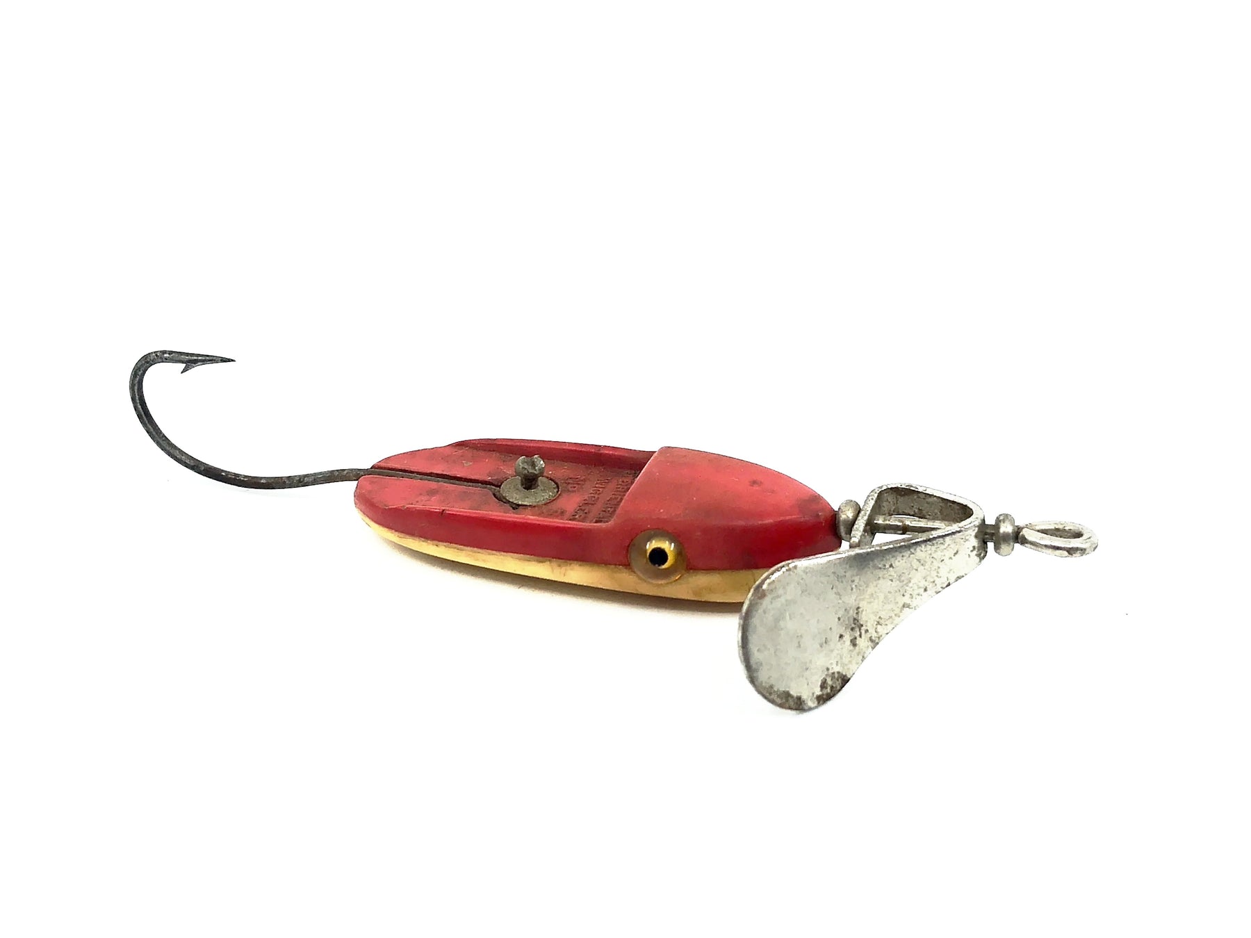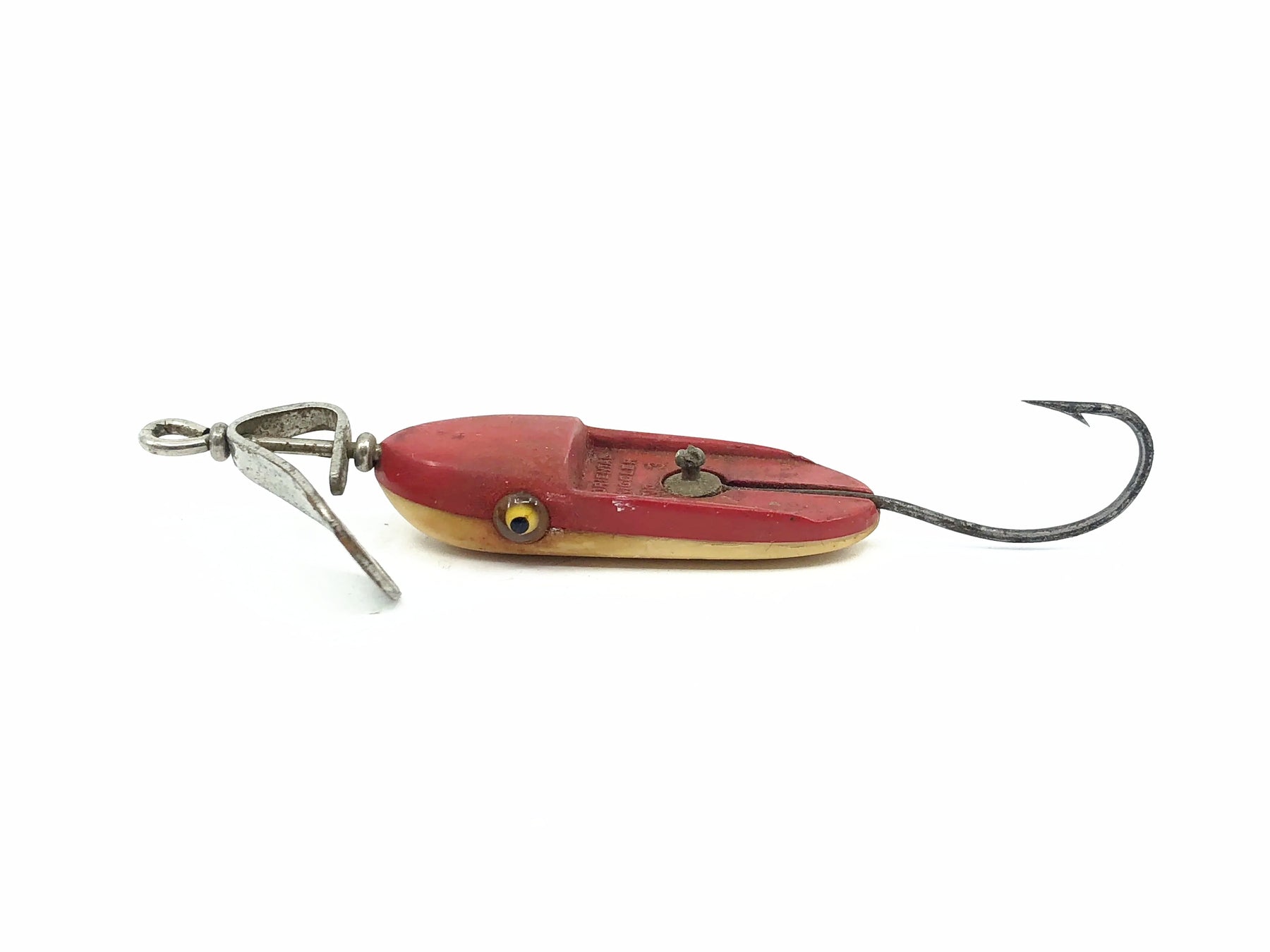 Al Foss Oriental Wiggler No.3, Red/White Color. Great deal here. This smaller sized Pork Rind is about 3 3/4" long overall including the hook. Lure is used but in good condition aside from some minor wear and fading. Fish or collect, see photos. Glass eyes.