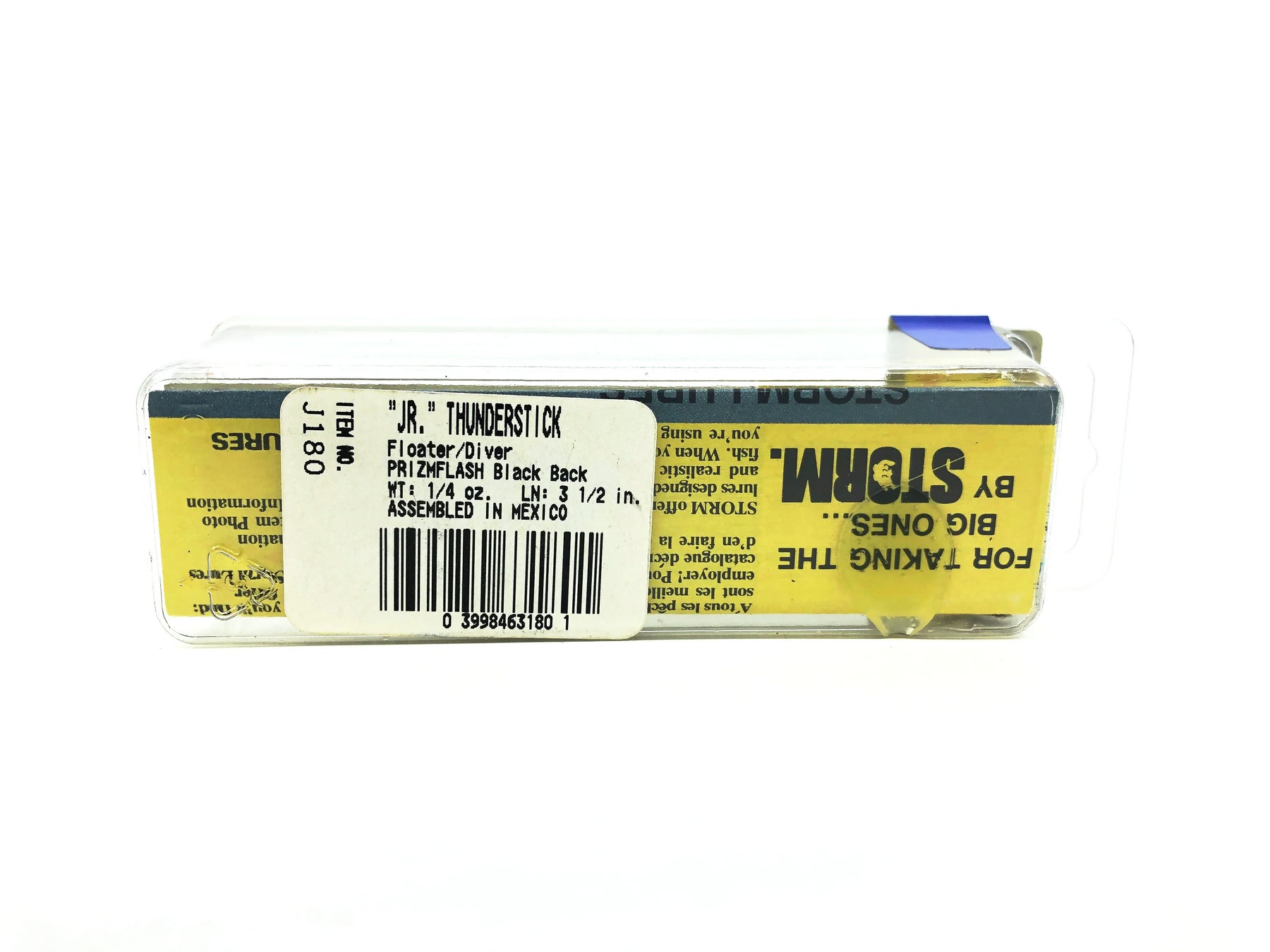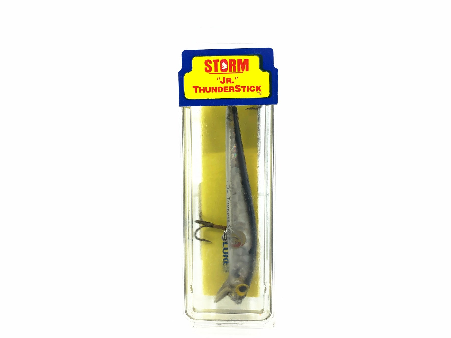 Storm Jr Thunder Stick J180 Prizm Flash Black Back Color w/Box. Great pre-Rapala lure here. About 3 1/2" long. This bait is new in the package and the box is in overall good condition. This lure would look great in your collection or tackle box. See photos.