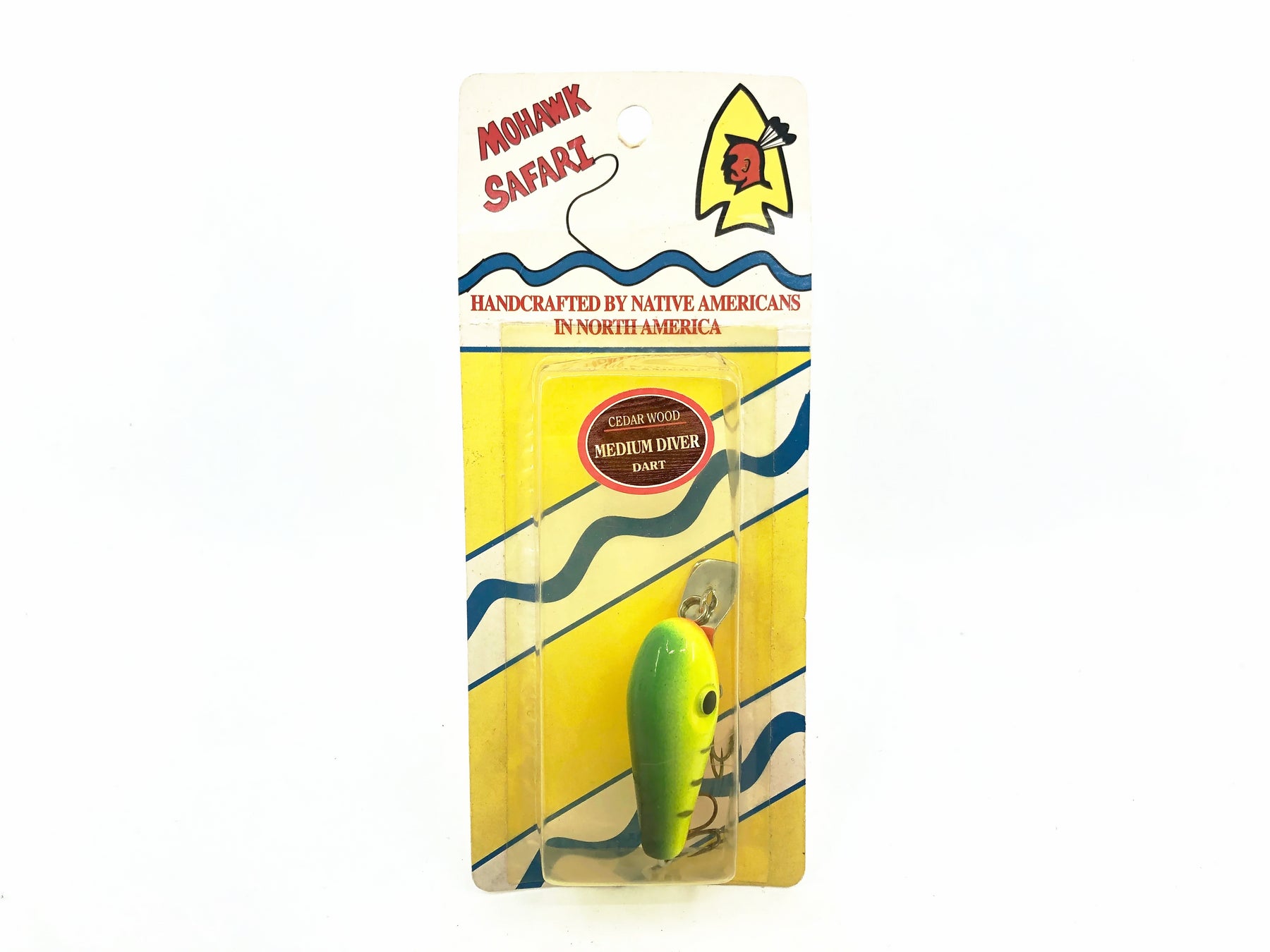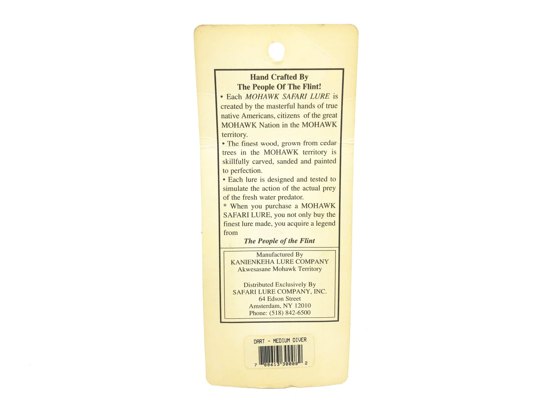 Mohawk Safari Medium Diver Dart, Fire Tiger Color on Card. Very unique wooden bait made by the Kanienkeha lure company. This lure is about 2 1/8" long not including the lip. Lure is new on card and the card is in good condition aside from some uv staining and minor wear. Fish or collect.