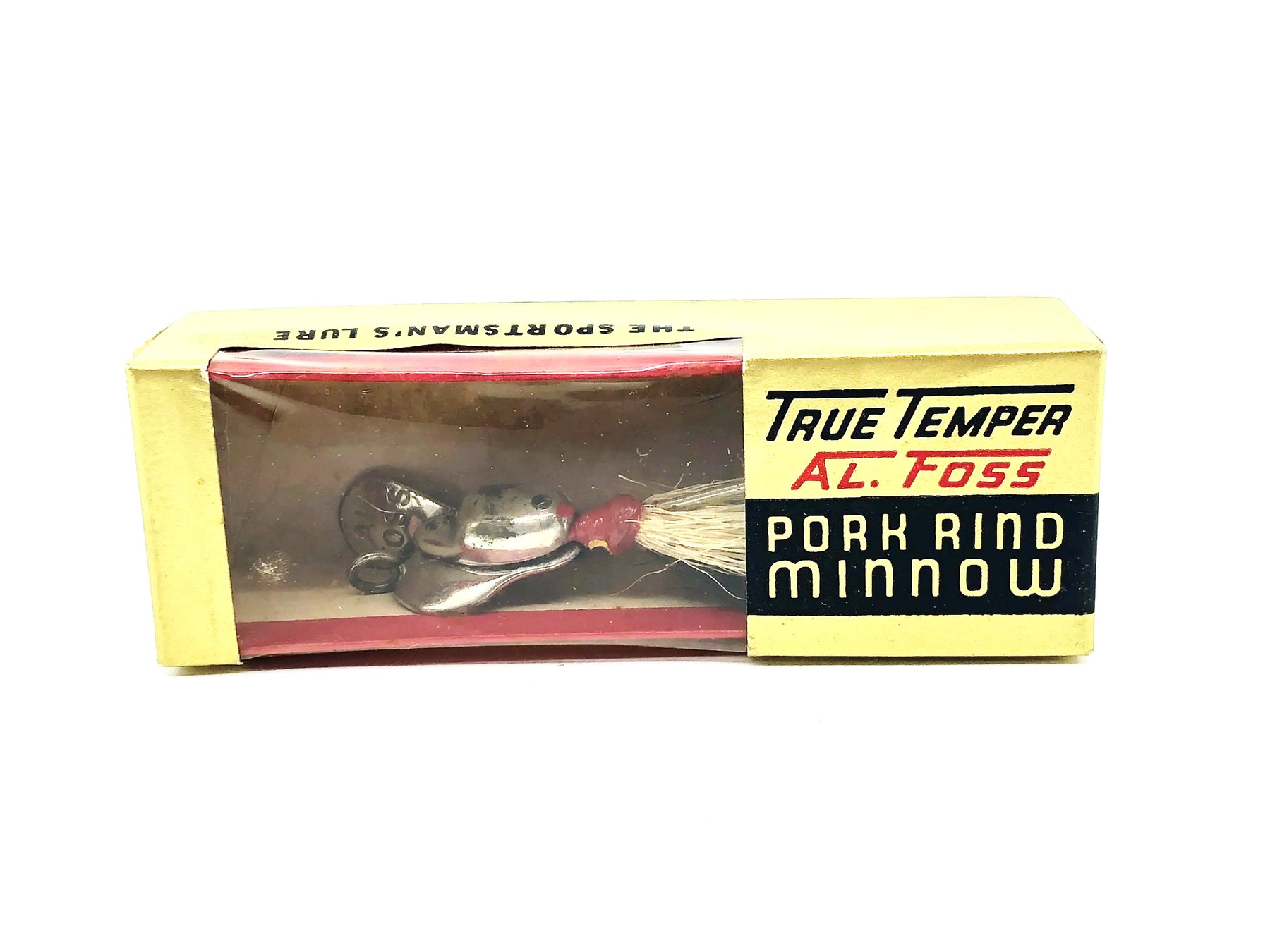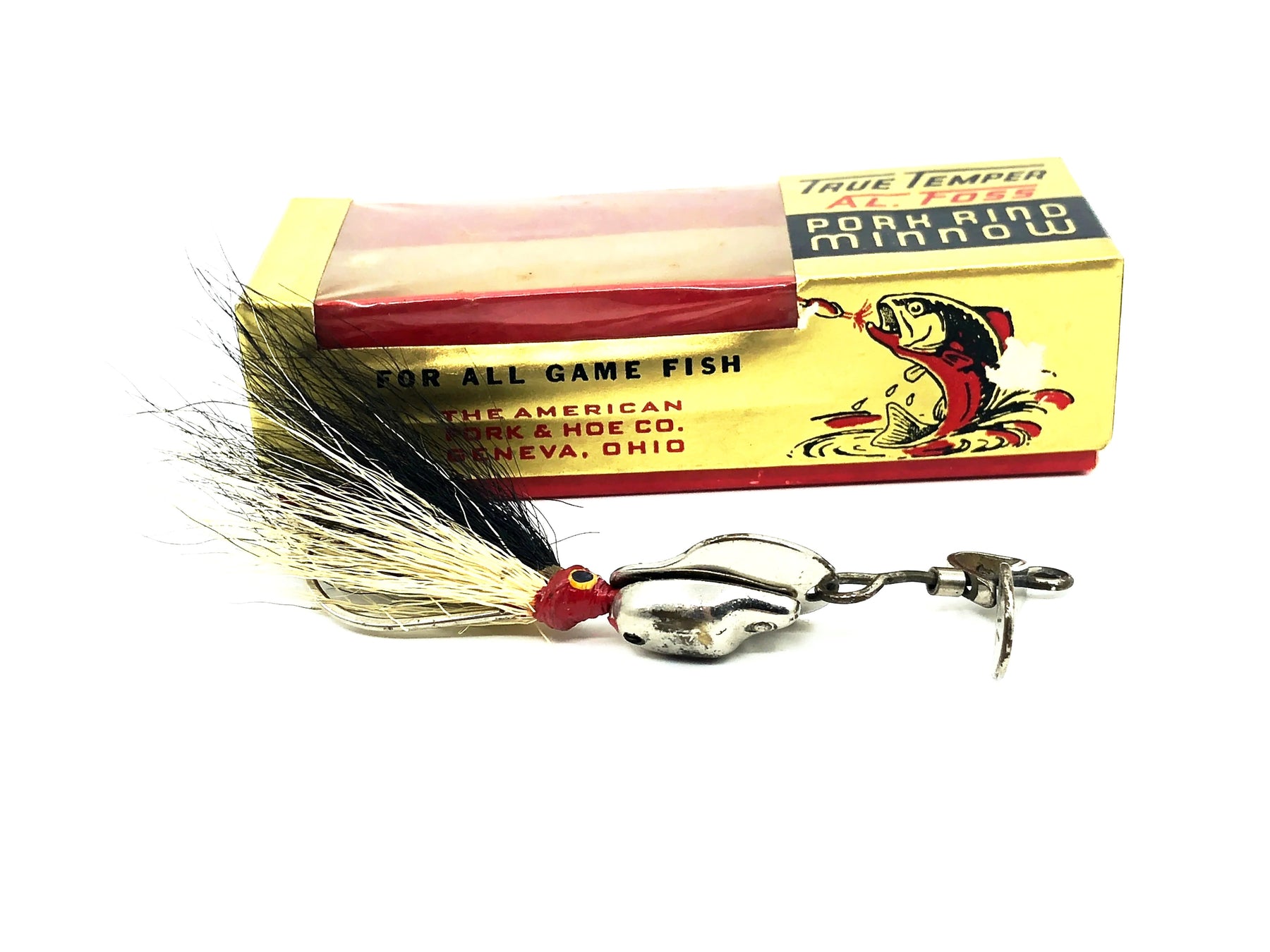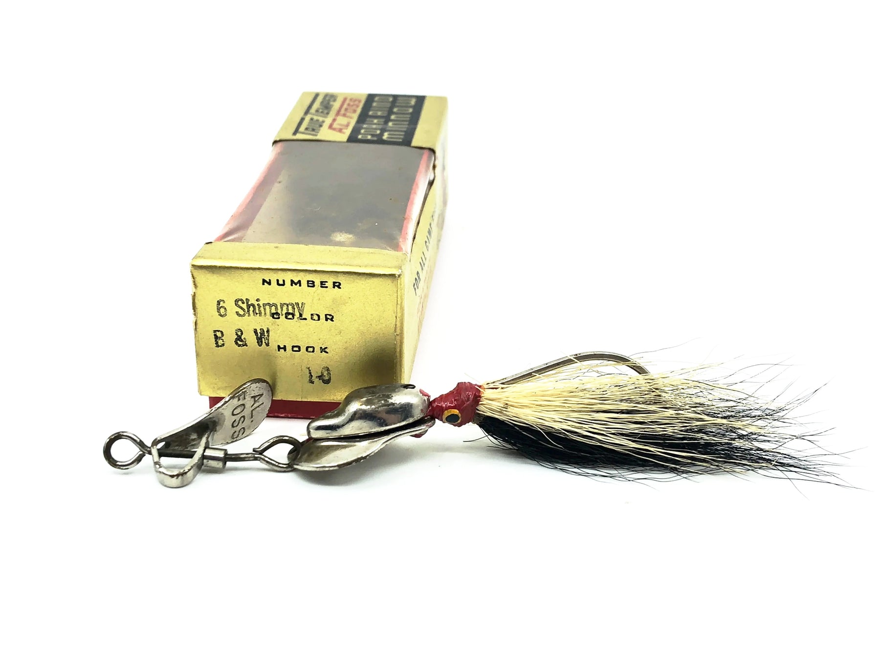 True Temper Al Foss Shimmy No.6, Black & White Color w/Box. Great deal here and a very tough box. Lure is about 3 1/2" long from hook to line tie. Lure is new in box with some minor wear from storage, but in overall great condition. Box is in great condition as well, with even the window intact. Fish or collect, see photos.