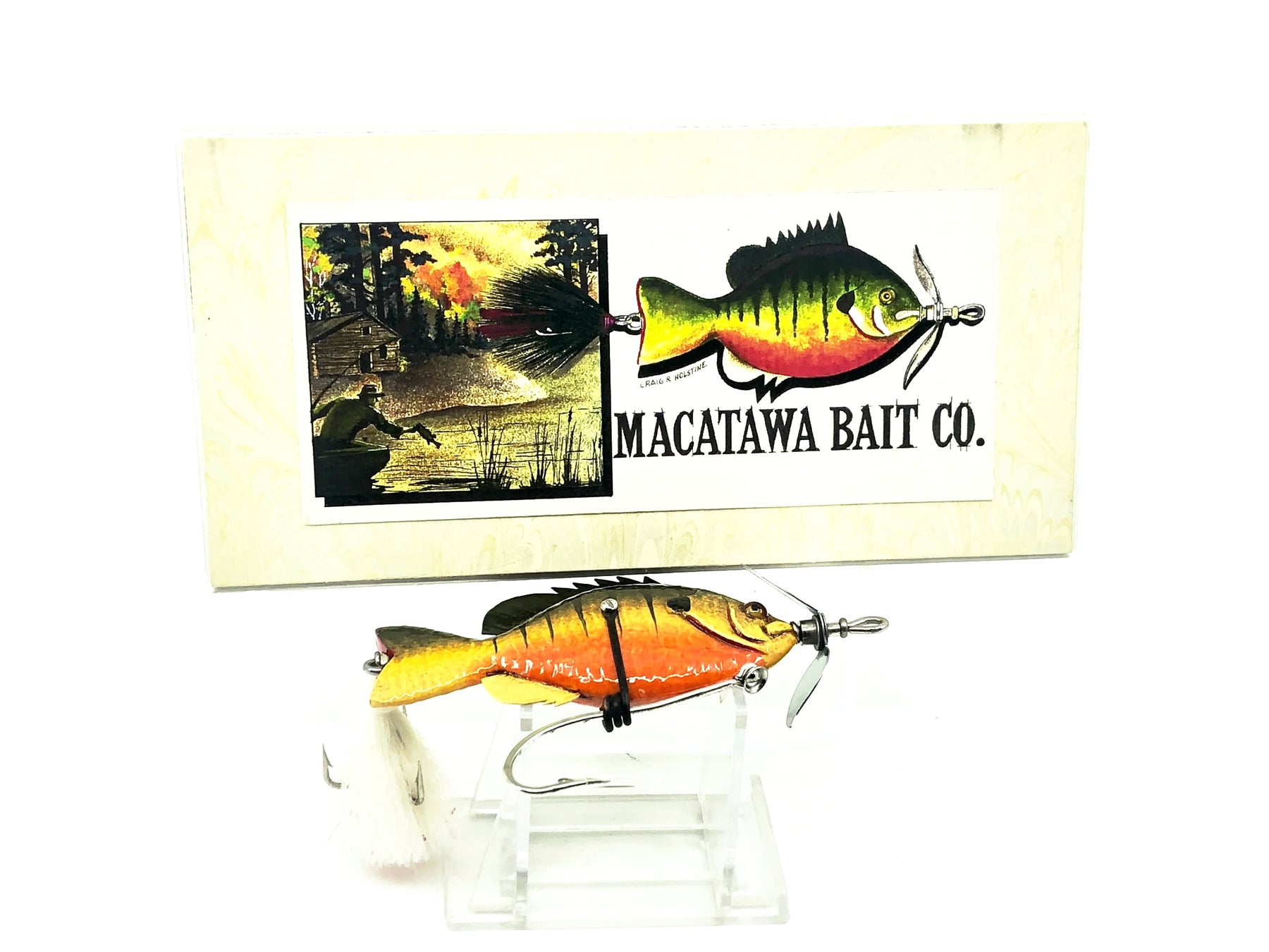 Macatawa Bait Co. Pumpkinseed w/Box. Classic Macatawa bait here straight from the old Macatawa order sheet.  About 3" long body not including the hardware. Wooden lure, glass eyes.  Lure is in great condition.  Box in great condition with a little storage wear.  See photos.