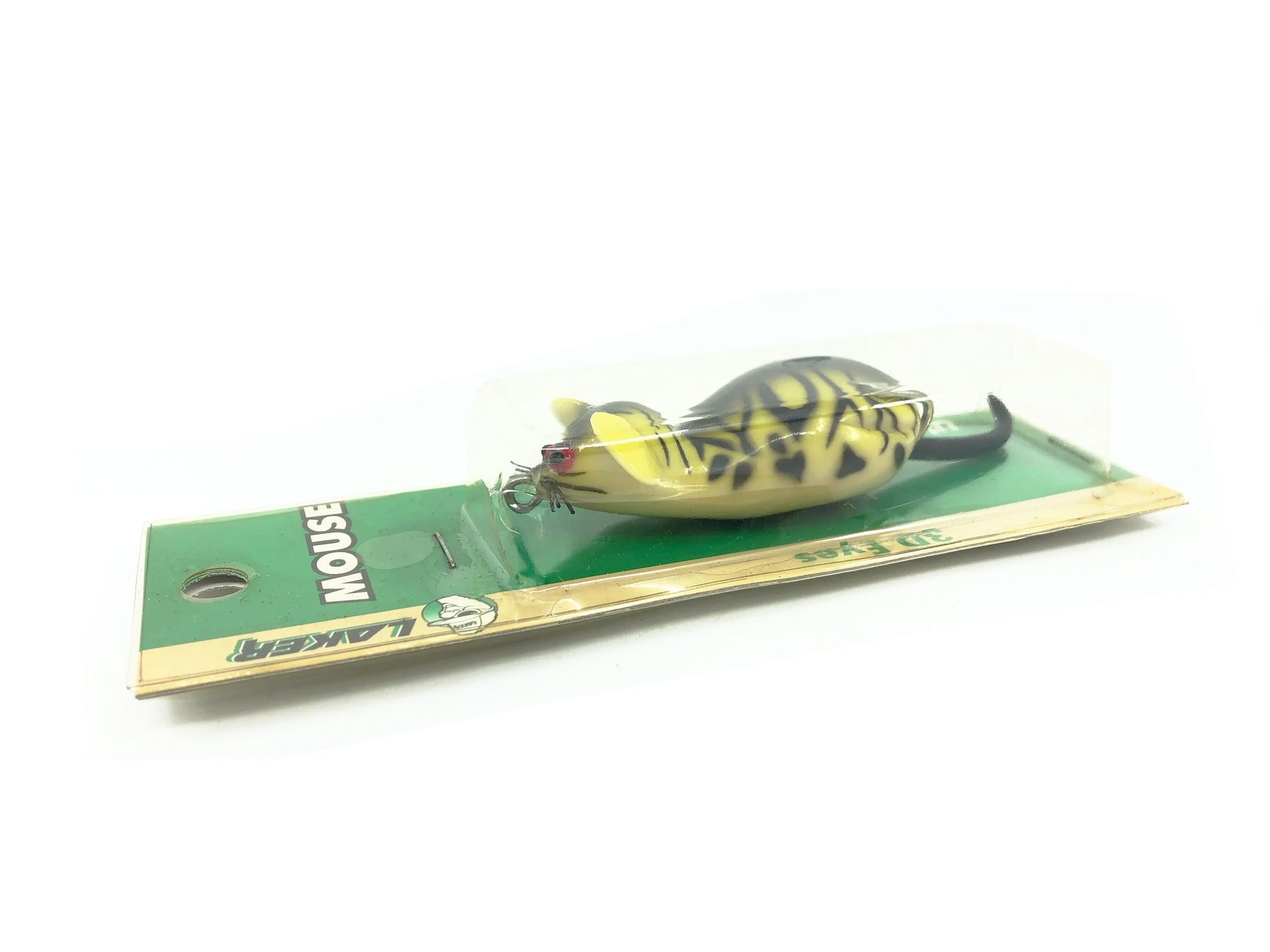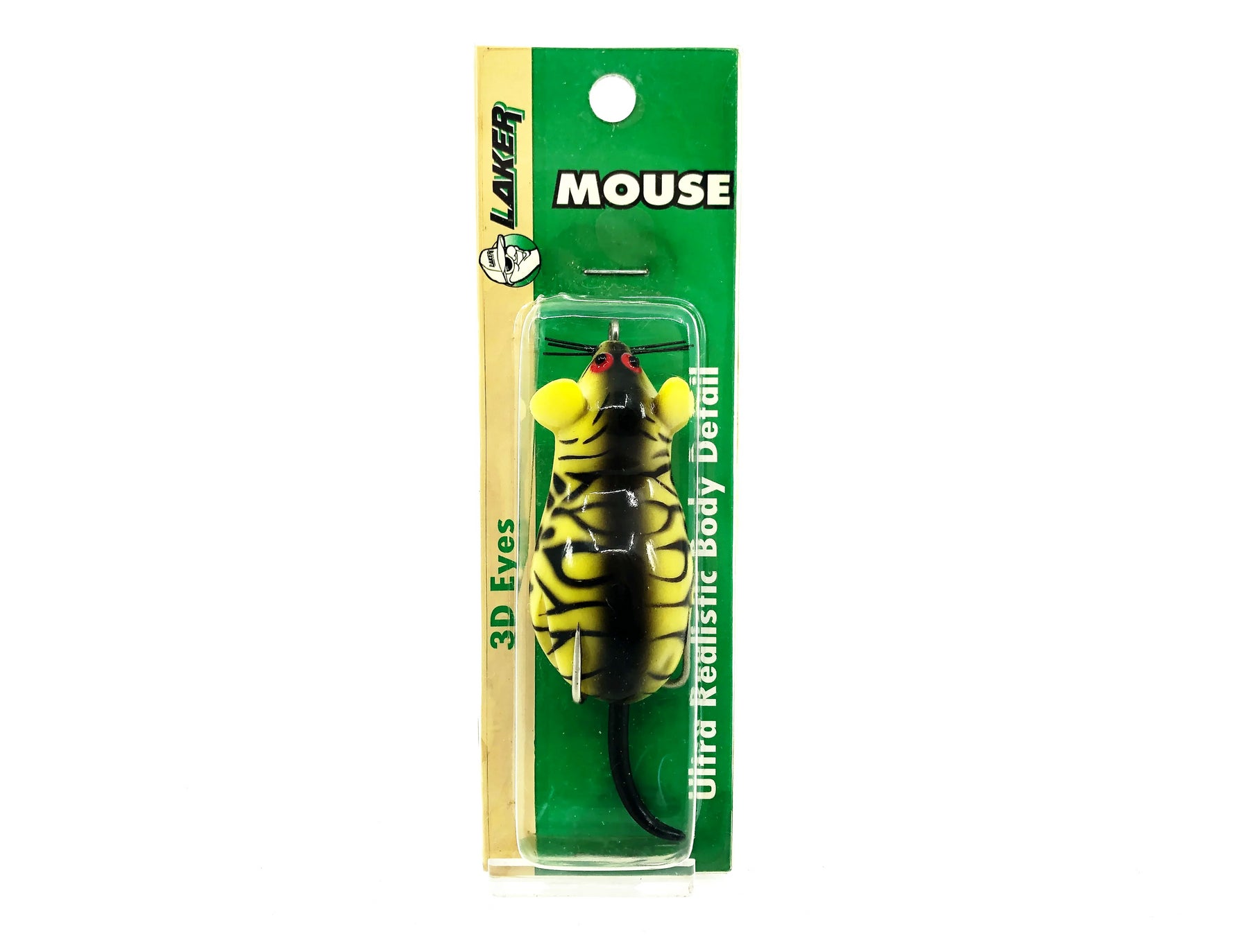 Laker Mouse Yellow Tiger Color on Card. Realistic popping mouse here. This bait's body is about 2 1/2" long. Lure is new on card and the card is in good condition. Fish or collect, see photos.