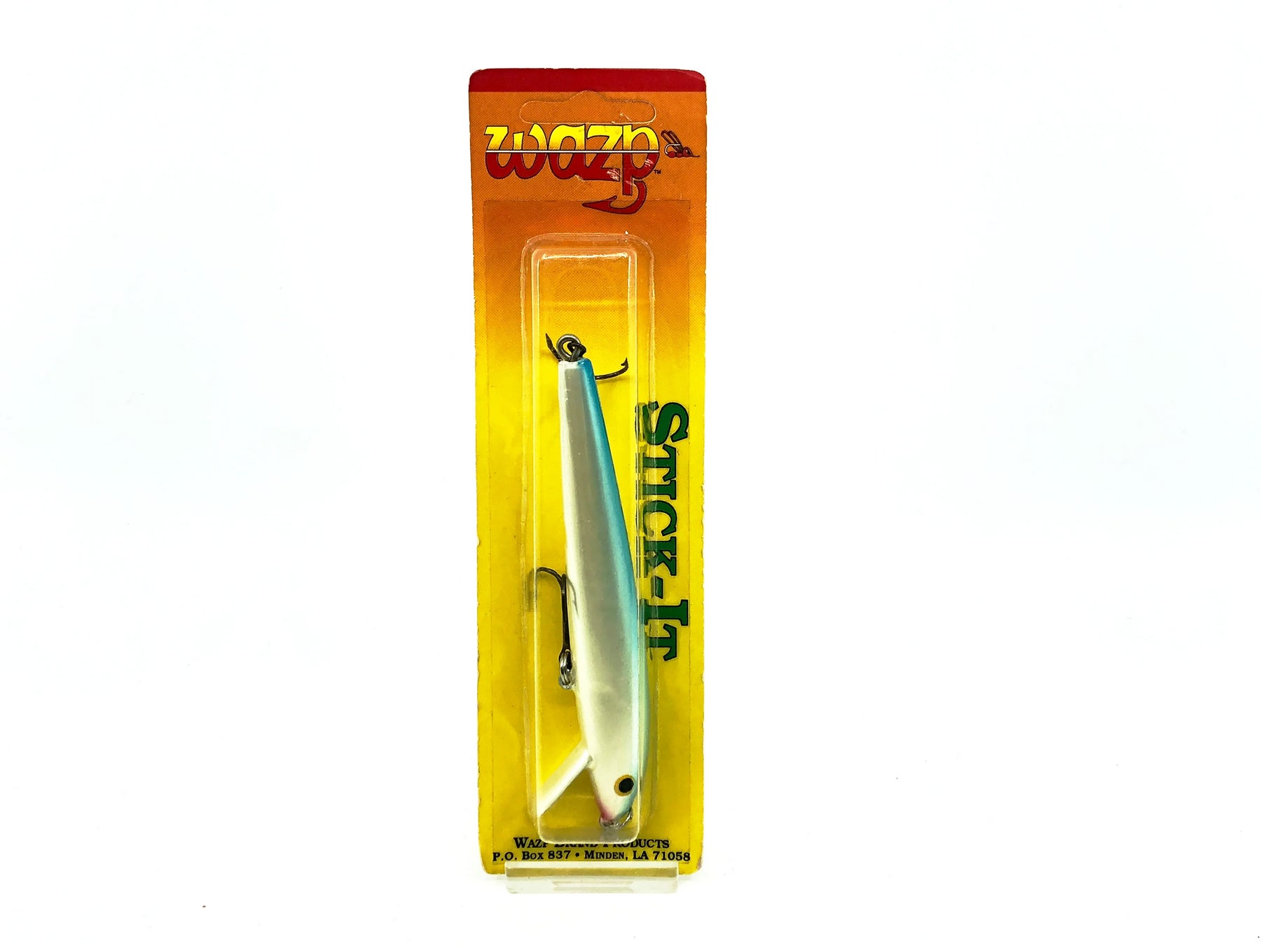 Wazp Stick-It, Pearl/Blue Back Color on Card. Unique new old stock. This bait is about 4" long. Lure is new on card and the card is in good condition. Fish or collect, see photos.