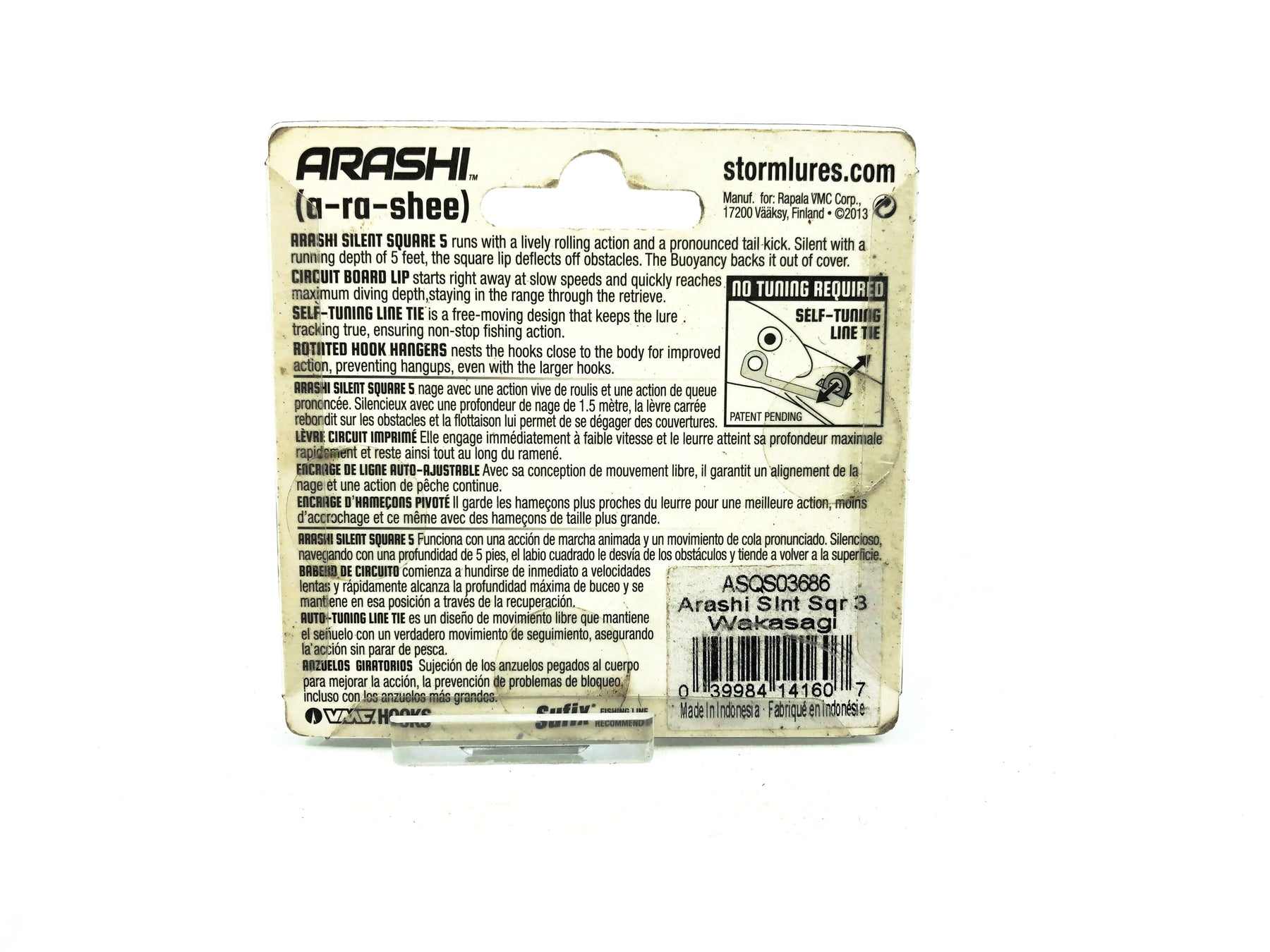 Storm Arashi Silent Square 5 Wakasagi Color. Great bait here that's sold out in most places. Packaging is in great condition, lure is new on card. See photos. About 2 3/4" long including lip. Perfect for any fishermen.