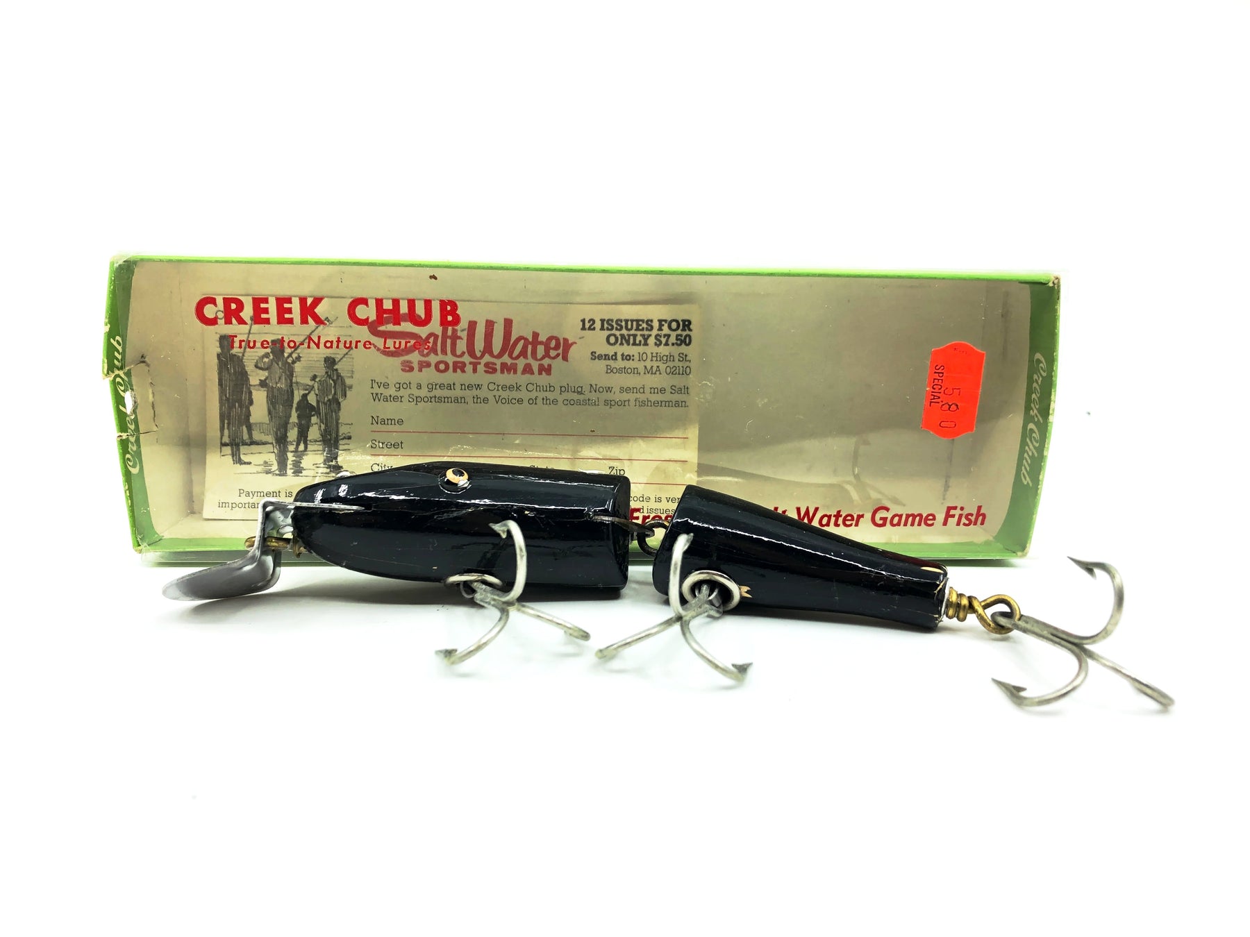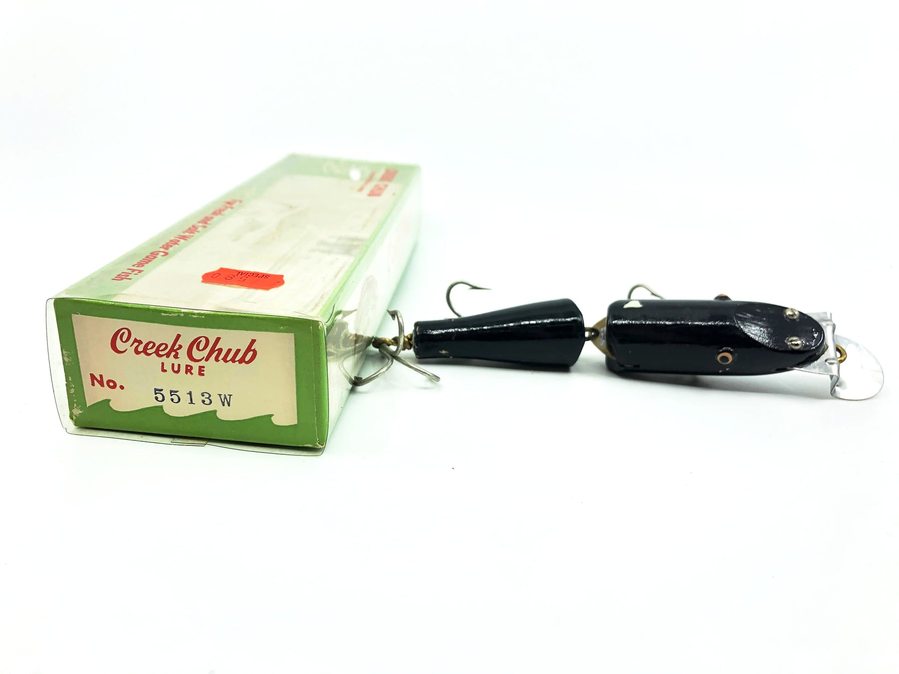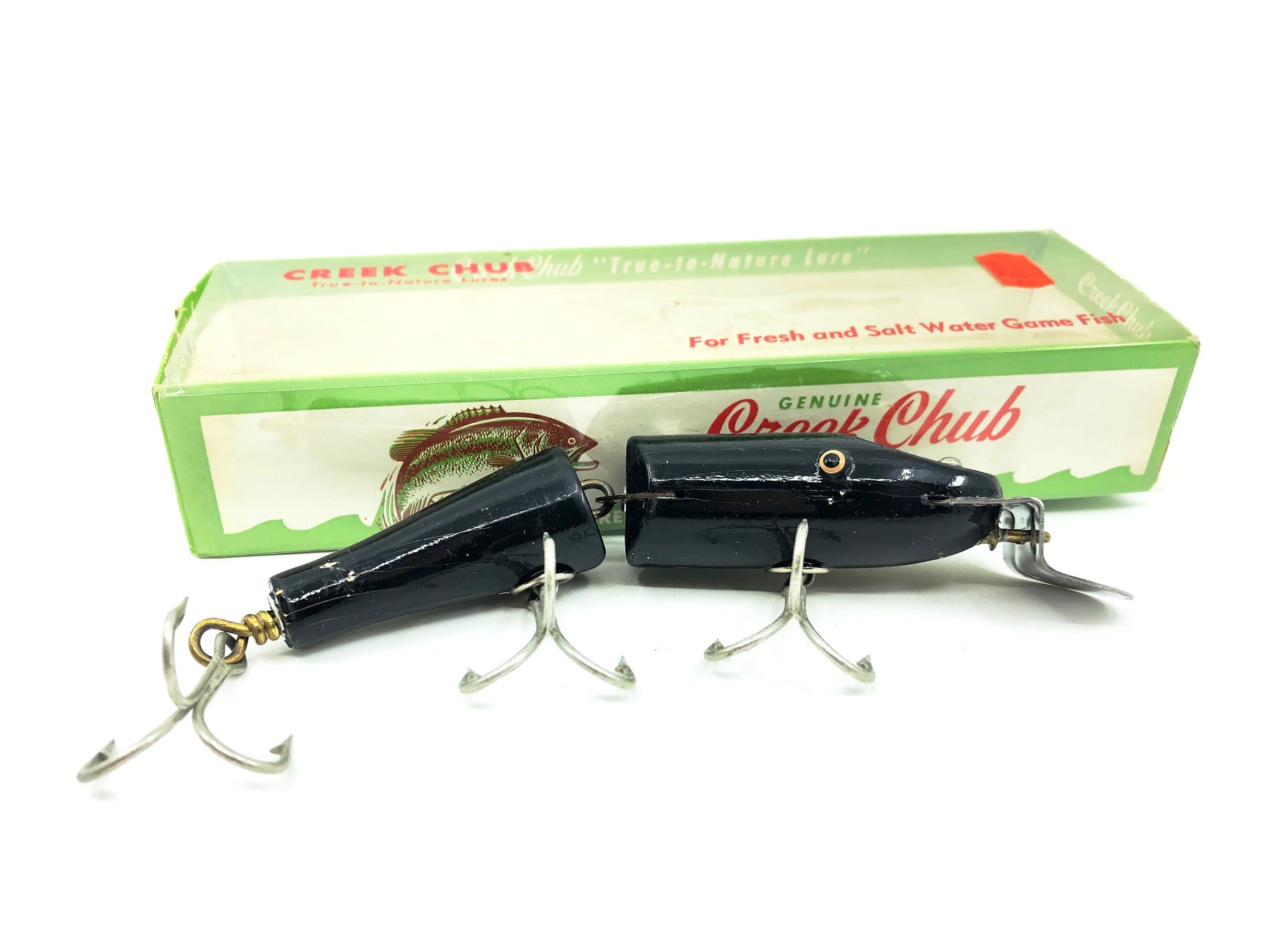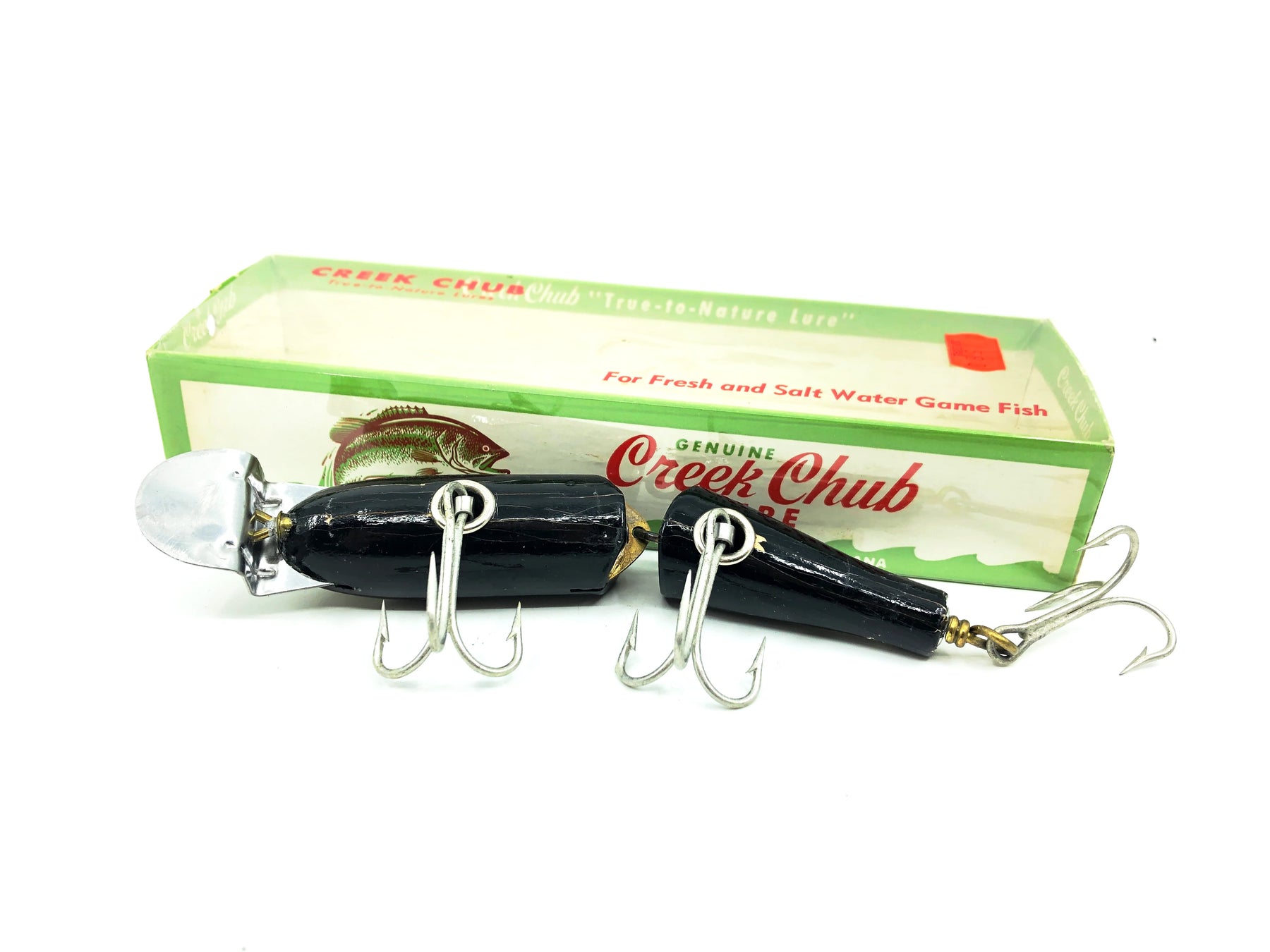 Creek Chub Jointed Snook Pikie 5500, Black Color 5513W with Box. Matching box on this rarer Creek Chub. About 5" long not including the lip. Great vintage lure here. Wooden lure, tack eyes. Box has some minor wear but in overall good condition. Lure is in good condition with some minor wear as shown (note: mark on top was a piece of masking tape I pulled off after photo, it was fine under tape). Nice combo. This one won't last long so grab it for your collection while you can. See photos.