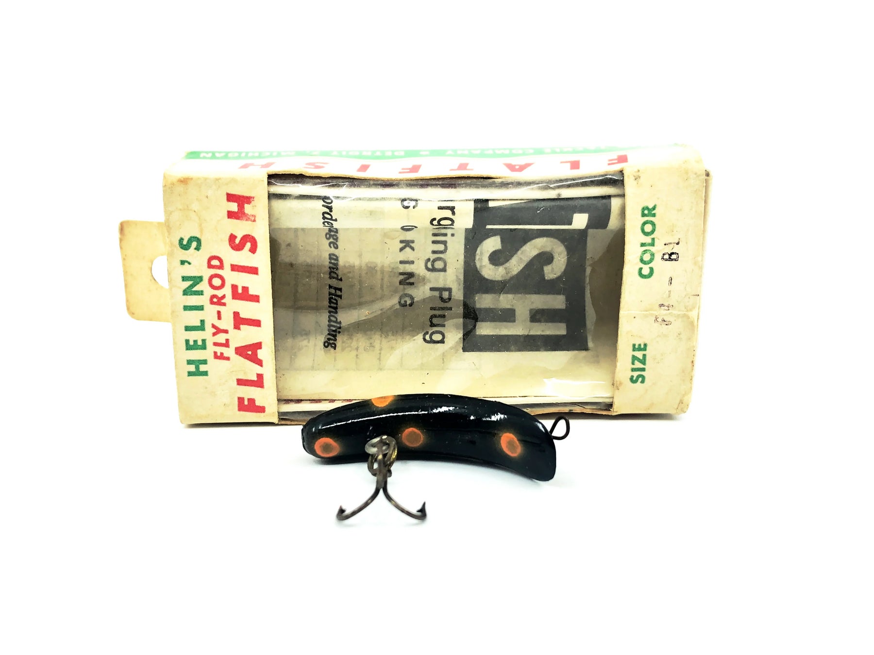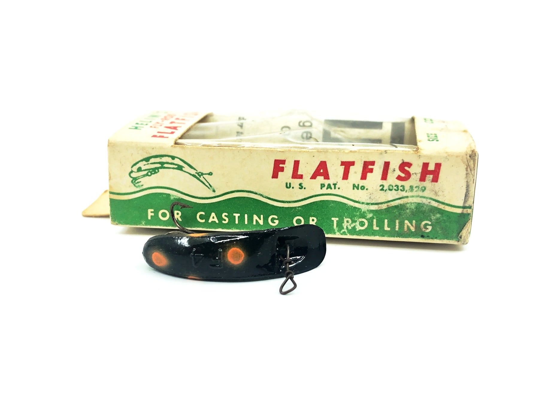 Helin Flatfish F4, BL Black/Orange Spots Color in Box. Box includes paperwork.  Box in good condition with some wear and dirt on it.  Lure in nice condition. About 1 1/2" long. See photos.  Grab this great vintage lure and fish or collect!