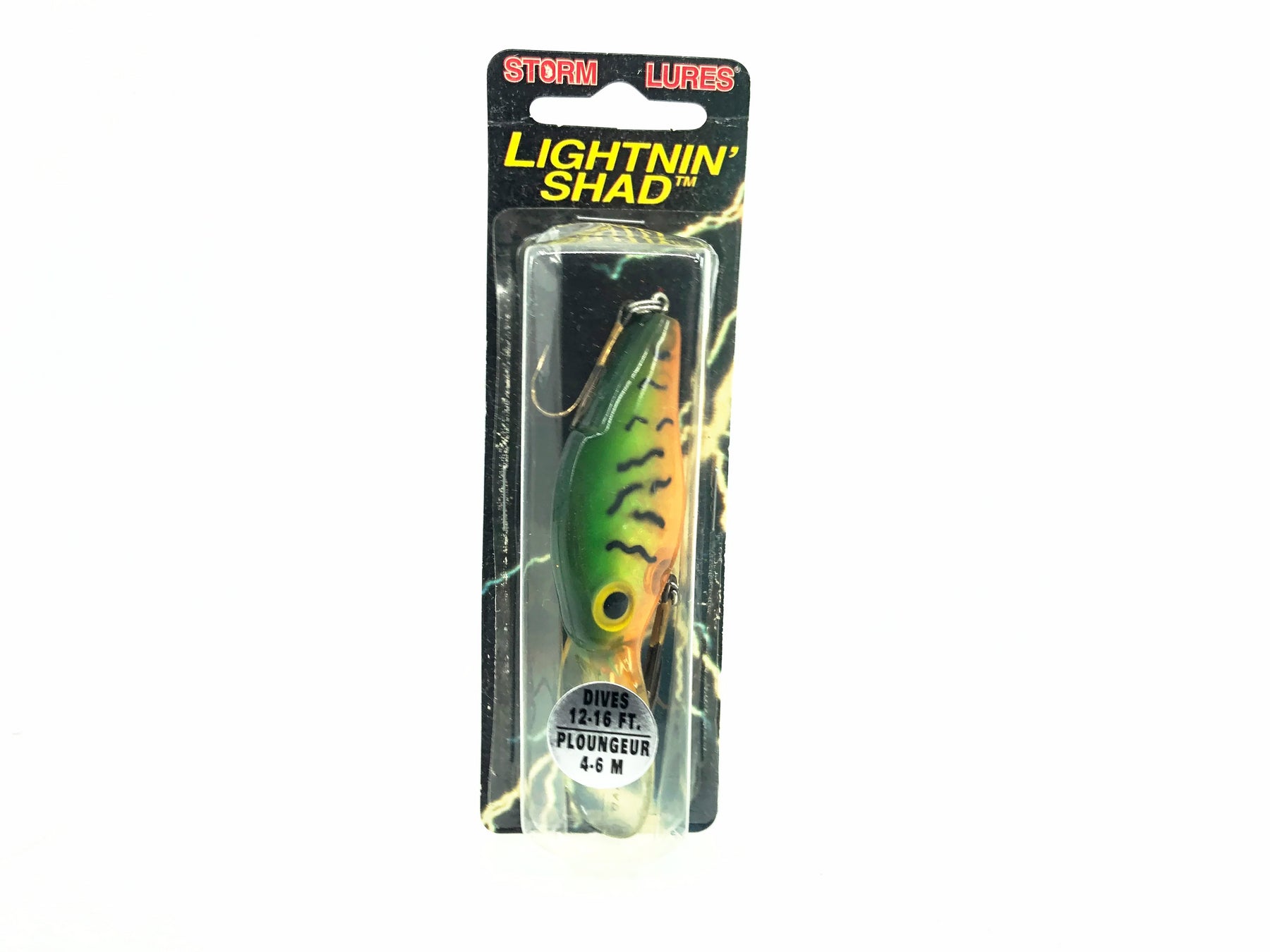 Storm Deep Lightnin' Shad DAL224, Prizm Fire Tiger Color on Card. About 2 1/2" body excluding lip.  Lure is new on card and the card is in good condition aside from the bubble being stapled on, see photos.  Fish or collect a great Storm bait.