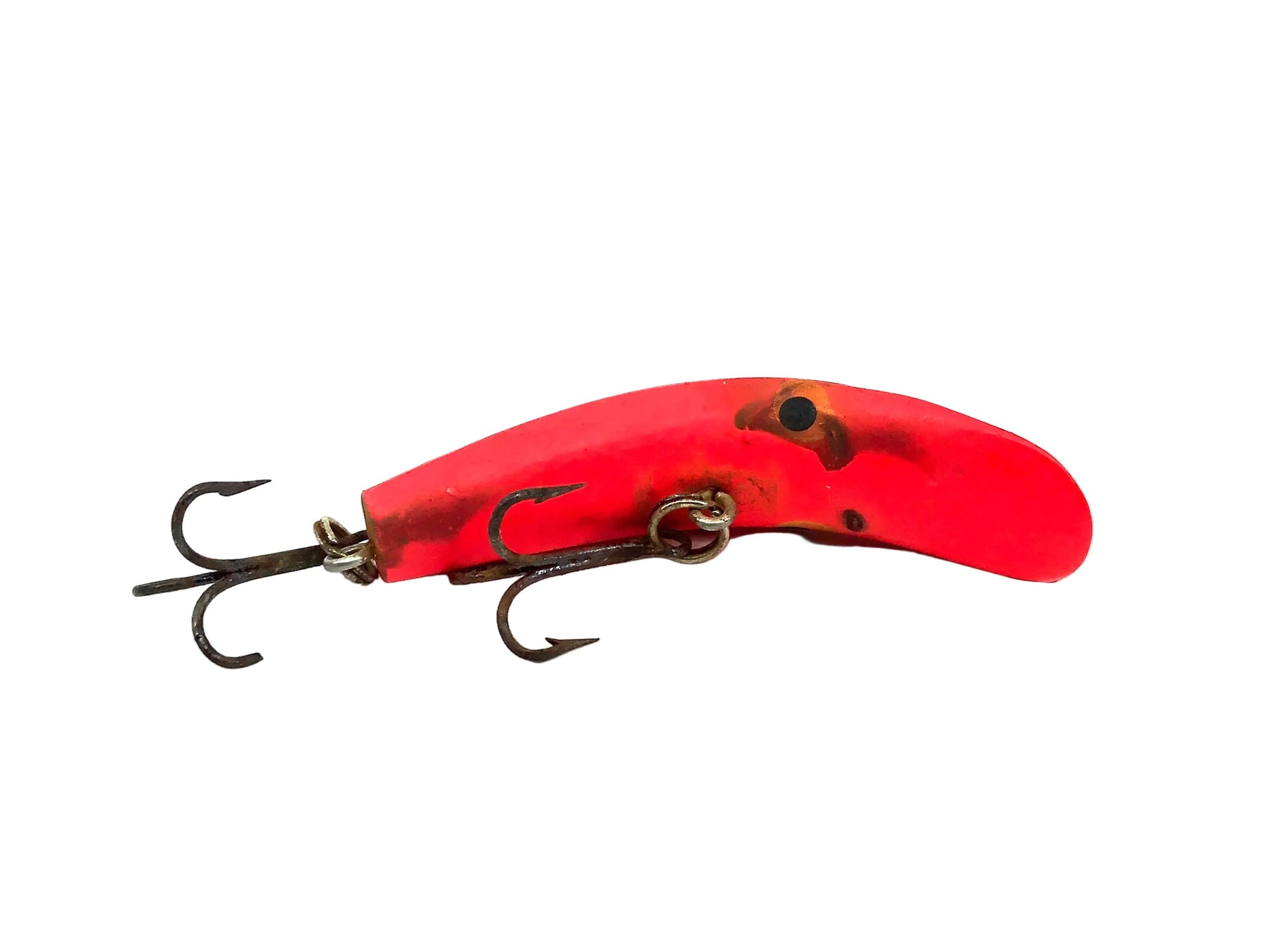 Helin Flatfish X5, RFL Red Fluorescent Color. About 2 3/4" long. Used with some wear and marks but overall in fair condition, see photos. One of the most successful fishing lures ever made. Fish or collect! Vintage plastic version.