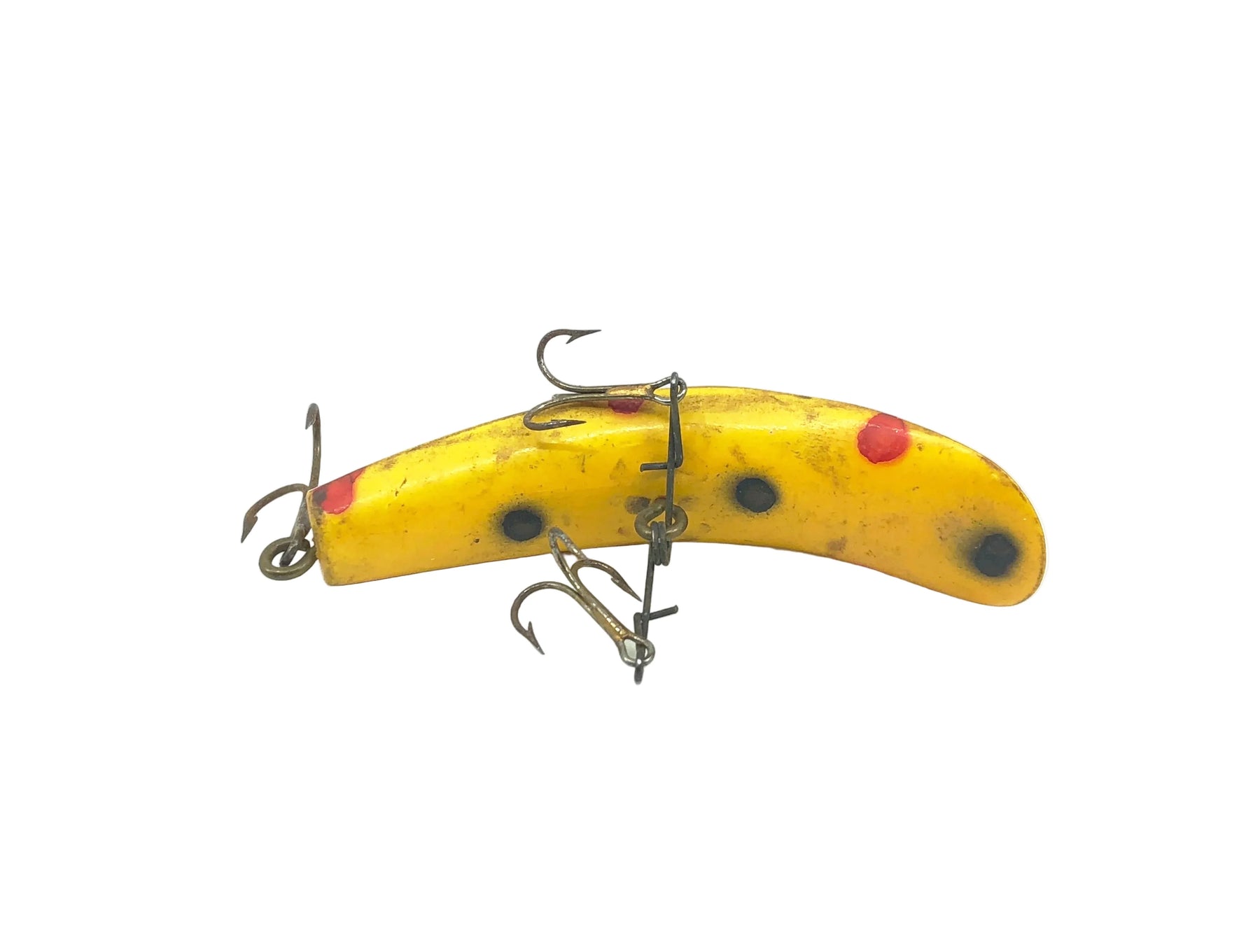 Helin Flatfish X5, YE Yellow/Dots Color. About 2 3/4" long. Used with some wear and large marks but overall in fair condition, see photos. One of the most successful fishing lures ever made. Fish or collect! Vintage plastic version.