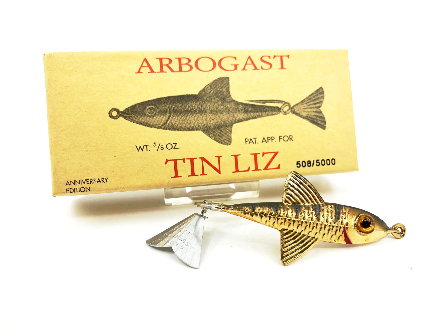 Arbogast Tin Liz Anniversary Edition Lure with Box #508/5000 Perch Color. Great lure here. Add this one to your collection. One of the all time classic lures. Lure, box and paperwork (note slight tear in paperwork) in great shape. Grab this combo while it lasts.